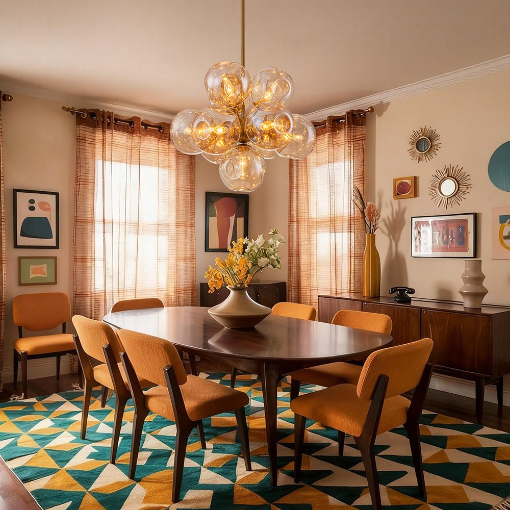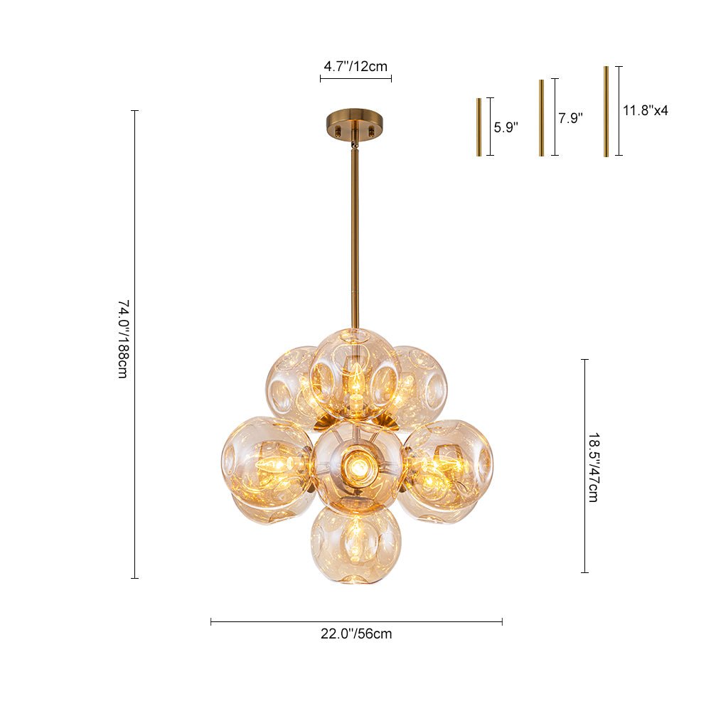 Experience a blend of whimsy and sophistication with this 10-light round cluster chandelier. Anchored by a Sputnik-inspired brass center, the design evokes a playful bubble maker, releasing ten glass spheres that appear to drift effortlessly from each light socket. Each globe features a transparent amber tint that lends vintage chic warmth, while the gently rippled concave-convex surface adds movement, dimension, and sculptural interest, like bubbles rolling through a soft breeze. When illuminated, the amber glass radiates a warm, luminous glow that enriches your space with depth and atmosphere. Perfect for living rooms, dining areas, bathrooms, bedrooms, foyers, entryways, or lobbies, this amber glass bubble chandelier delivers artistic impact and modern charm without overwhelming the room.