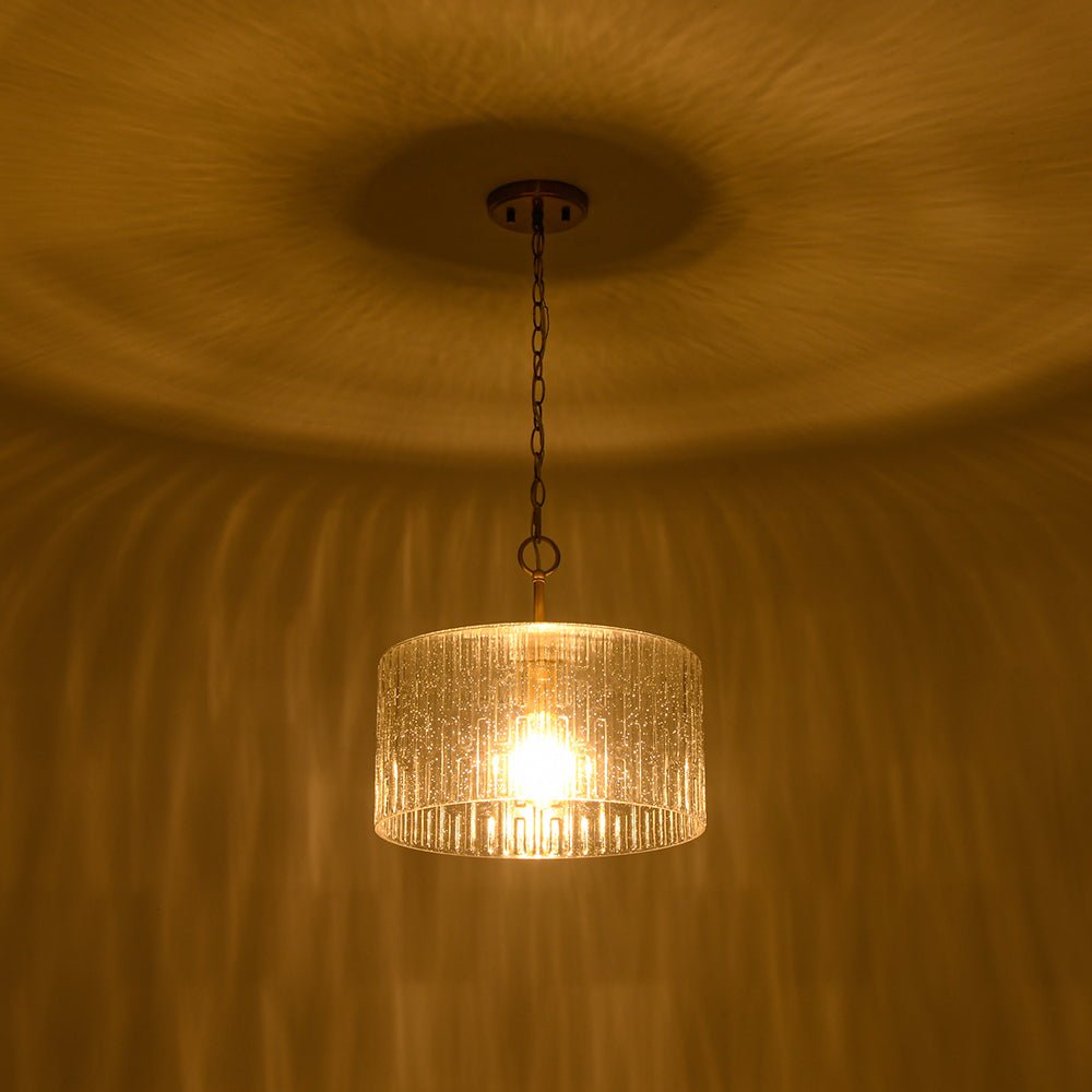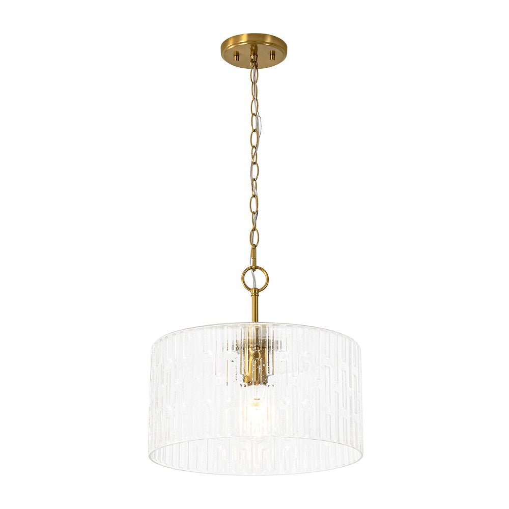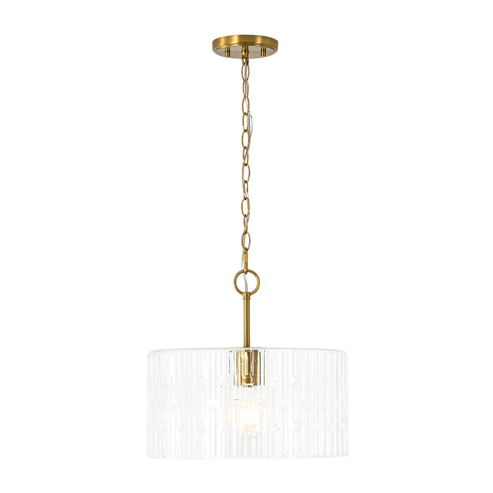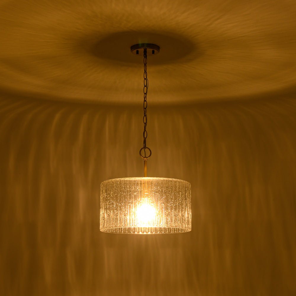 Blending refined detail with versatile design, this textured glass ceiling light offers both pendant and semi-flush installation thanks to its removable hanging chain. A wide clear glass drum shade features an offset striped pattern enriched with delicate seeded bubbles, creating depth and movement within the glass. When illuminated, the bubbles softly refract the light, producing a warm, sparkling glow that feels both lively and soothing. Highlighted with classic warm brass, the 1-light glass drum cage fixture adds a touch of timeless elegance while complementing the artisanal character of the glass. Ideal for kitchens, hallways, bathrooms, or breakfast nooks, this adaptable round glass light suits transitional, modern farmhouse, and mid-century–inspired interiors, delivering focused yet ambient illumination with understated sophistication.