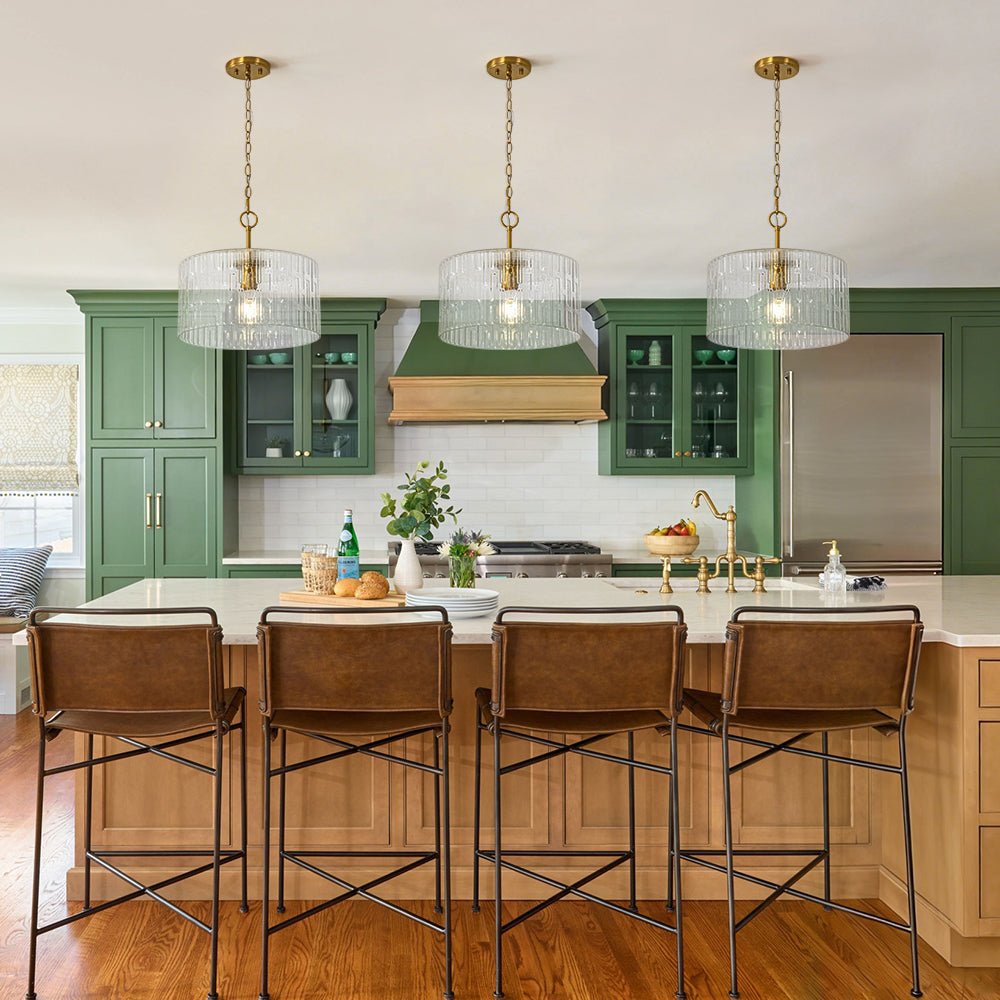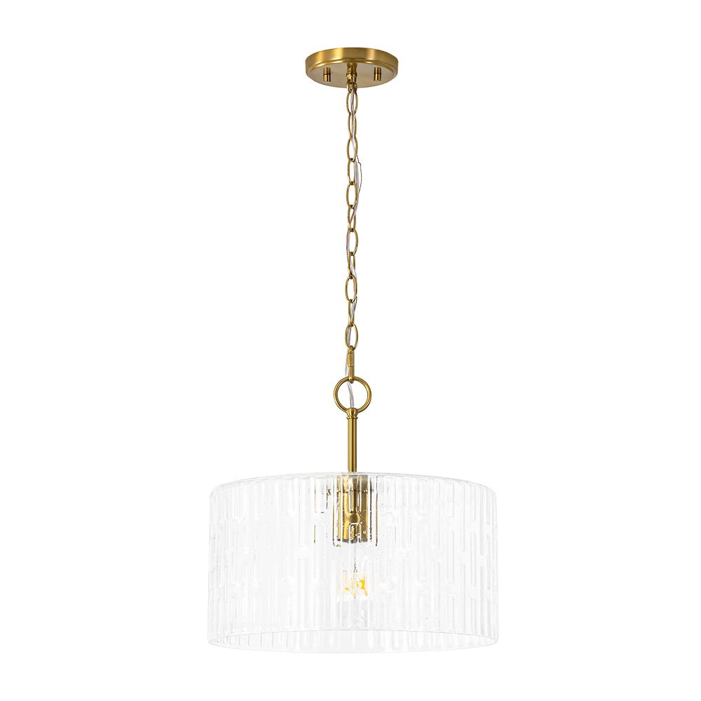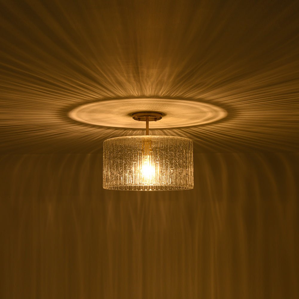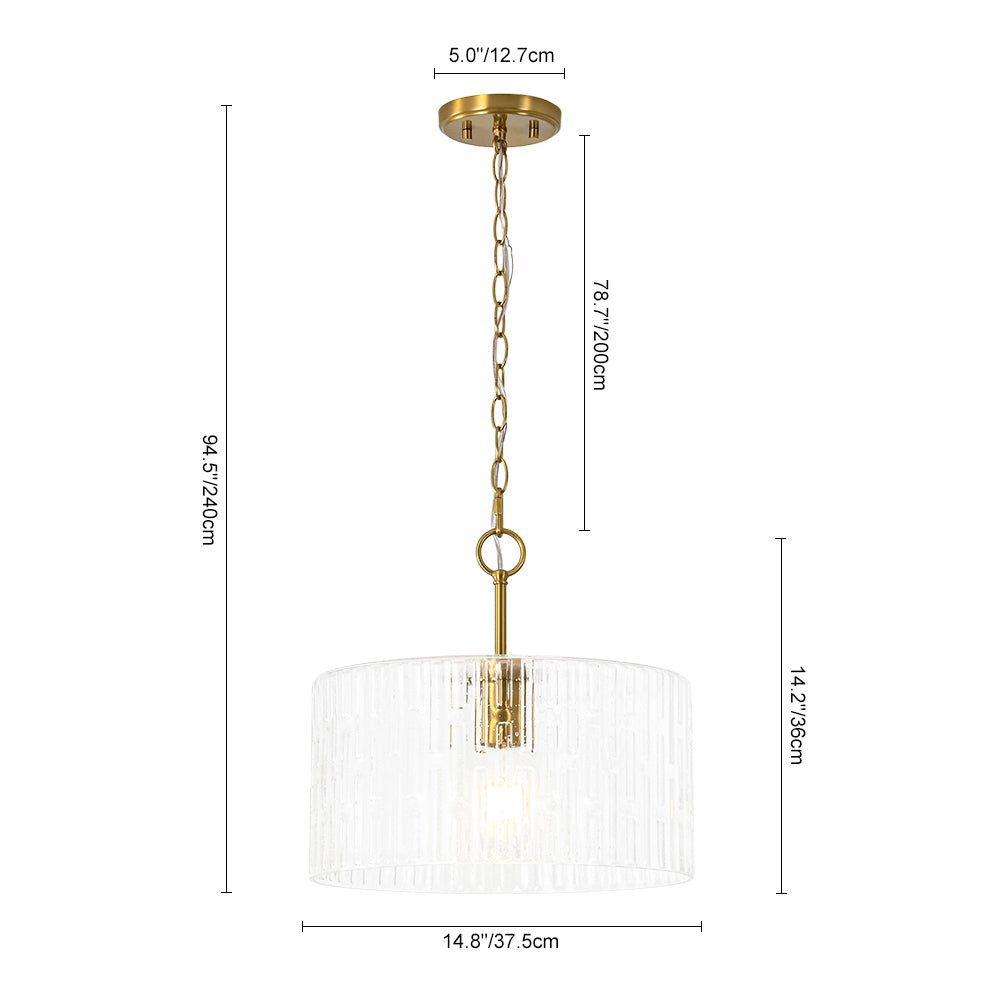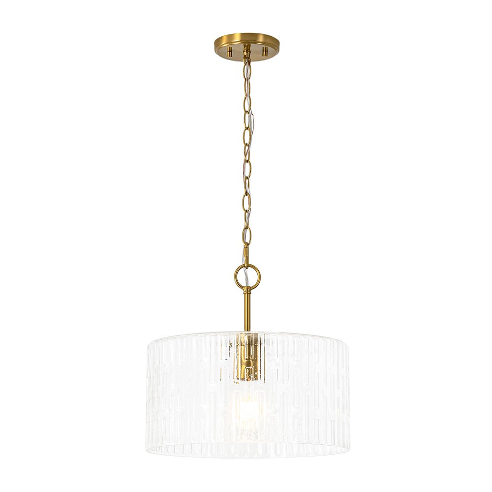 Blending refined detail with versatile design, this textured glass ceiling light offers both pendant and semi-flush installation thanks to its removable hanging chain. A wide clear glass drum shade features an offset striped pattern enriched with delicate seeded bubbles, creating depth and movement within the glass. When illuminated, the bubbles softly refract the light, producing a warm, sparkling glow that feels both lively and soothing. Highlighted with classic warm brass, the 1-light glass drum cage fixture adds a touch of timeless elegance while complementing the artisanal character of the glass. Ideal for kitchens, hallways, bathrooms, or breakfast nooks, this adaptable round glass light suits transitional, modern farmhouse, and mid-century–inspired interiors, delivering focused yet ambient illumination with understated sophistication.