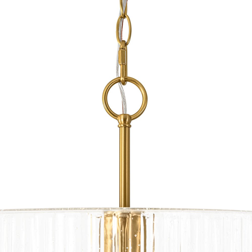 One Light • Clear Textured Glass • Striped Glass with Seeded Details • Round Drum Shade • Dual Mount Design • Brushed Brass Finish • E26 Bulbs (Not Included) • Hardwired • UL Listed/ETL