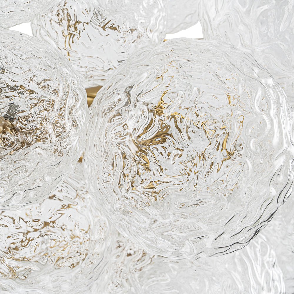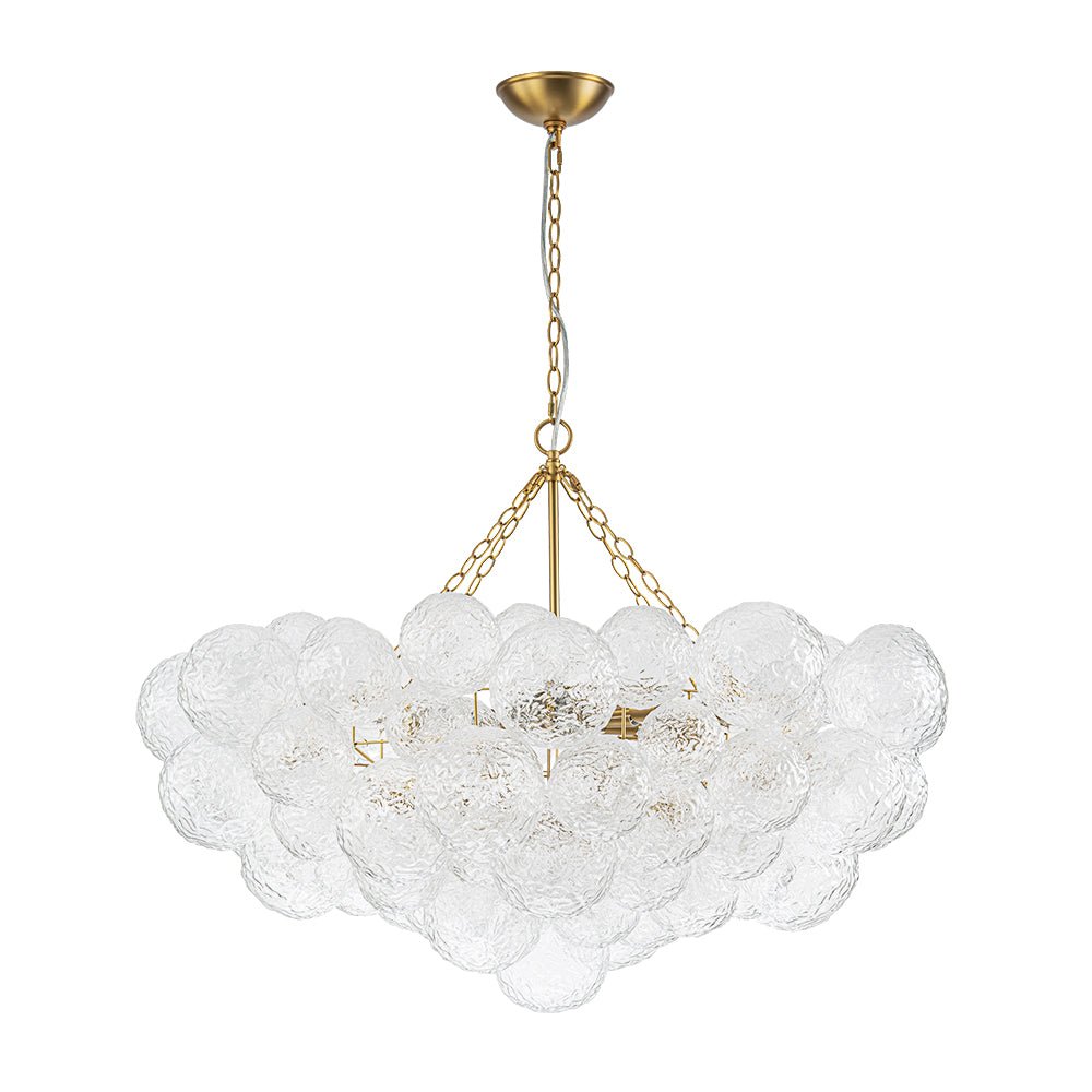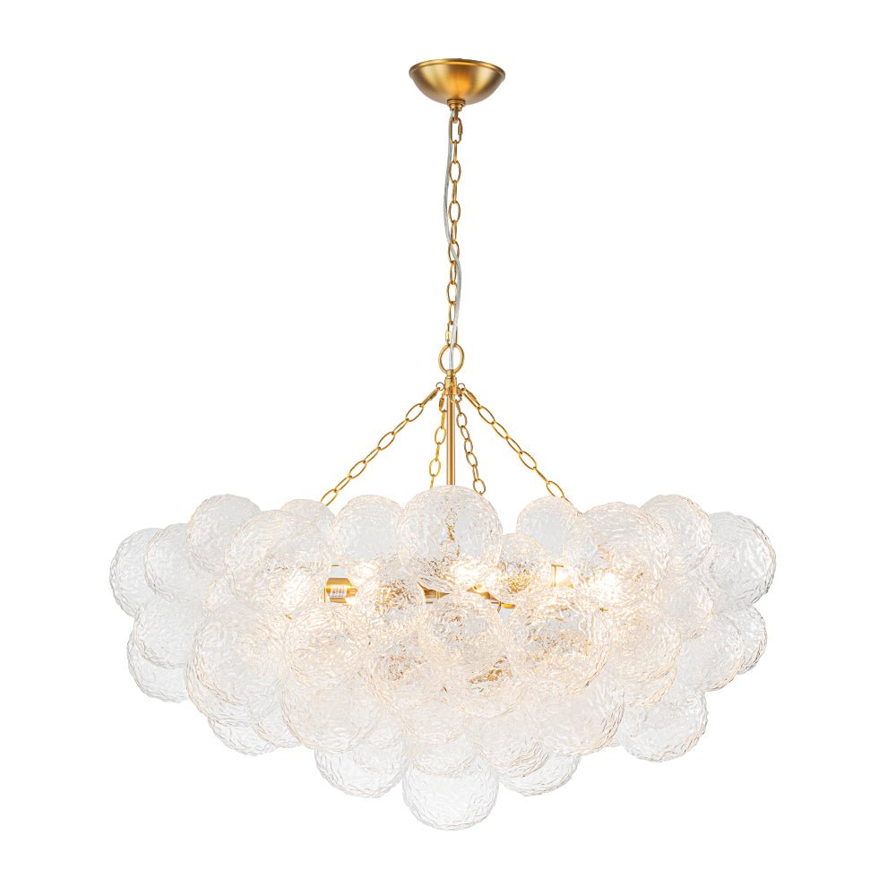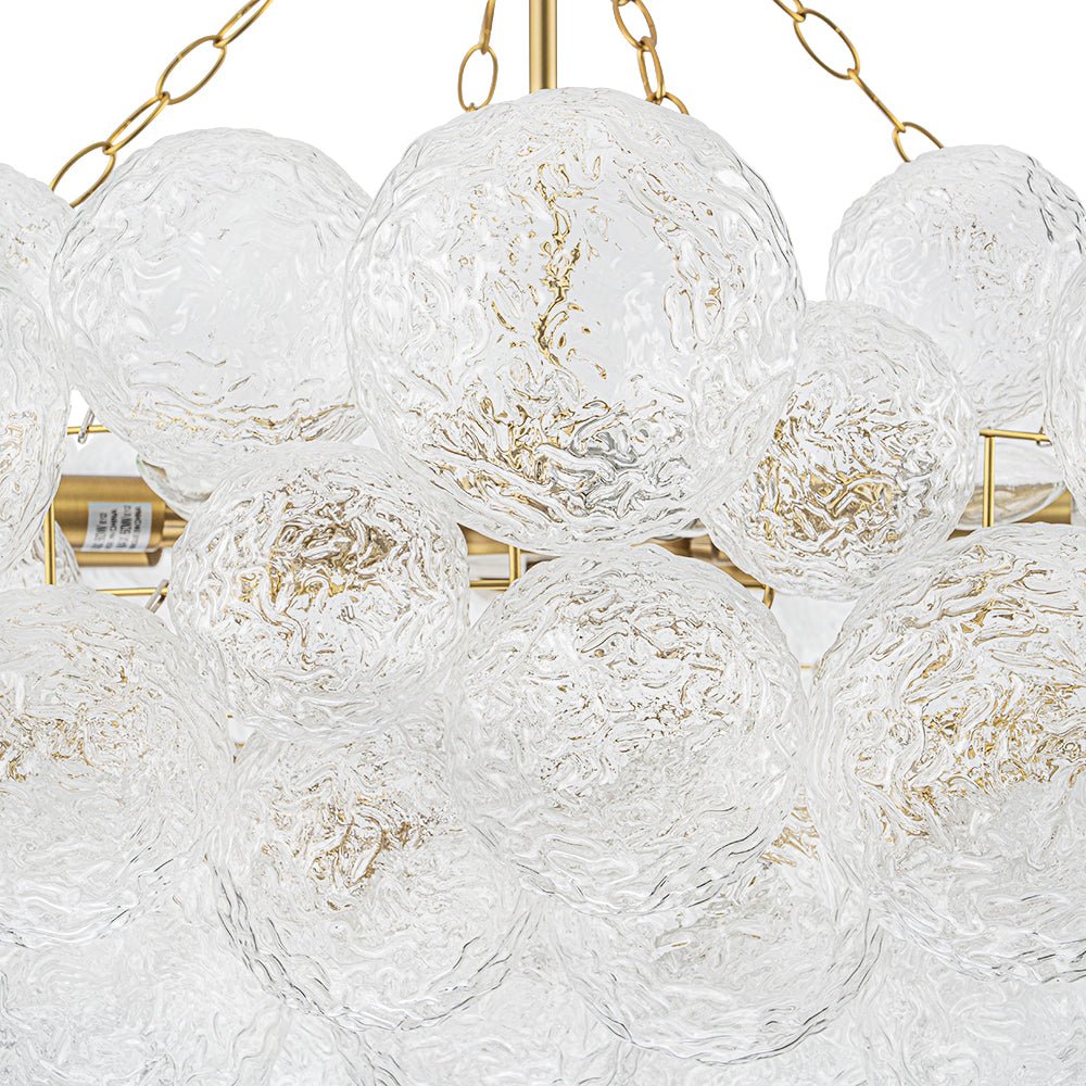 Arranged in captivating clusters, this round bubble chandelier embodies the height of ornate charm and an ethereal touch. At its core is our innovative clear textured glass globe, inspired by the lively ripples of water, capturing the dynamic motion of waves and freezing them into a delicate icy orb, reminiscent of the enchanting beauty of Frozen. When illuminated, the warm glow dances across the rich brass wide frame, spilling through the intricate ripples of each glass orb with delicate grace. This cluster textured glass globe chandelier radiates a refined, romantic elegance, making it the perfect statement piece for a modern living room, entryway, dining room, bathroom, or bedroom.