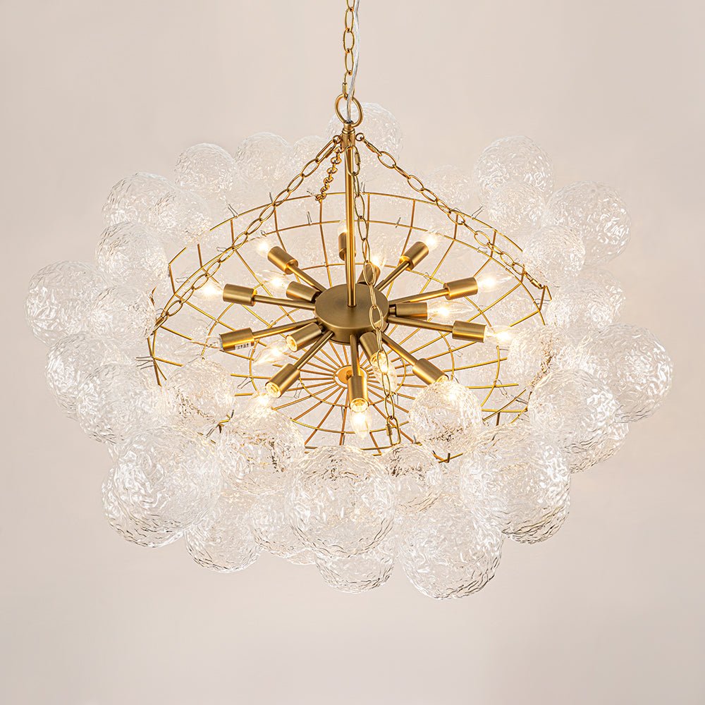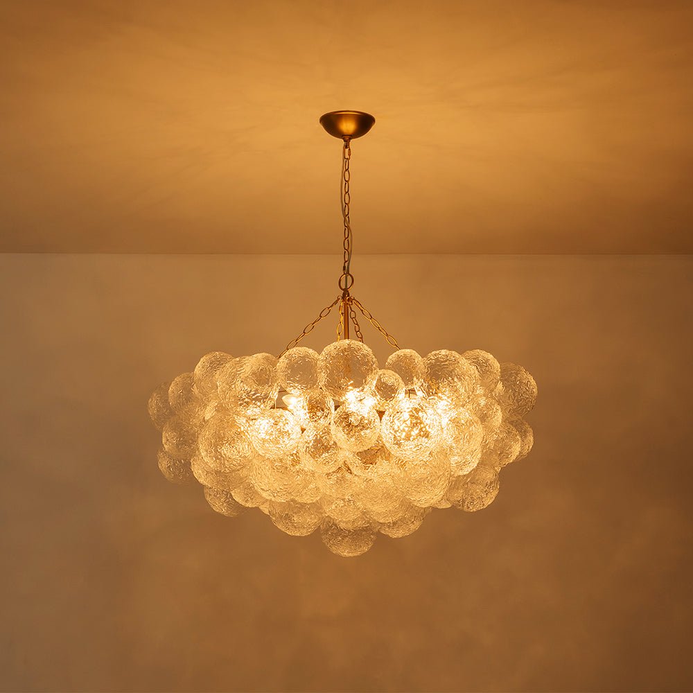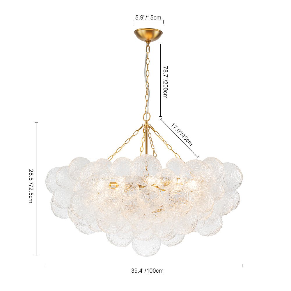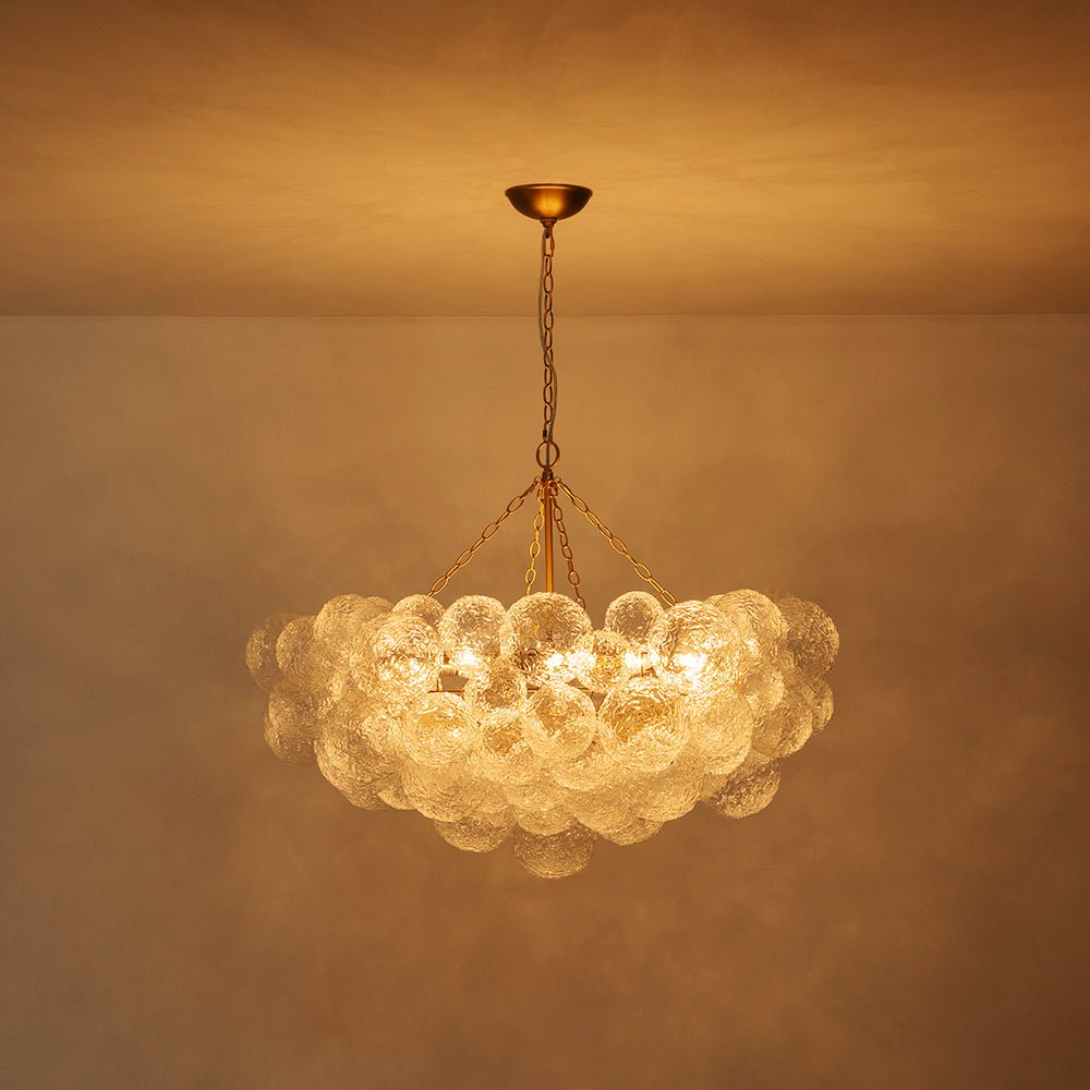 Arranged in captivating clusters, this round bubble chandelier embodies the height of ornate charm and an ethereal touch. At its core is our innovative clear textured glass globe, inspired by the lively ripples of water, capturing the dynamic motion of waves and freezing them into a delicate icy orb, reminiscent of the enchanting beauty of Frozen. When illuminated, the warm glow dances across the rich brass wide frame, spilling through the intricate ripples of each glass orb with delicate grace. This cluster textured glass globe chandelier radiates a refined, romantic elegance, making it the perfect statement piece for a modern living room, entryway, dining room, bathroom, or bedroom.