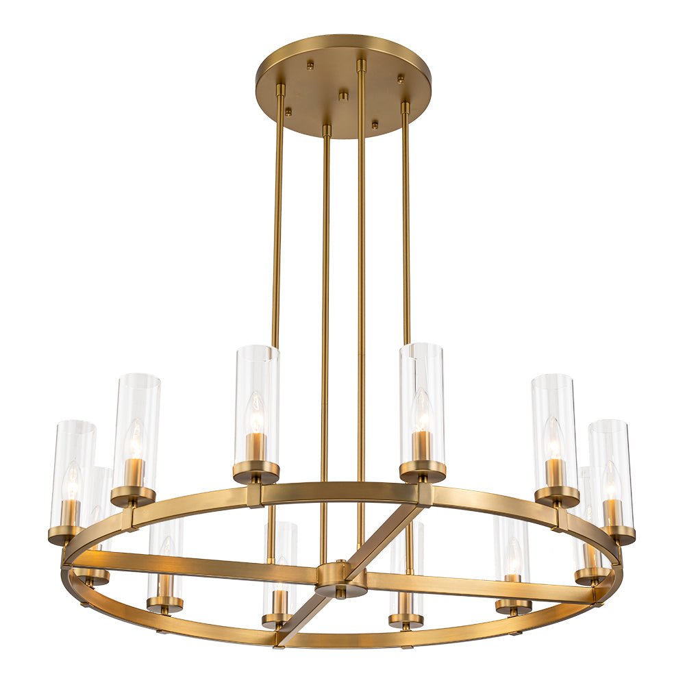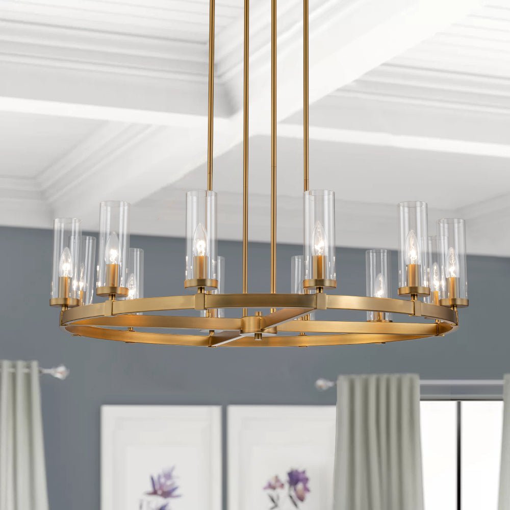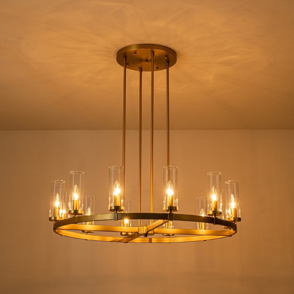 Elevate your space with our captivating yet understated 12-light wagon wheel chandelier, blending modern glam-luxe inspiration with farmhouse charm. Ideal for your dining room, kitchen island, living room, entryway, or hallway, this round chandelier boasts a sizable ring profile and an open, airy appearance. Enhanced with long cylindrical shades crafted from clear glass, each delicately balanced around the circular frame, this circular pendant light exudes contemporary elegance. Inside each shade lies a candelabra-style socket compatible with E12 candelabra bulbs (bulbs not included), adding a touch of tradition to its modern design.