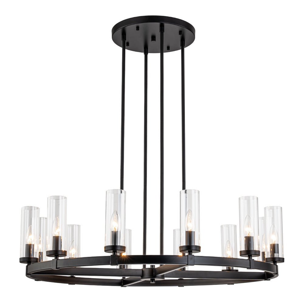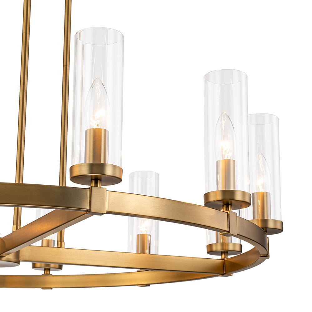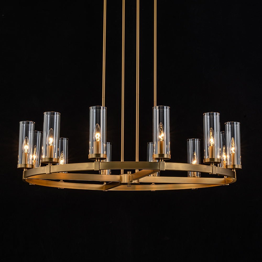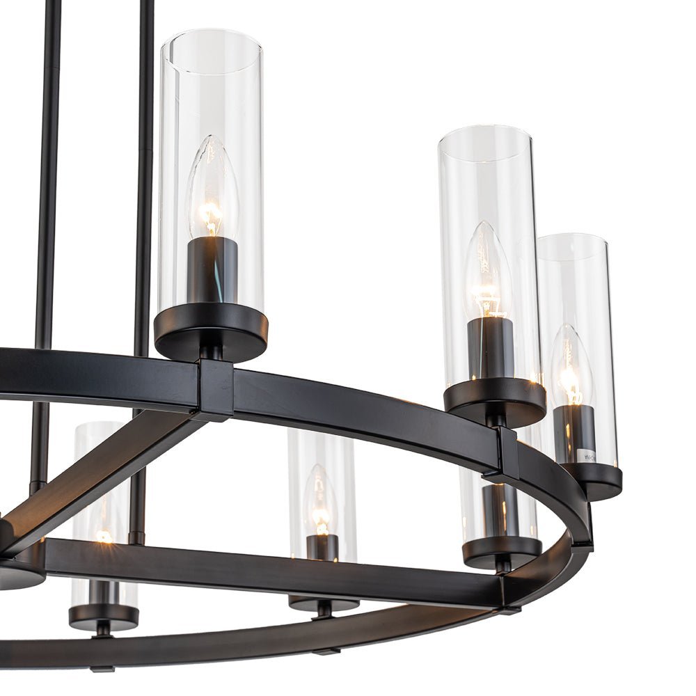 Elevate your space with our captivating yet understated 12-light wagon wheel chandelier, blending modern glam-luxe inspiration with farmhouse charm. Ideal for your dining room, kitchen island, living room, entryway, or hallway, this round chandelier boasts a sizable ring profile and an open, airy appearance. Enhanced with long cylindrical shades crafted from clear glass, each delicately balanced around the circular frame, this circular pendant light exudes contemporary elegance. Inside each shade lies a candelabra-style socket compatible with E12 candelabra bulbs (bulbs not included), adding a touch of tradition to its modern design.