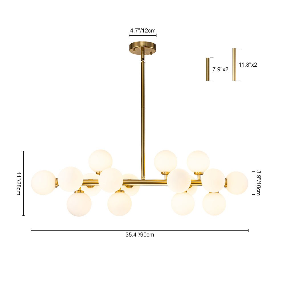 Glide through the world of mid-century modern elegance with this luxurious 16-light bubble island chandelier. The linear frame of this alluring sputnik chandelier provides a perfect backdrop for its lovely dainty opal glass globes, which adorn it like delicate gypsophila flowers. Available in rich brass or black finish, this exquisite 16-light milky white glass globe linear chandelier is sure to provide a sophisticated look and cozy ambiance to enhance any entryway, dining room, living space, kitchen island, or bedroom.
