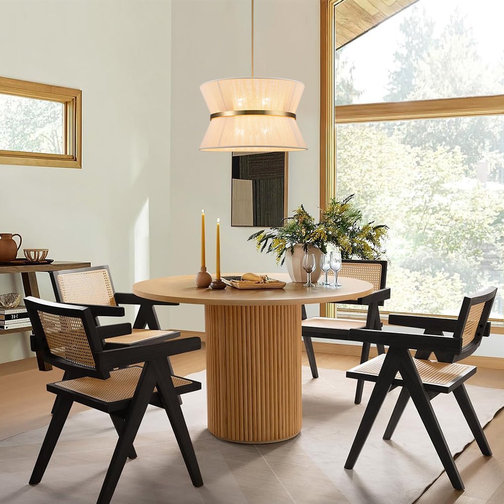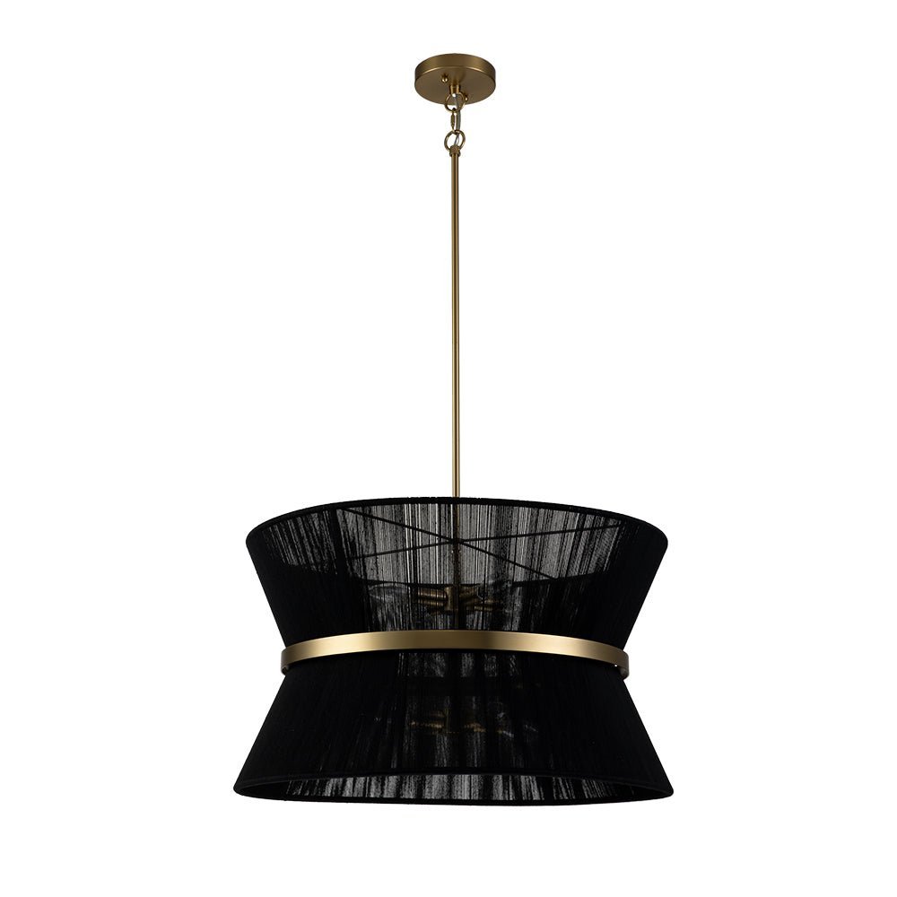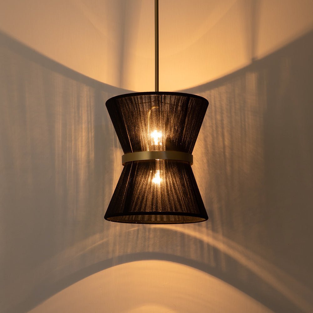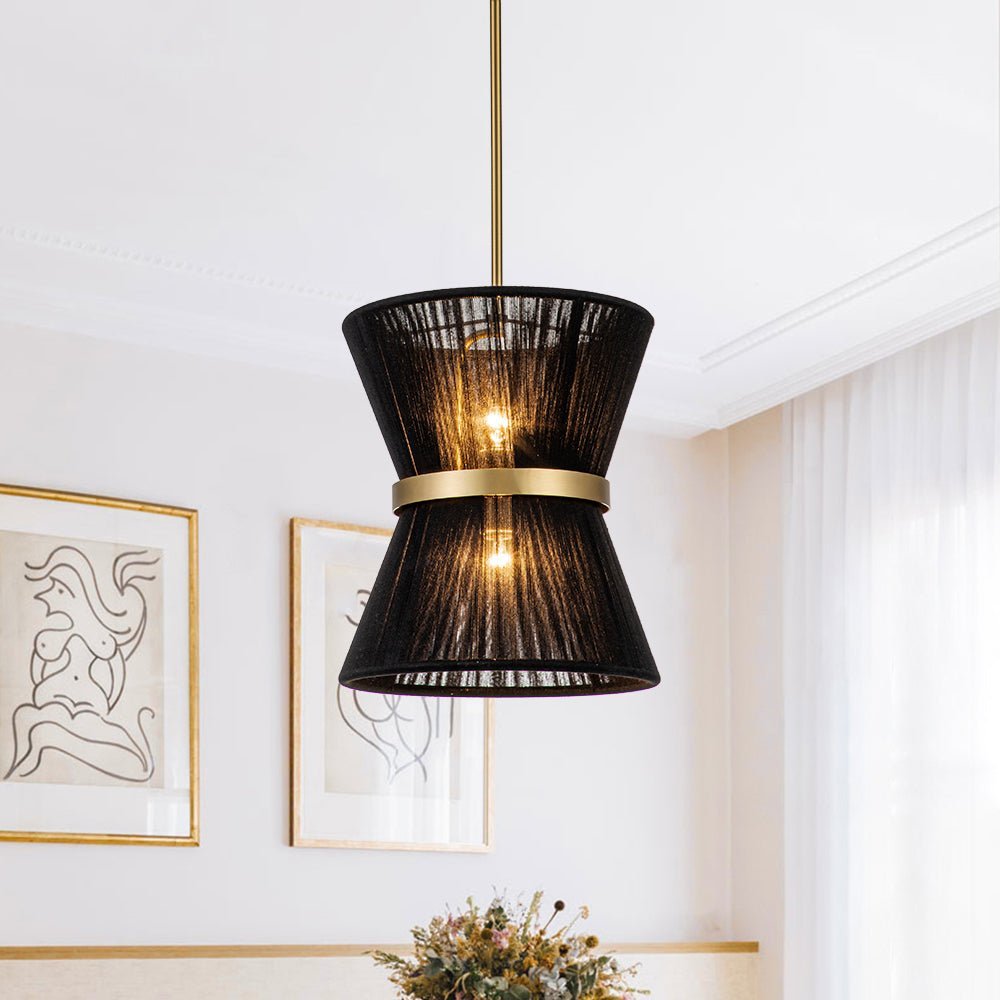 This Bohemian lantern pendant light, seamlessly combining modern farmhouse and chic Bohemian styles, adds timeless elegance to any dining room, kitchen, entryway, foyer, bedroom, or living room. Exquisitely crafted from durable metal with a brushed brass finish, the chandelier features a 2-tier cage design hand-wrapped in ivory or black cotton rope, creating a geometric tapered drum silhouette. Elegant yet sophisticated, this woven thread pendant light draws attention and casts a warm, inviting glow, enhancing the room's ambiance with its natural coastal charm.