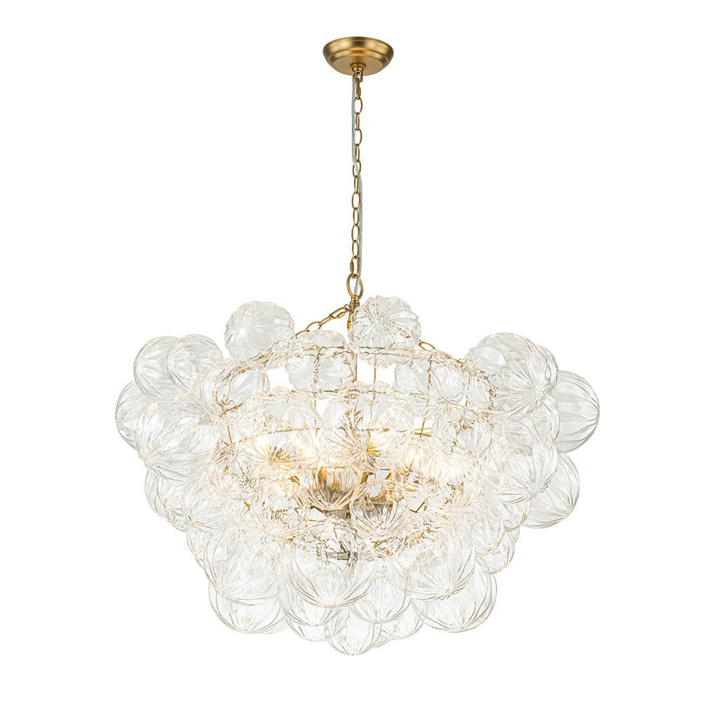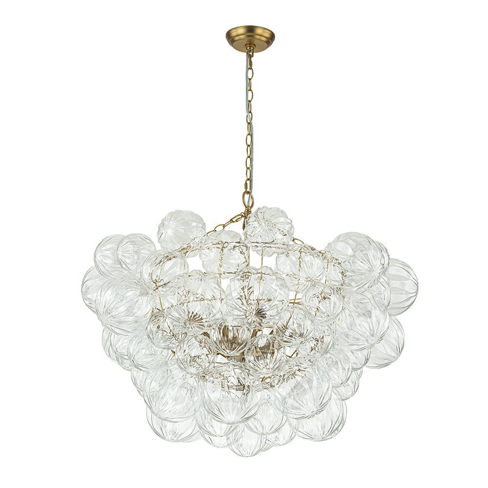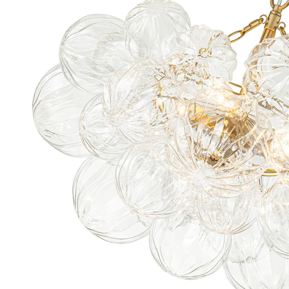 Experience the epitome of luxury charm and artful ambiance with our new collection of bubble chandeliers. The quintessence is our ground-breaking sculpture texture glass globe, inspired by ice engraving style and crafted of clear hand-blown texture glass, boasting an ornate yet ethereal touch. When turning on this cluster glass globe chandelier, warm lighting sweeps across the rich brass frame, flowing out through every curve of the glass orbs with exquisite grace. This sculpture texture glass bubble chandelier radiates an unparalleled level of romantic elegance and refinement at every turn, perfect to enhance a modern living room, entryway, dining room, bathroom, or bedroom.