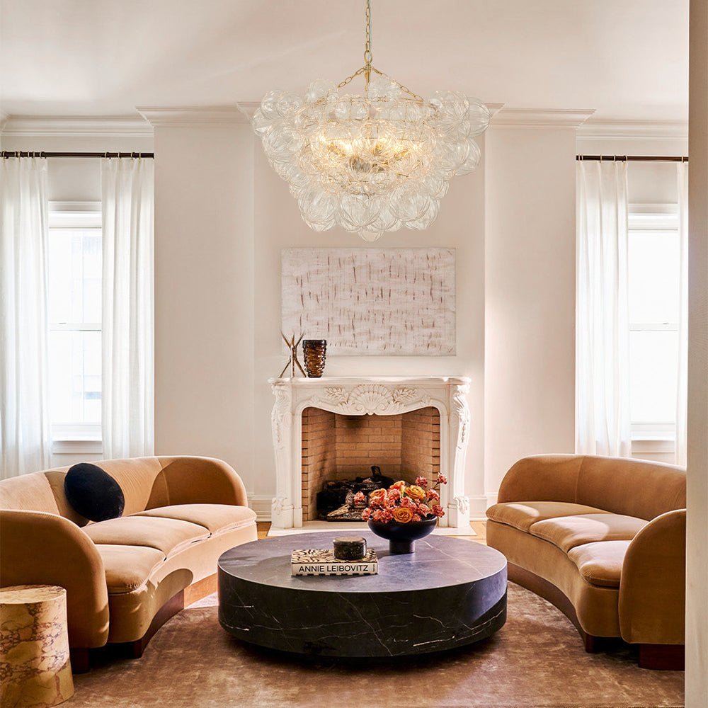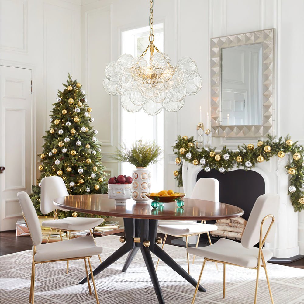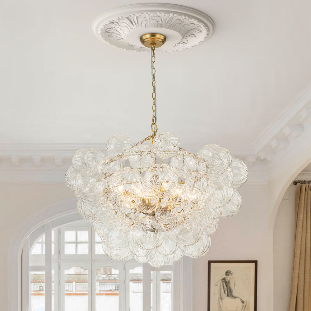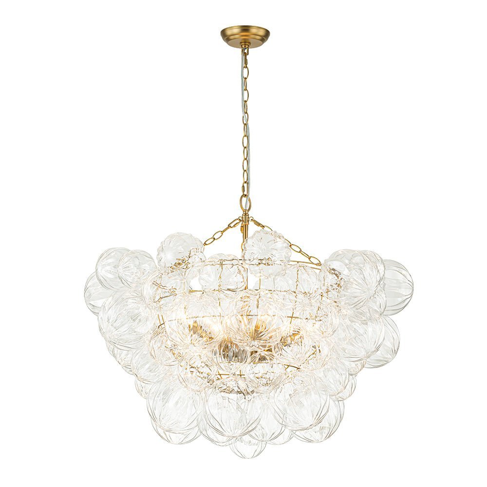 Experience the epitome of luxury charm and artful ambiance with our new collection of bubble chandeliers. The quintessence is our ground-breaking sculpture texture glass globe, inspired by ice engraving style and crafted of clear hand-blown texture glass, boasting an ornate yet ethereal touch. When turning on this cluster glass globe chandelier, warm lighting sweeps across the rich brass frame, flowing out through every curve of the glass orbs with exquisite grace. This sculpture texture glass bubble chandelier radiates an unparalleled level of romantic elegance and refinement at every turn, perfect to enhance a modern living room, entryway, dining room, bathroom, or bedroom.