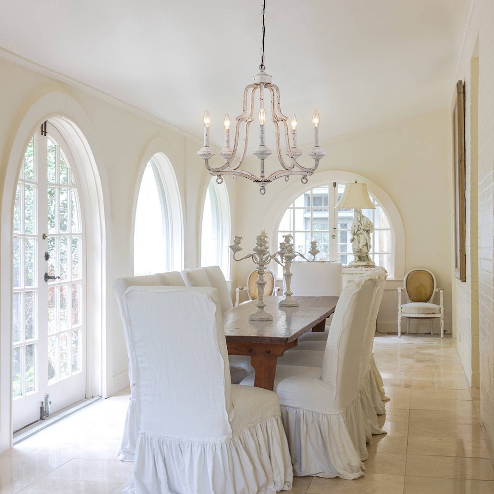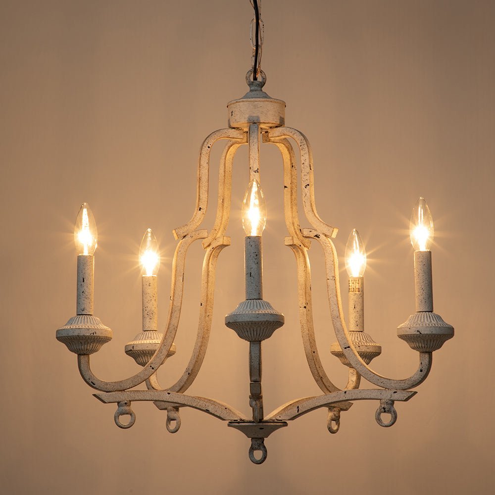 This 5-light vintage chandelier boasts a classic candle style silhouette finished in a distressed white delivering a French country flair. Graceful curves and slender arms come to build a delicate elegant frame of this shabby chic chandelier. Five E12 candelabra bulbs (not included) complement the traditional look. This 5-light shabby chic candle style chandelier lends a historial glamorous touch perfect for a dining room, kitchen island, living room, bedroom, hall, or entry.