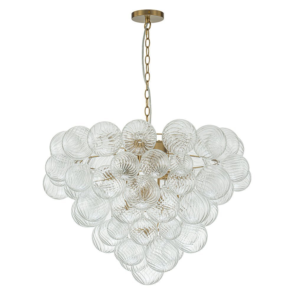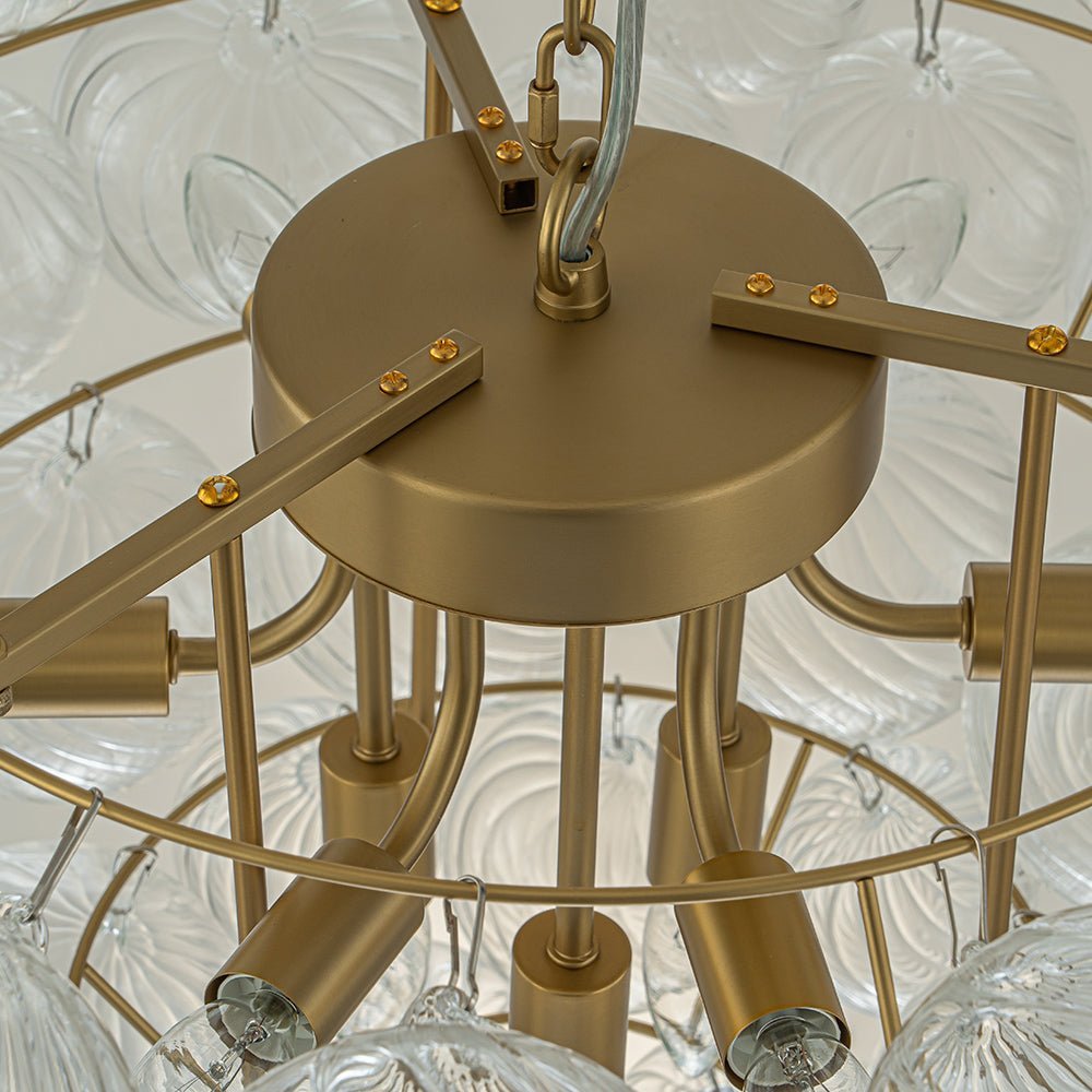 Nine Lights ⢠Tapered Framework ⢠Ribbed Glass Globes ⢠Bubble Style ⢠Brushed Brass Finish ⢠E12 Candelabra Bulbs (Not Included) ⢠Hardwired ⢠UL Listed