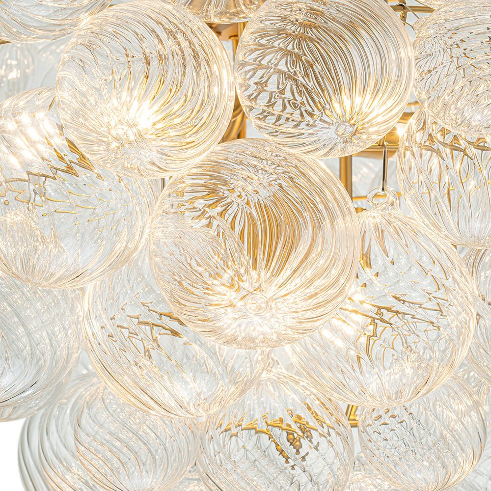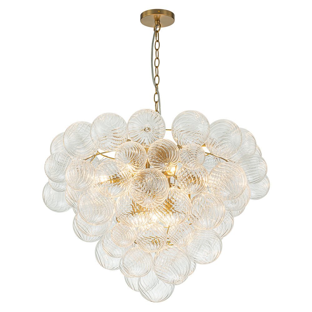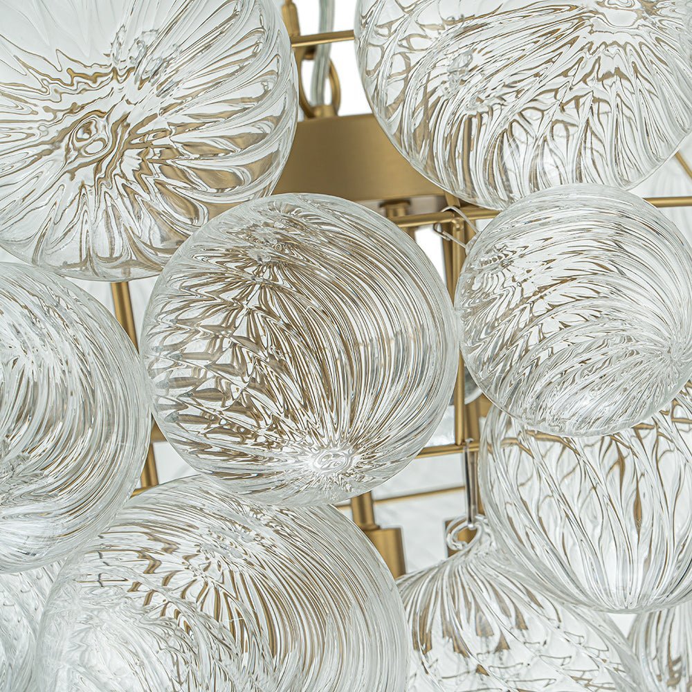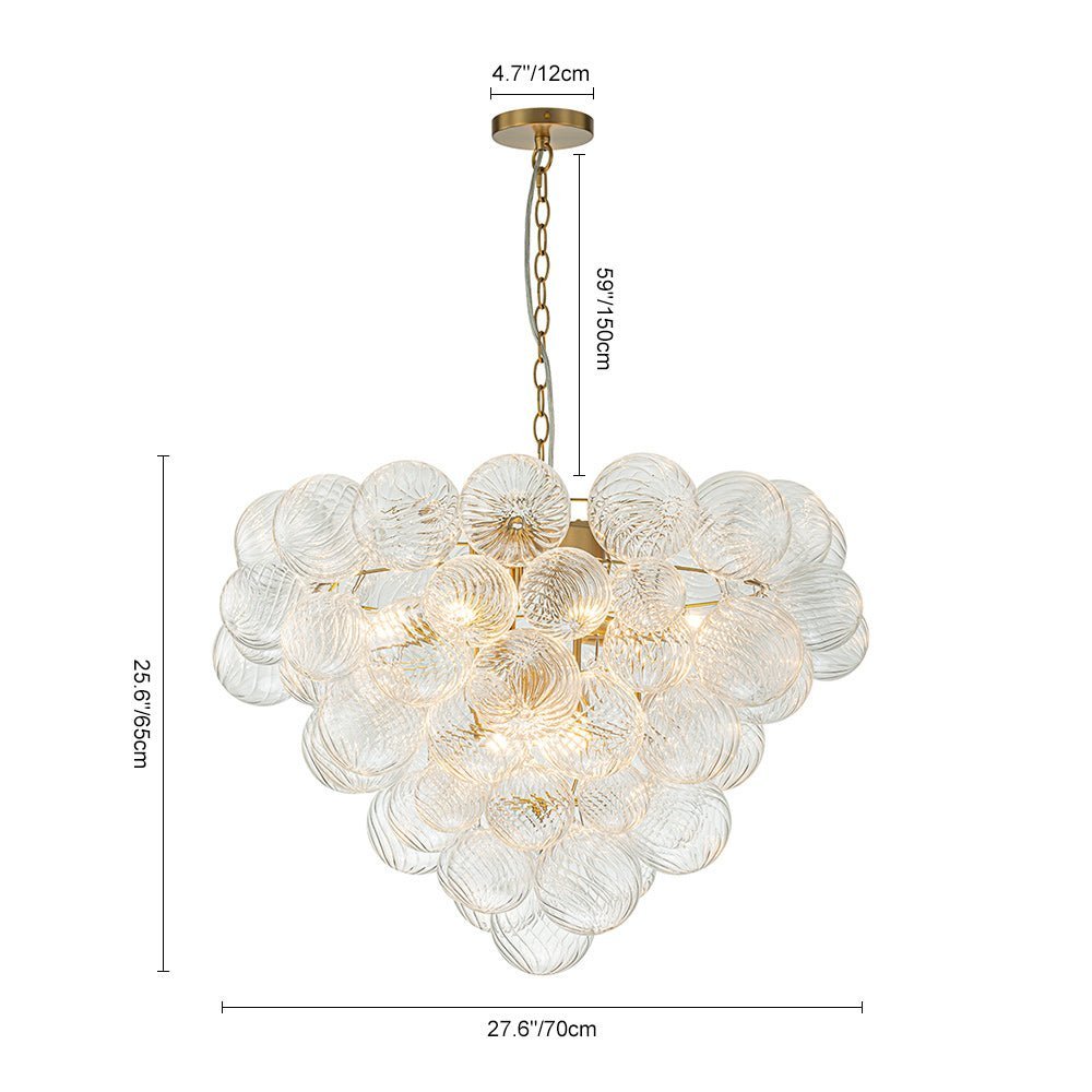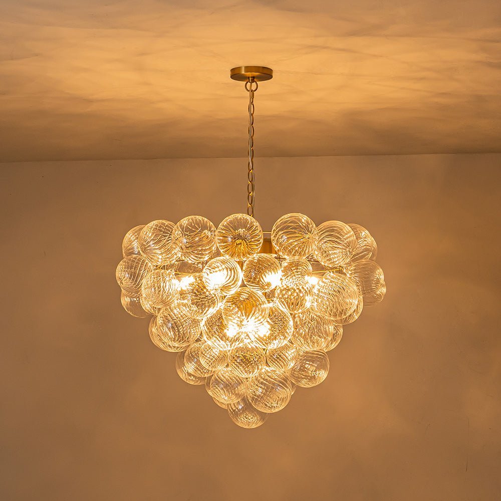 Indulge in pure luxury with our top-selling range of textured glass bubble chandeliers. This luxurious and exclusive cluster globe chandelier features an array of swirling ribbed glass spheres adorning a tapered metal framework, evoking a bountiful bunch of crystalline grapes. When illuminated, this glam bubble chandelier emits a warm radiance that flows through the swirls of each glass globe, creating an amazingly sparkle bubble effect that will captivate all. Ideal to grace a modern living room, entry, dining room, bathroom, foyer, or bedroom, this ribbed glass globe bubble chandelier embodies the epitome of refined sophistication and artistic ambiance.