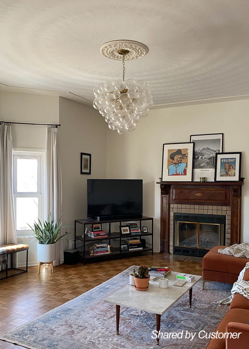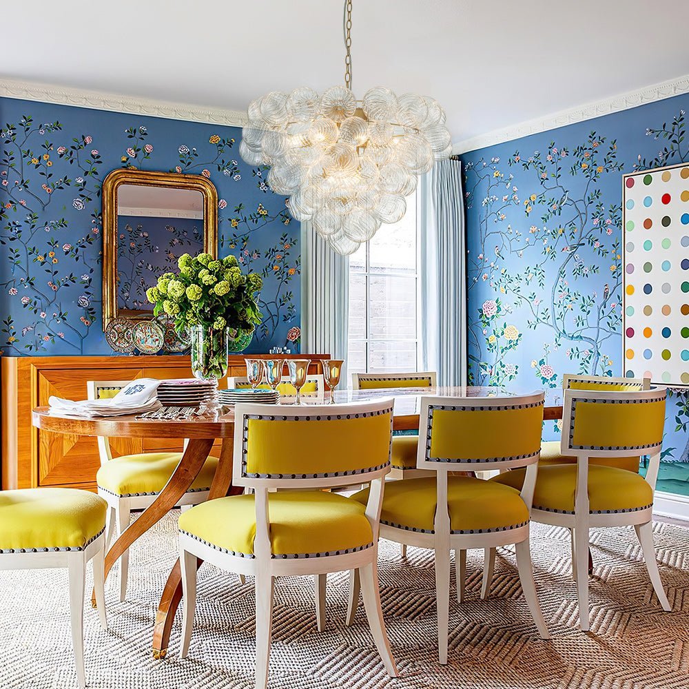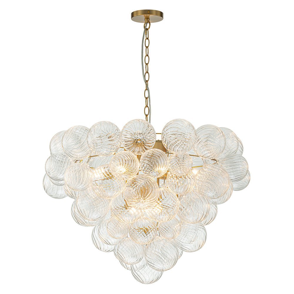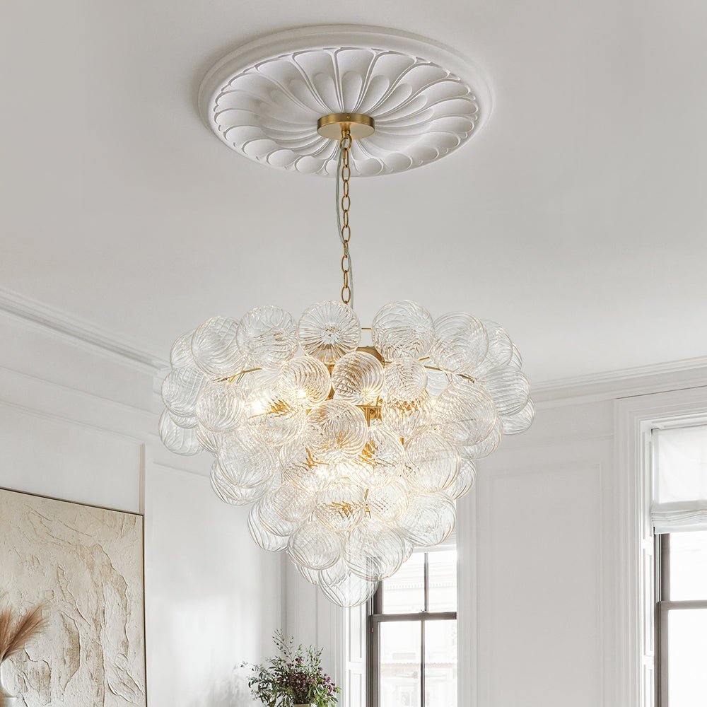 Indulge in pure luxury with our top-selling range of textured glass bubble chandeliers. This luxurious and exclusive cluster globe chandelier features an array of swirling ribbed glass spheres adorning a tapered metal framework, evoking a bountiful bunch of crystalline grapes. When illuminated, this glam bubble chandelier emits a warm radiance that flows through the swirls of each glass globe, creating an amazingly sparkle bubble effect that will captivate all. Ideal to grace a modern living room, entry, dining room, bathroom, foyer, or bedroom, this ribbed glass globe bubble chandelier embodies the epitome of refined sophistication and artistic ambiance.