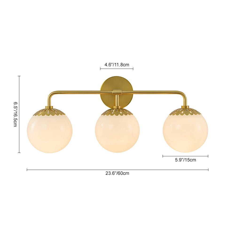 Enjoy the allure and sophistication of this opulent bathroom wall light that will enchant your senses and decor with a luxurious and modern mid-century flair. Equipped with three glossy milky white glass globes adorning a horizontal linear arm, this vanity sconce exudes refinement and finesse with its flower-style bases inspired by blooming daisy pattern. The chic antique brass finish adds a touch of timeless elegance to this 3-light opal glass globe vanity light, perfect for elevating any space from bathrooms and sinks to bedrooms and powder rooms.