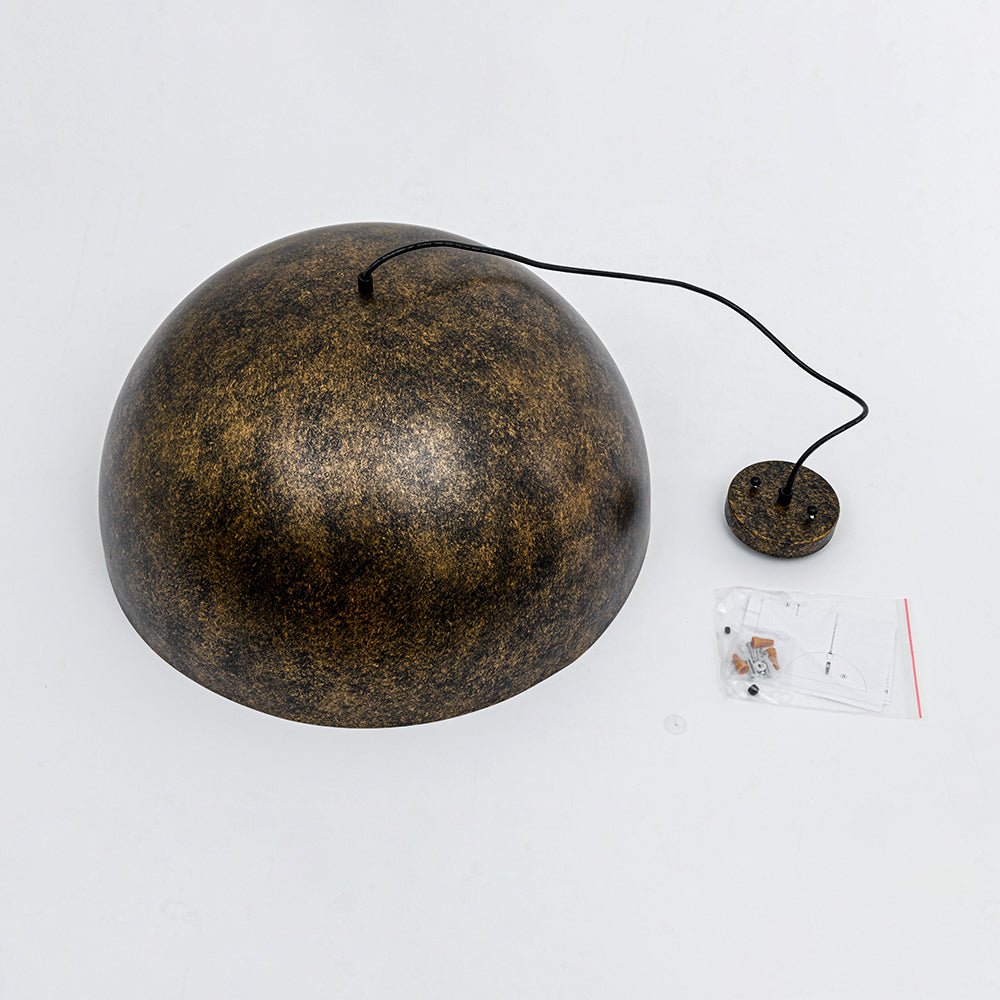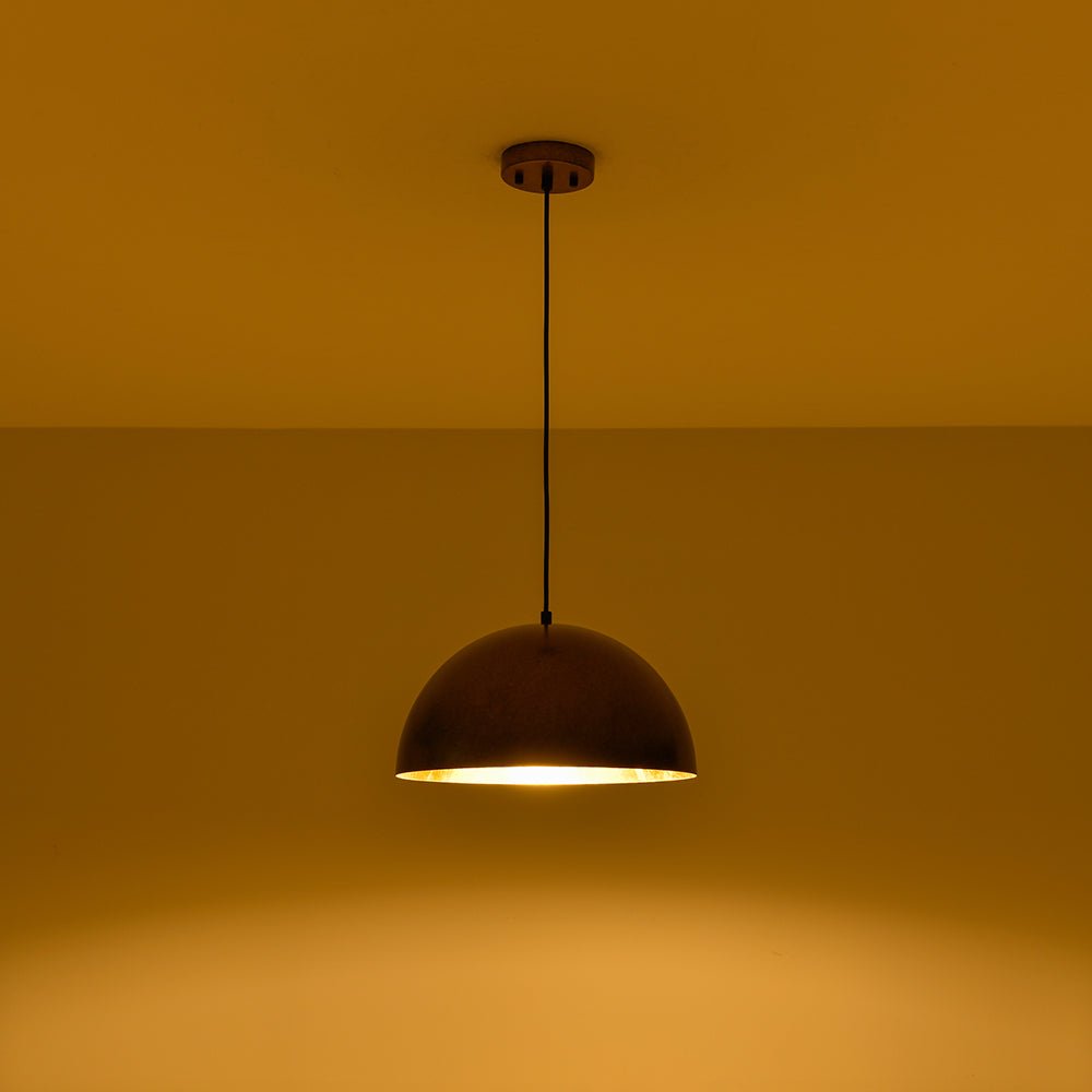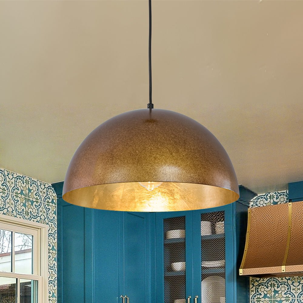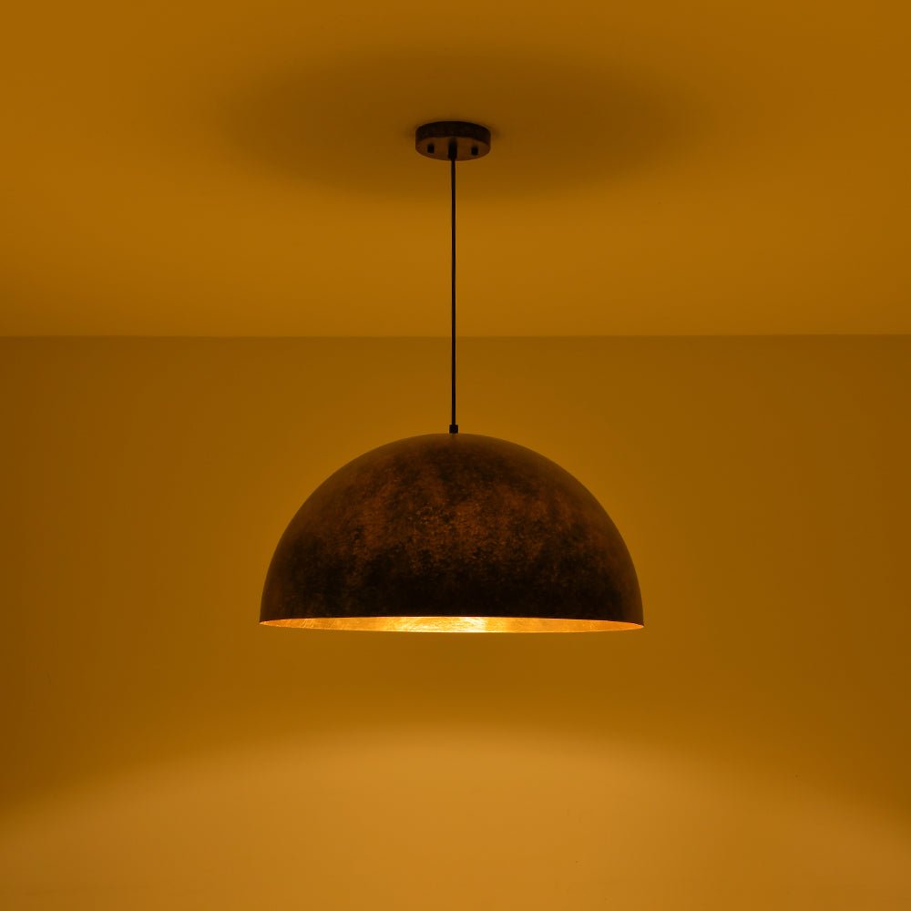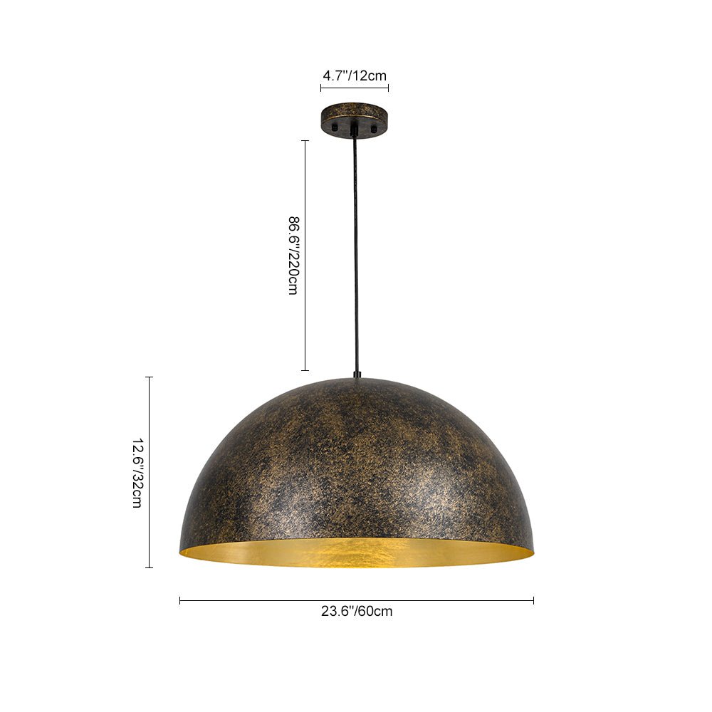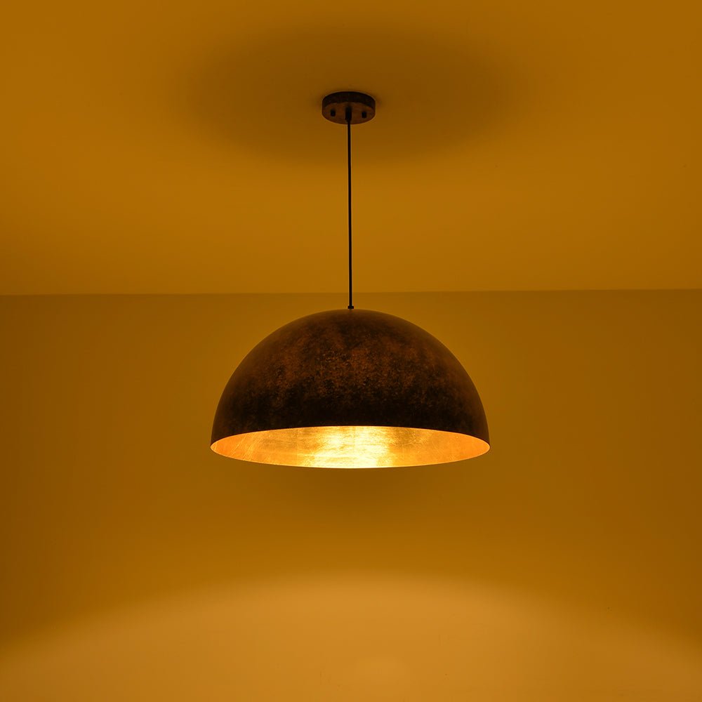 Add dramatic flair and rustic elegance to your space with this oversized iron dome pendant light. The striking exterior features a richly textured brown rust finish, evoking the natural beauty of aged, weathered metal. Its artisan-crafted surface blends earthy browns with antique gold undertones, giving the fixture a warm, timeworn character that suits industrial, farmhouse, or vintage-inspired interiors.