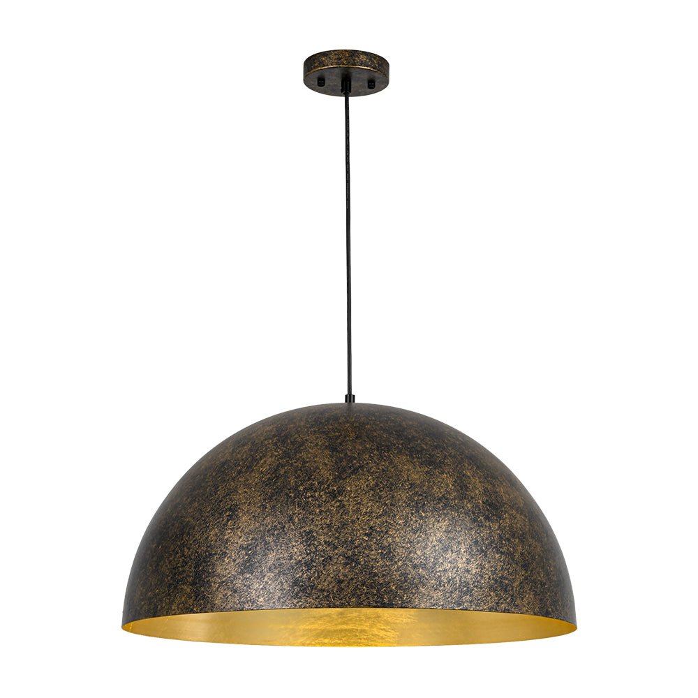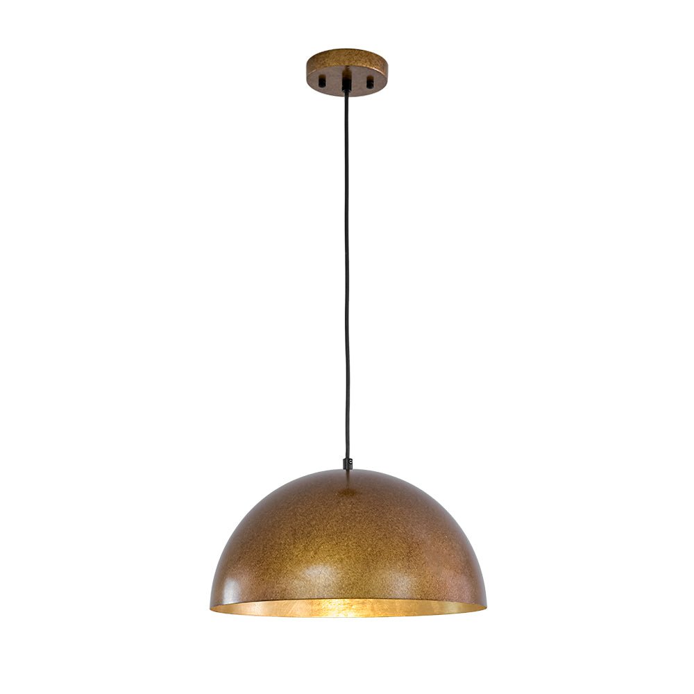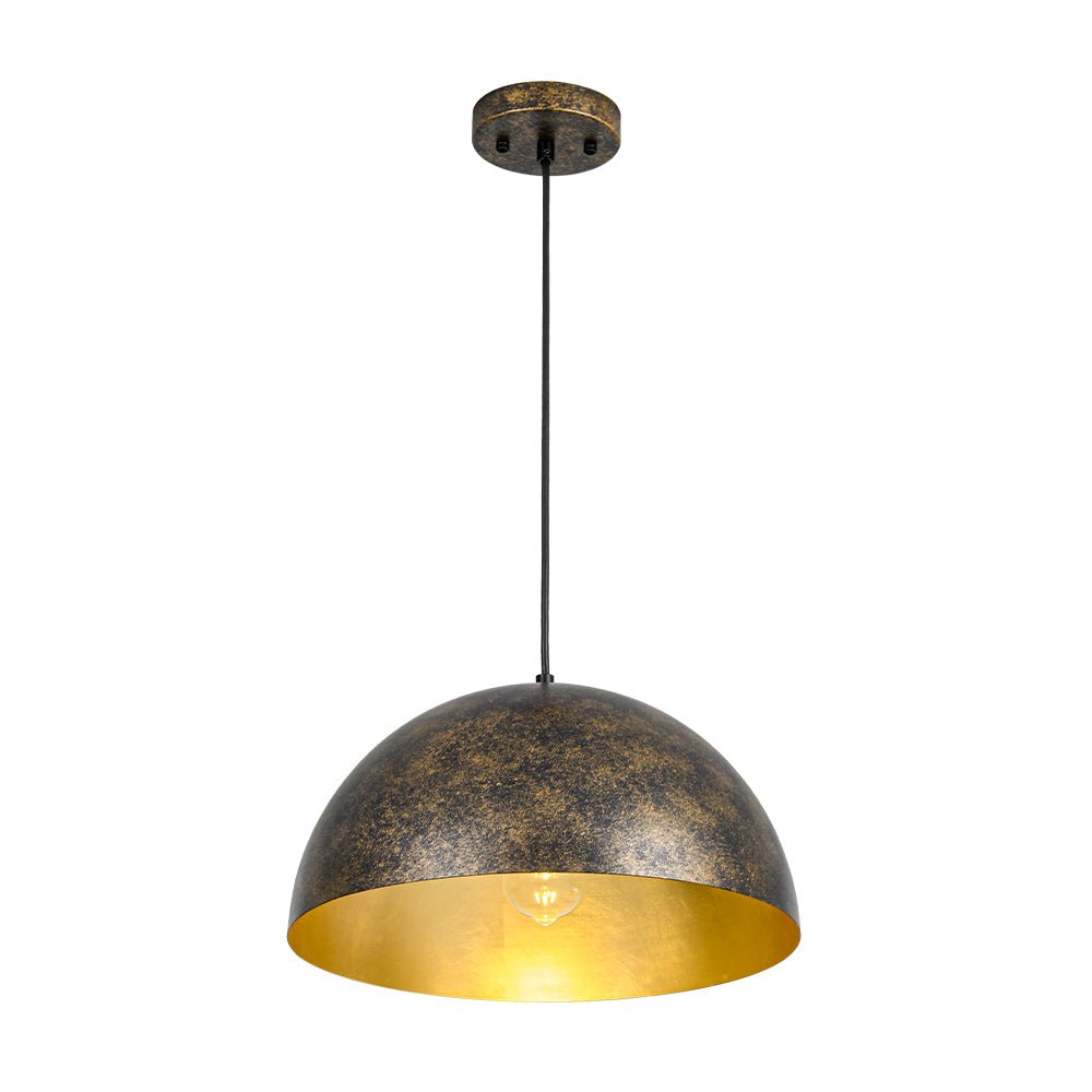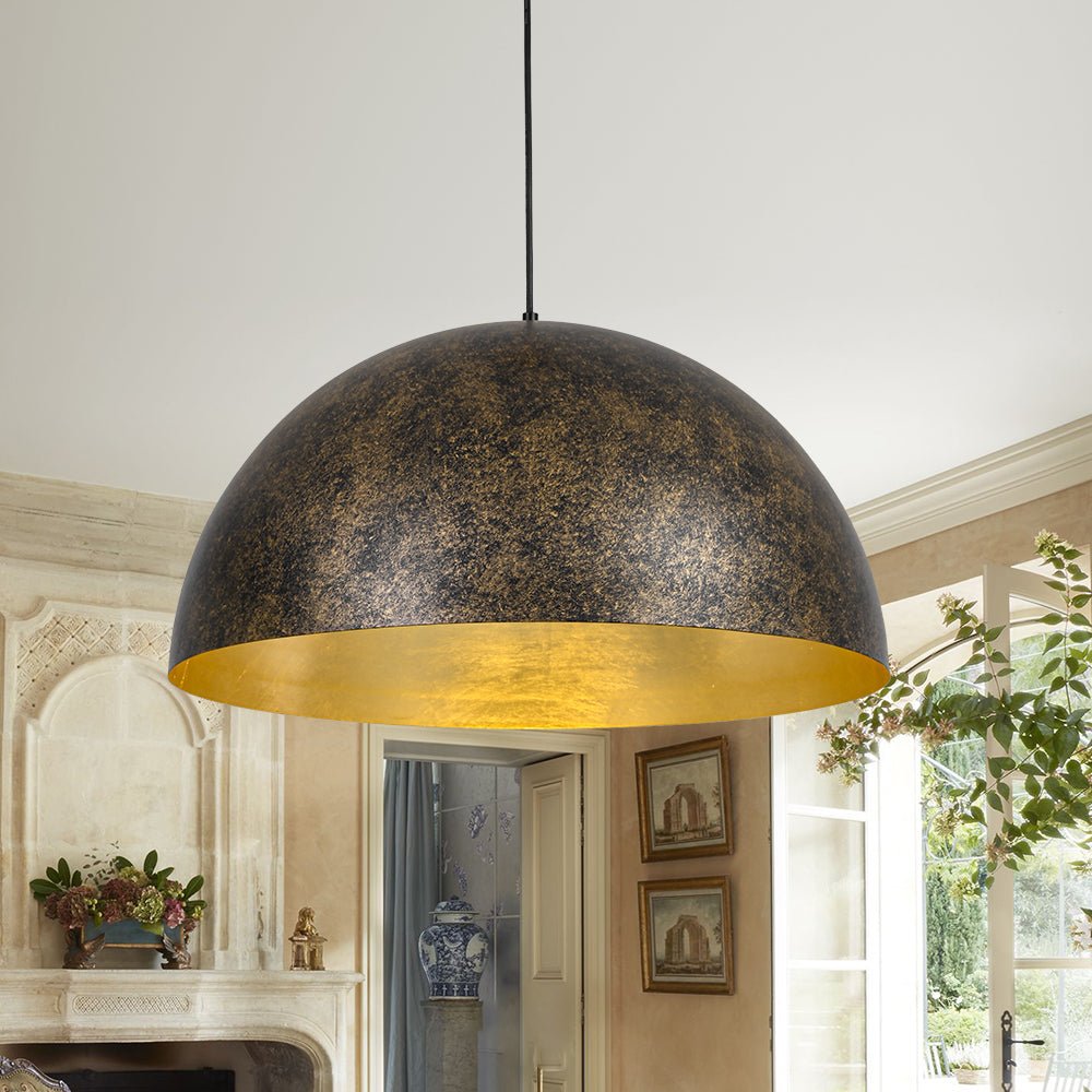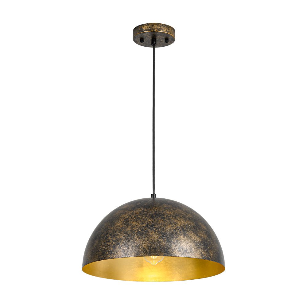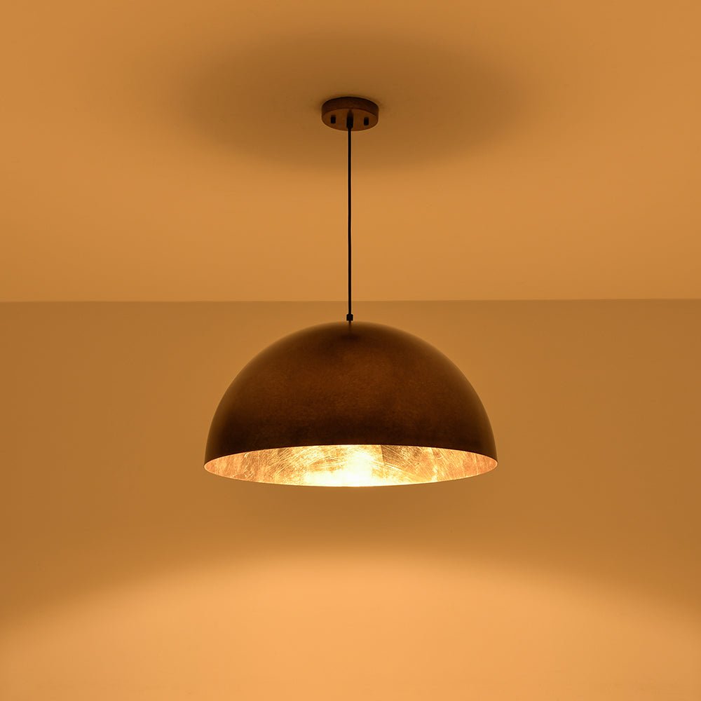 Add dramatic flair and rustic elegance to your space with this oversized iron dome pendant light. The striking exterior features a richly textured brown rust finish, evoking the natural beauty of aged, weathered metal. Its artisan-crafted surface blends earthy browns with antique gold undertones, giving the fixture a warm, timeworn character that suits industrial, farmhouse, or vintage-inspired interiors.