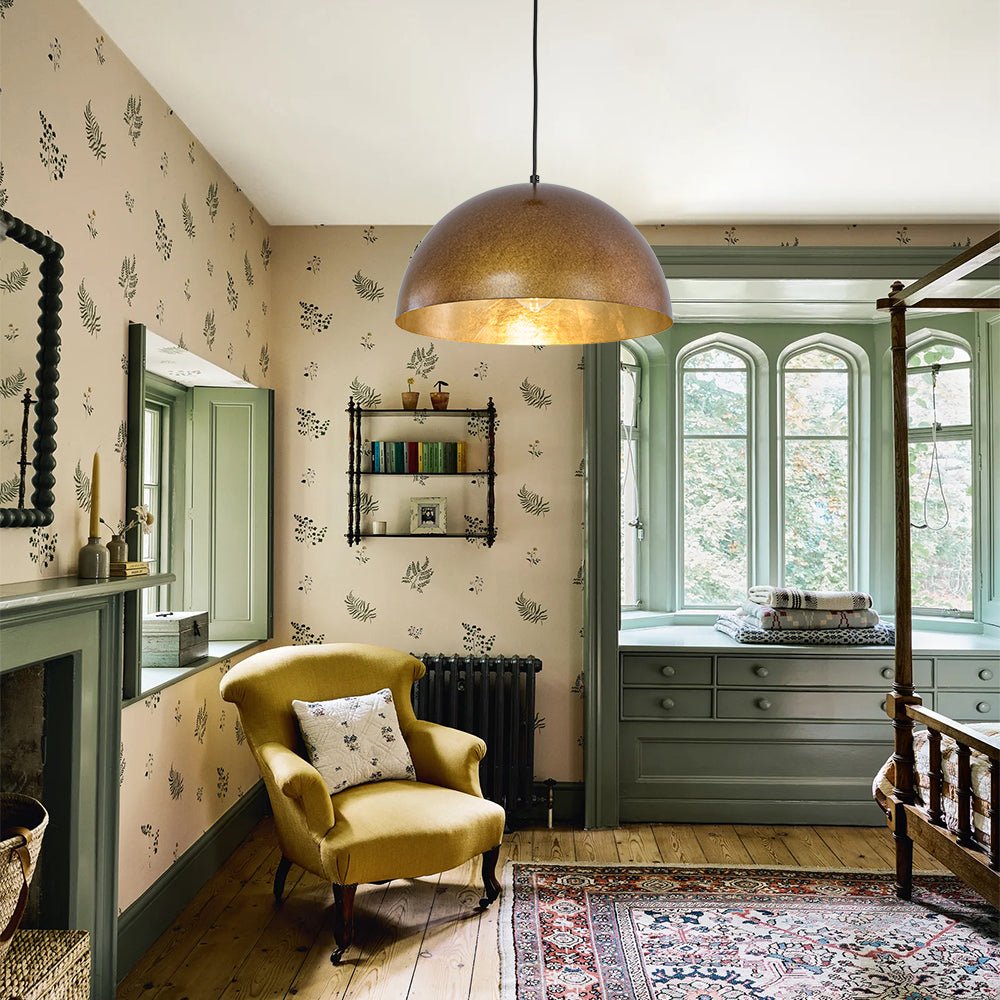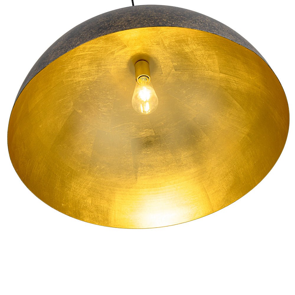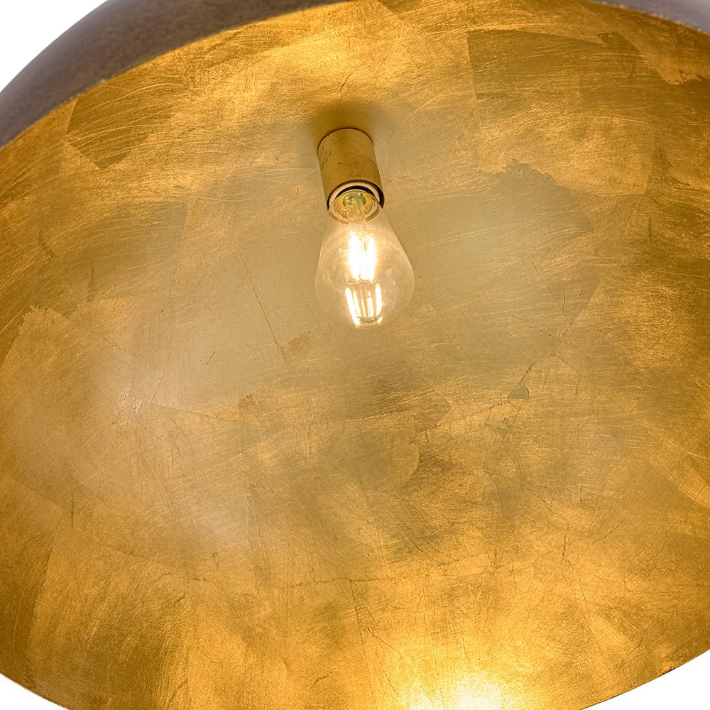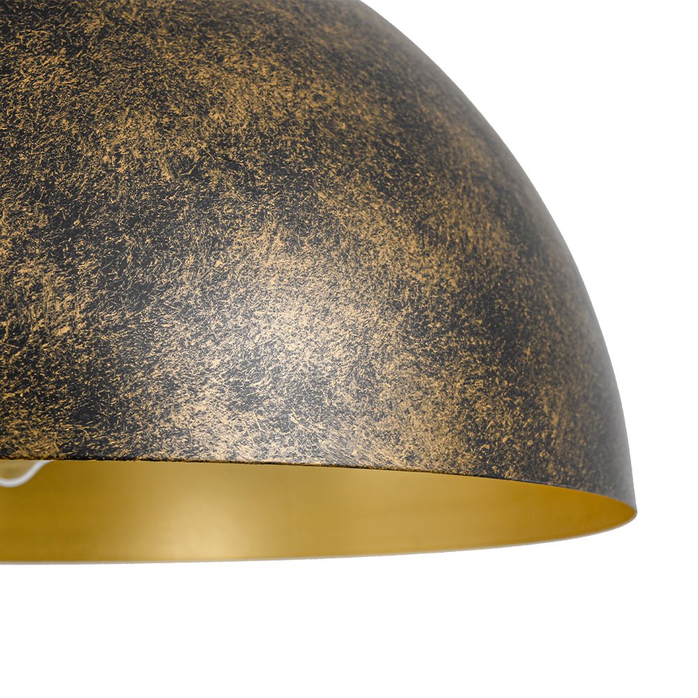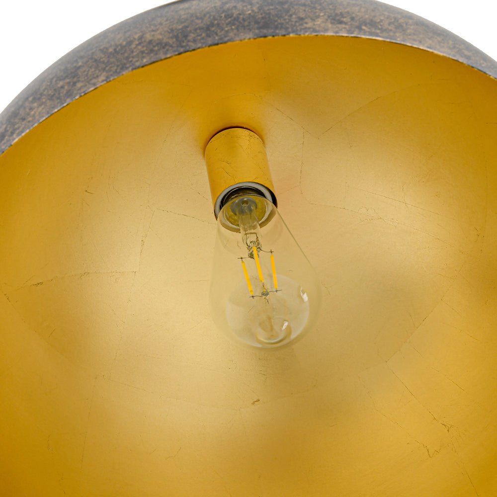 Inside, the dome is lined with a luminous gold foil finish that enhances the light’s warmth and casts a rich, inviting glow below. The contrast between the rugged exterior and radiant interior creates a bold visual statement while providing focused, ambient lighting.