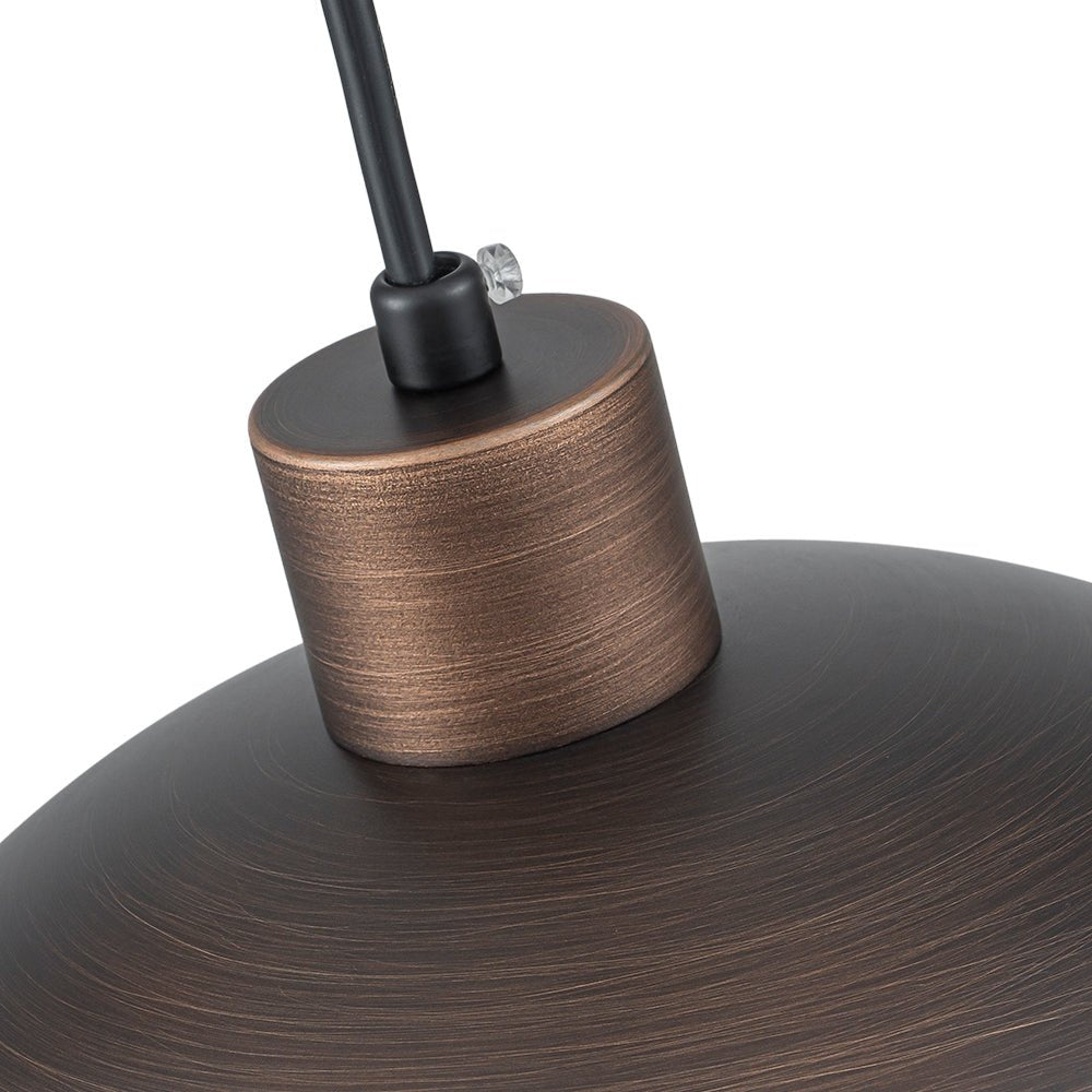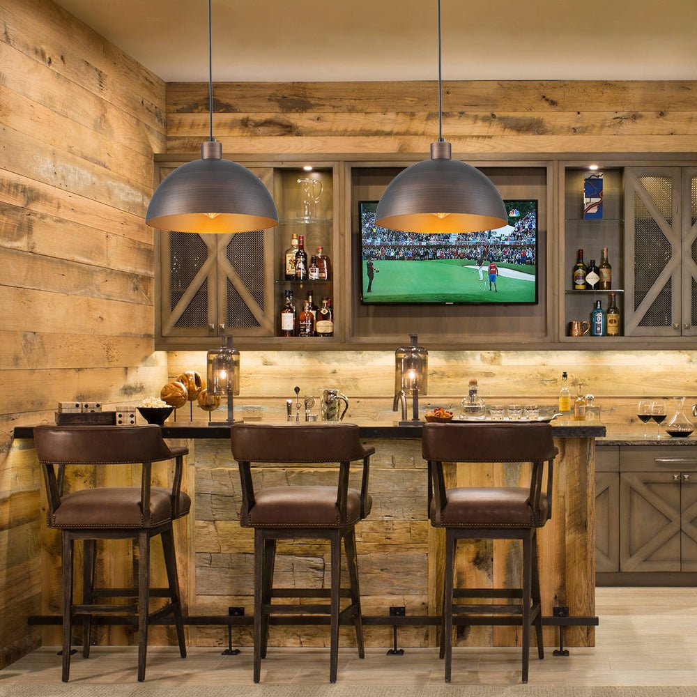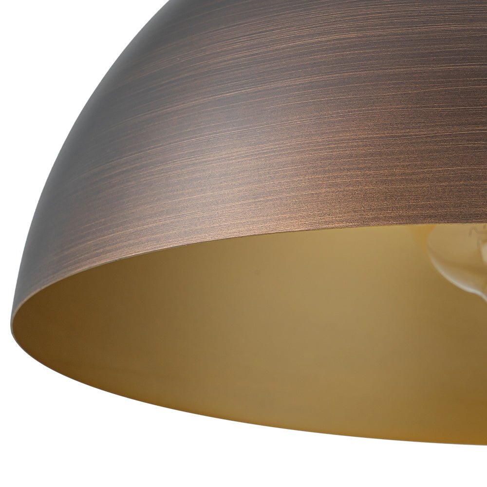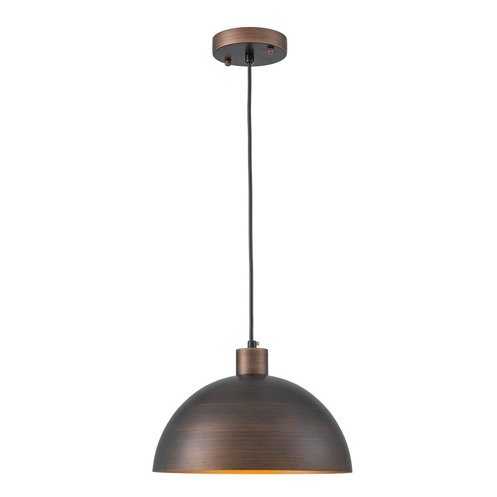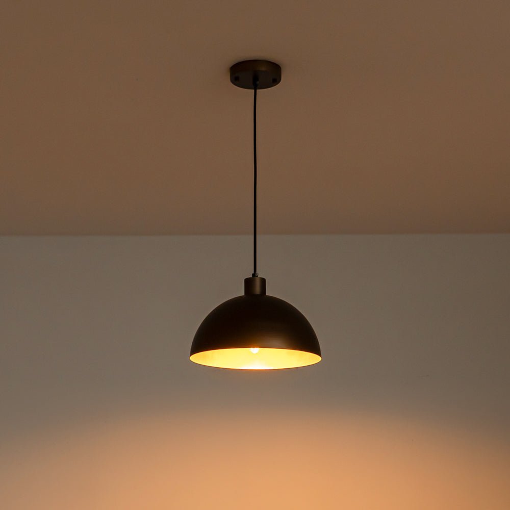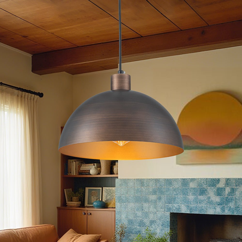 Crafted from sturdy iron, this single pendant light showcases a classic dome silhouette hand-painted in a rich antique bronze exterior, enhanced by subtle brush strokes for added texture and depth. The interior boasts a warm gold tone that beautifully reflects light, creating a soft, inviting glow. Perfect for kitchen islands, dining areas, entryways, reading nooks, or loft-style interiors, this industrial metal dome pendant light blends industrial character with modern sophistication. Hang it solo for focused lighting or in multiples for a bold statement.