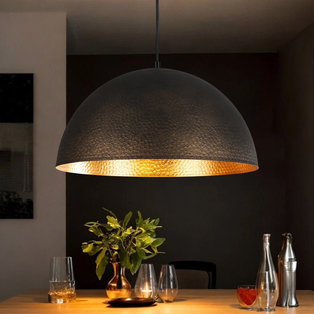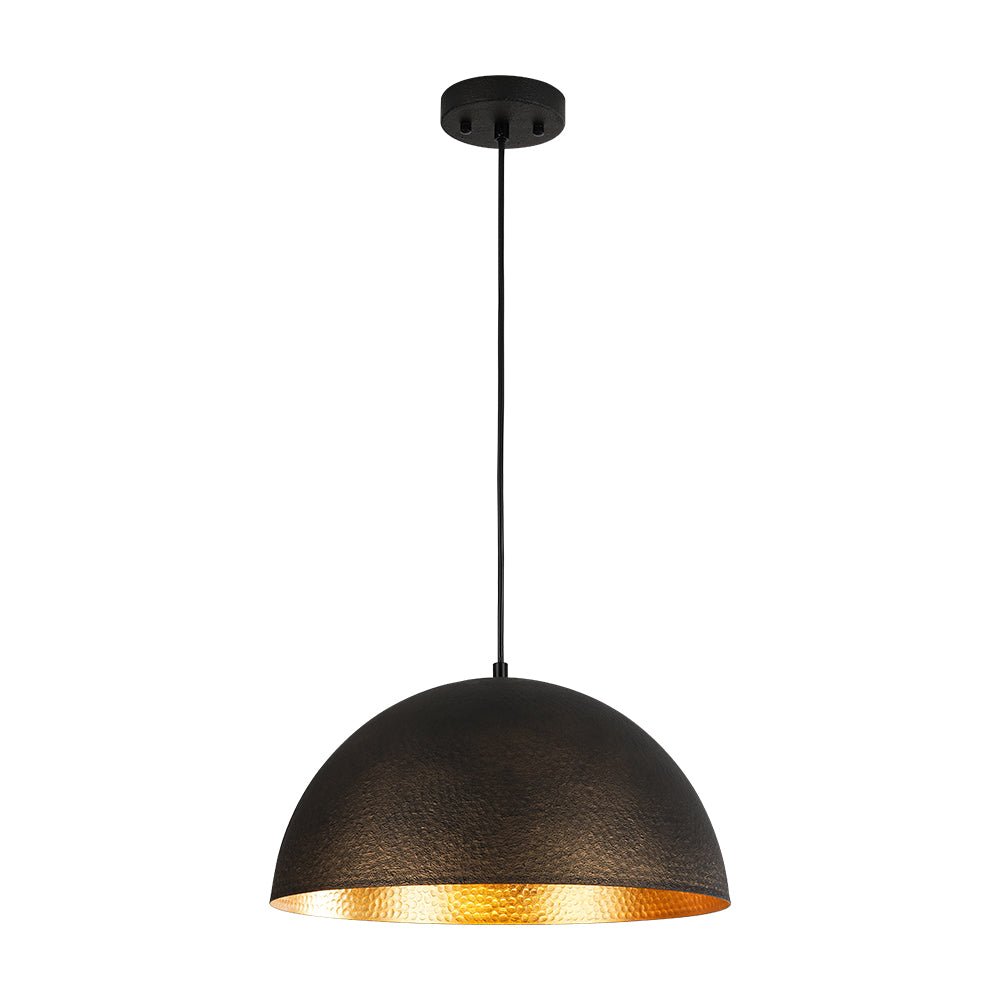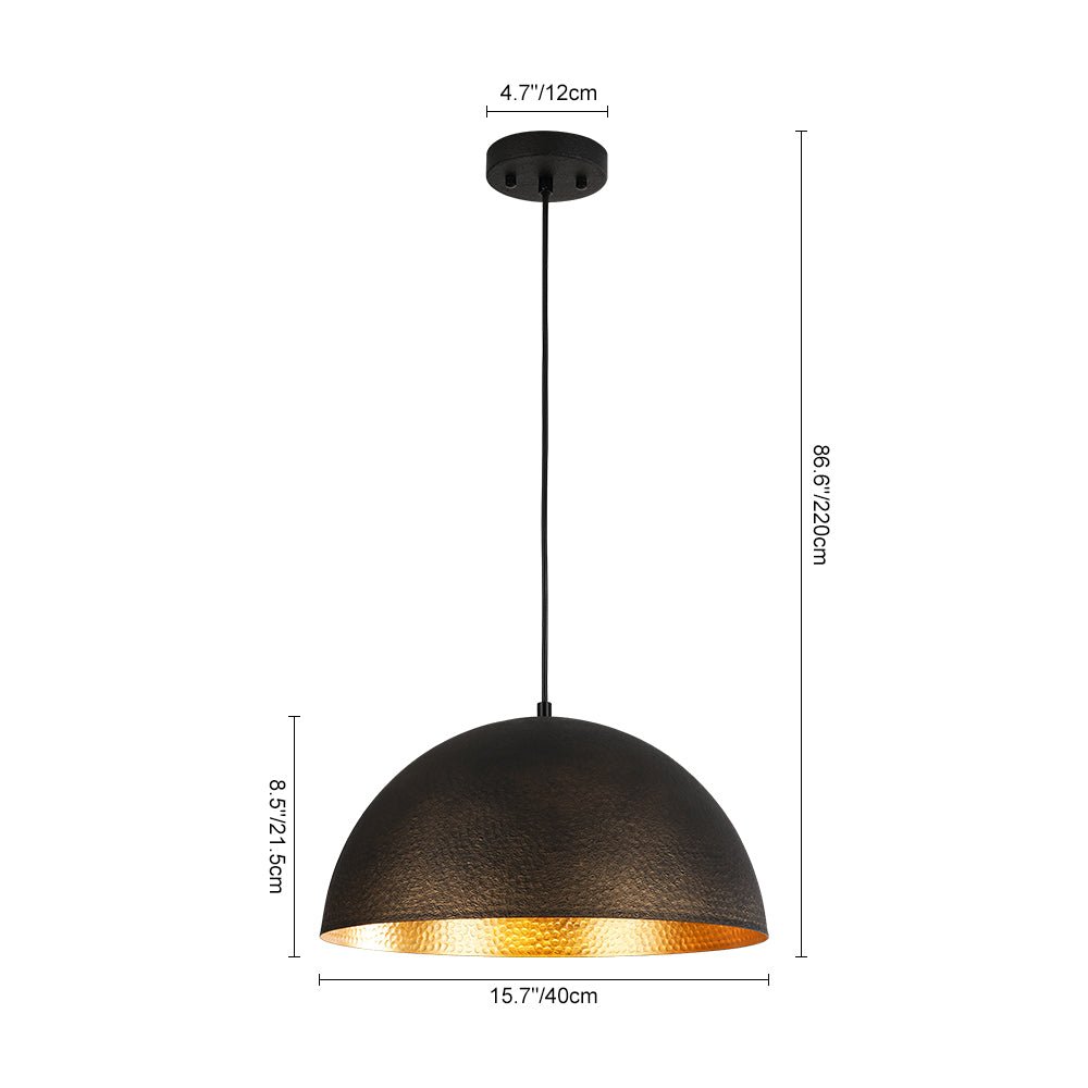 A refined take on simple design for timeless appeal, this large metal dome kitchen pendant light effortlessly blends modern farmhouse charm with traditional sophistication. The wide iron dome shade features a textured black finish accented with subtle gold tones and a delicate hammered surface, adding depth and industrial elegance. Inside, the gold leaf lining radiates a glam shabby-chic character that elevates its retro charm and gently enriches the warmth when illuminated. Ideal for kitchen islands, dining spaces, entryways, bathrooms, or living spaces, installing multiple dome pendants creates a cohesive, stylish look while maintaining a welcoming and comfortable atmosphere.