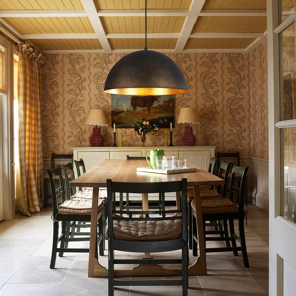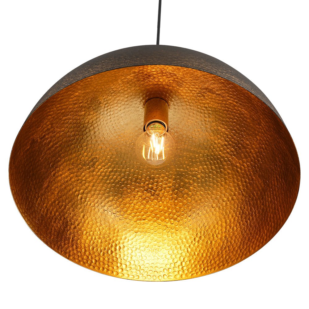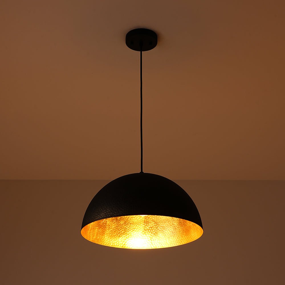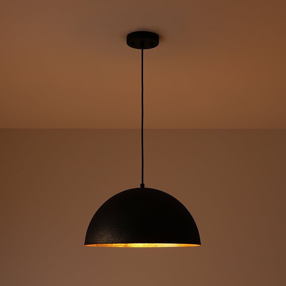 A refined take on simple design for timeless appeal, this large metal dome kitchen pendant light effortlessly blends modern farmhouse charm with traditional sophistication. The wide iron dome shade features a textured black finish accented with subtle gold tones and a delicate hammered surface, adding depth and industrial elegance. Inside, the gold leaf lining radiates a glam shabby-chic character that elevates its retro charm and gently enriches the warmth when illuminated. Ideal for kitchen islands, dining spaces, entryways, bathrooms, or living spaces, installing multiple dome pendants creates a cohesive, stylish look while maintaining a welcoming and comfortable atmosphere.