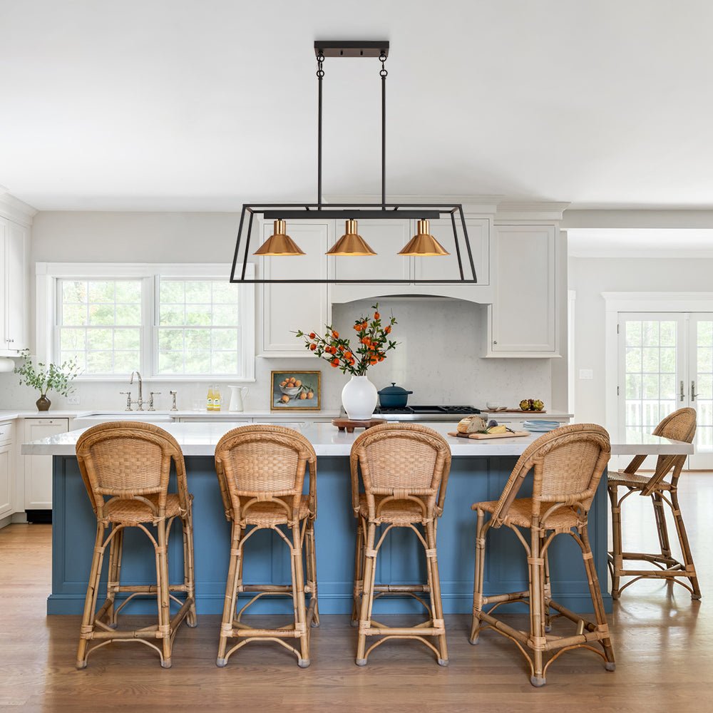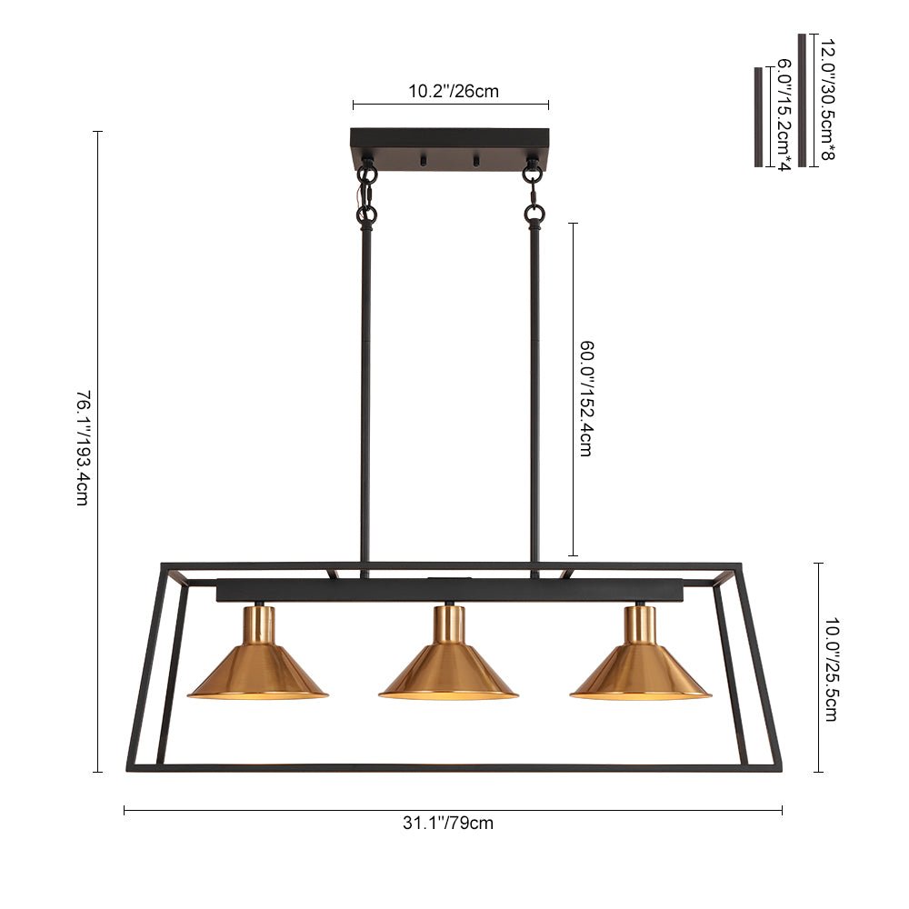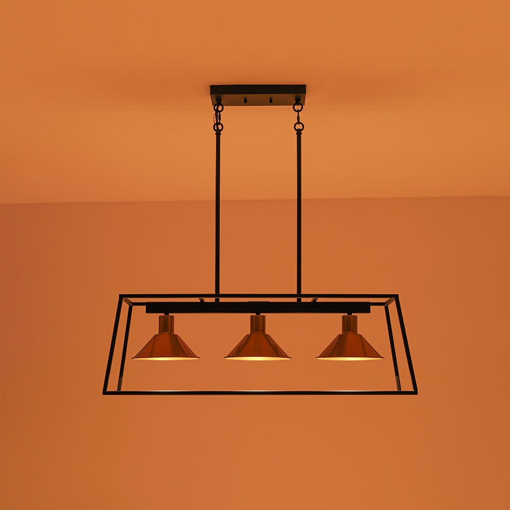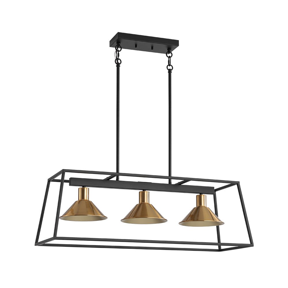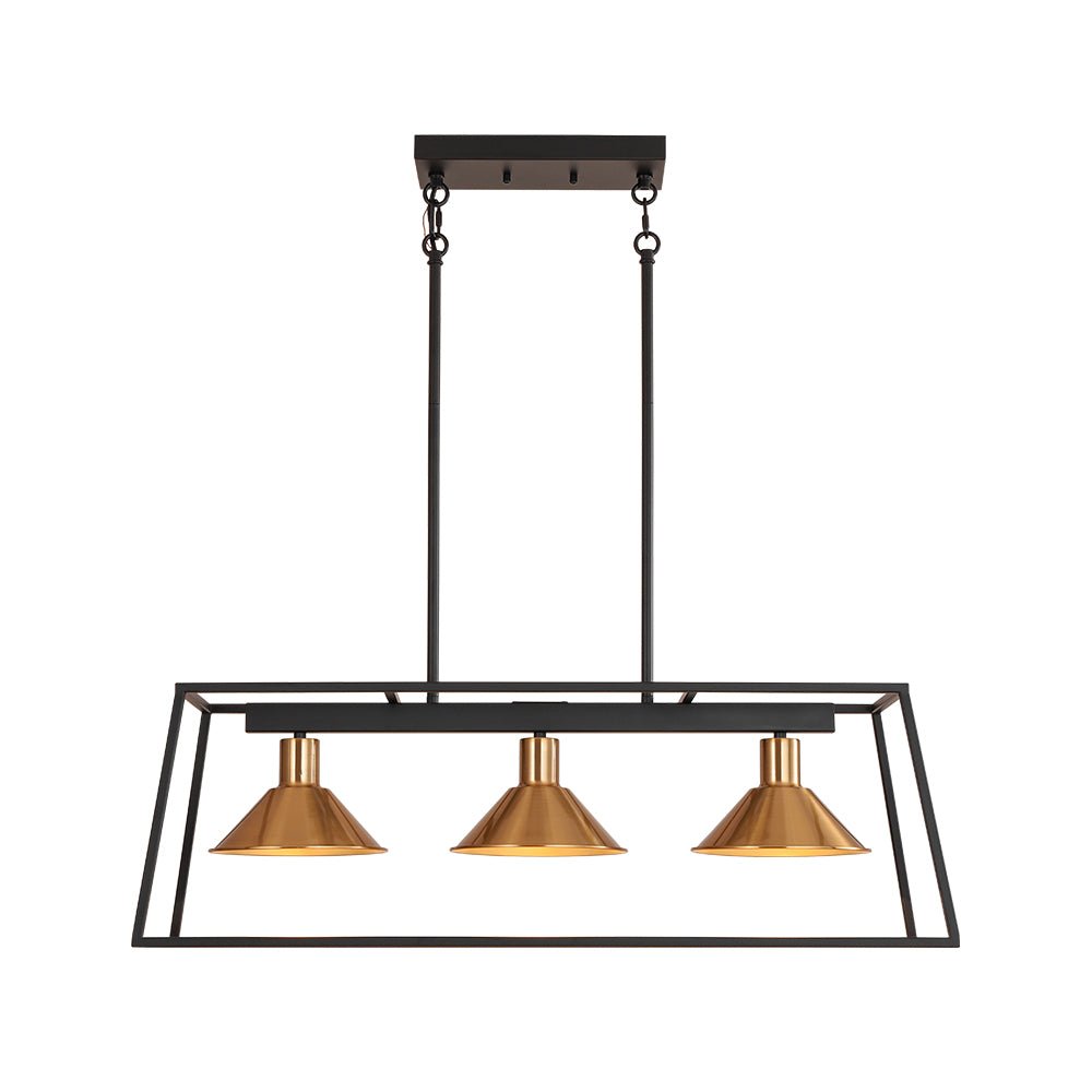 Designed for kitchen islands, long tables, or wide living spaces, this 3-light island chandelier blends modern farmhouse aesthetics with contemporary charm. Crafted from durable metal, it features an open, wide trapezoidal box finished in matte black, exuding a sleek industrial flair. Within the airy cage, three conical shades in a warm brass finish evoke a playful trumpet-inspired design, adding a touch of mid-century modern allure and a subtle shine for highlighting the design. Perfect for making your space stand out without overpowering it, this linear rectangular cage chandelier complements a variety of interior styles, from vintage and modern mid-century to contemporary.