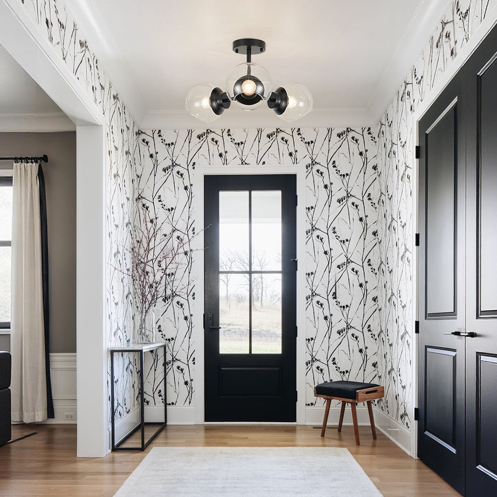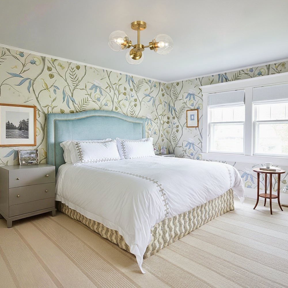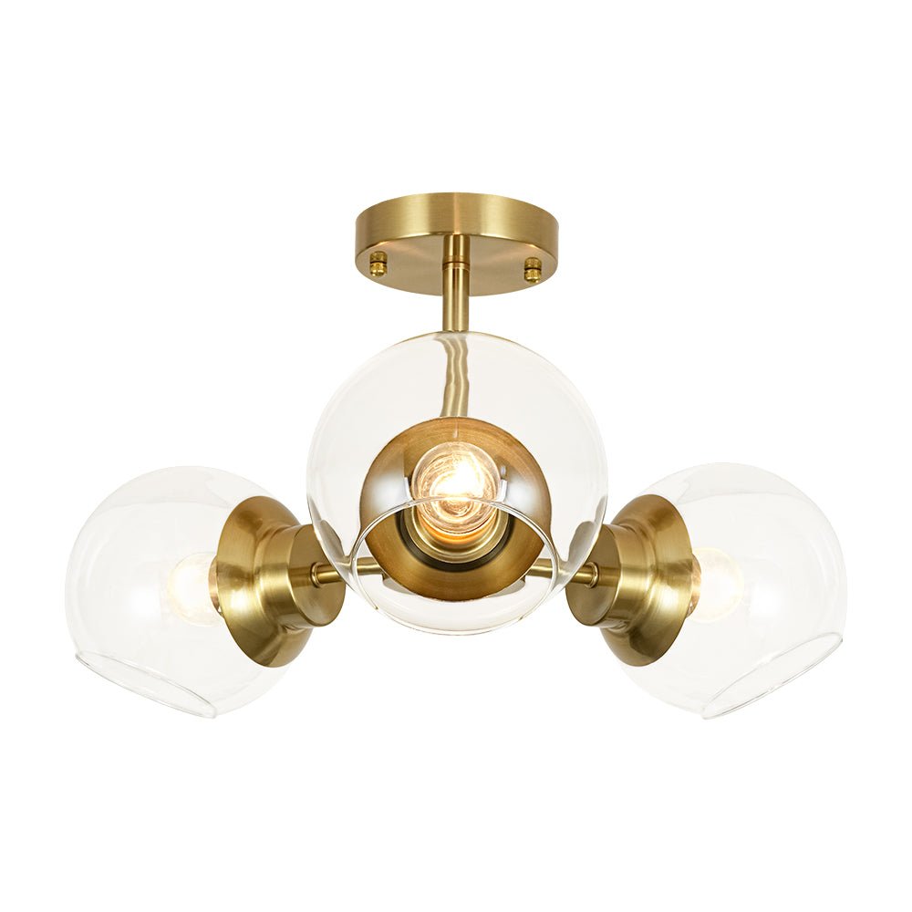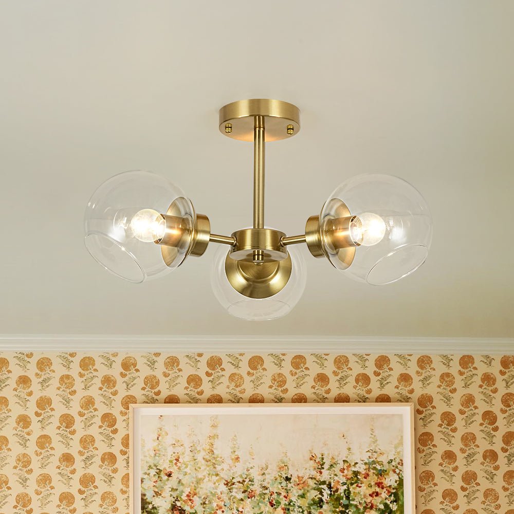 Blending classic Sputnik charm with a clean, minimalist aesthetic, this 3-light glass semi-flush mount brings timeless character to any space. Three short arms extend from a round central hub, each topped with a clear glass globe that appears to float like a delicate bubble, creating a light and airy visual effect. The matte black finish delivers understated contemporary appeal, while the brushed brass option captures effortless mid-century elegance with a subtle retro touch. Ideal for entryways, kitchens, dining rooms, living rooms, bedrooms, or bathrooms, this glass globe Sputnik ceiling light adds refined style and bright, welcoming illumination to your home.