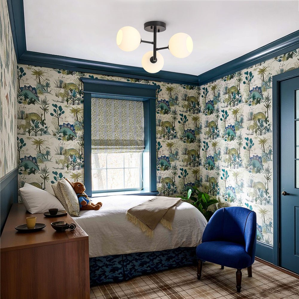 A refined interpretation of the classic Sputnik design, this 3-light semi flush mount showcases a graceful three-tiered structure that creates a staggered silhouette with a sense of rounded balance. Three short arms extend in varying directions, each crowned with a frosted ribbed glass globe with open design. The milky glass softly diffuses light into a warm, inviting glow, while the fine ribbed texture lends dimensional elegance and sculptural charm. Finished in matte black, this tiered bubble ceiling light brings understated sophistication and a modern edge. Perfect for illuminating an entryway, kitchen, dining room, living room, bedroom, kids room, or bathroom, this white ribbed glass sputnik ceiling light infuses any space with artistic allure and balanced radiance.