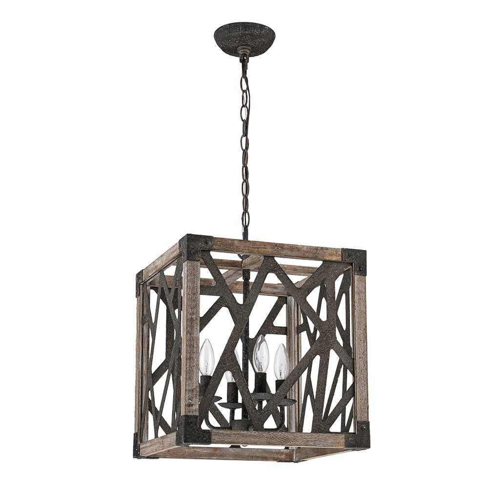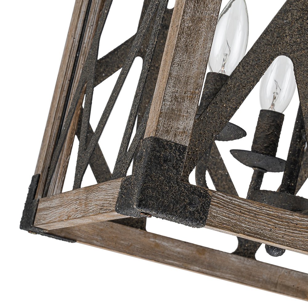 Four Lights ⢠Rustic Wood ⢠Square Cage ⢠Candle Style ⢠Distressed Rust-Like Finish ⢠E12 Candelabra Bulbs (Not Included) ⢠Hardwired ⢠ETL