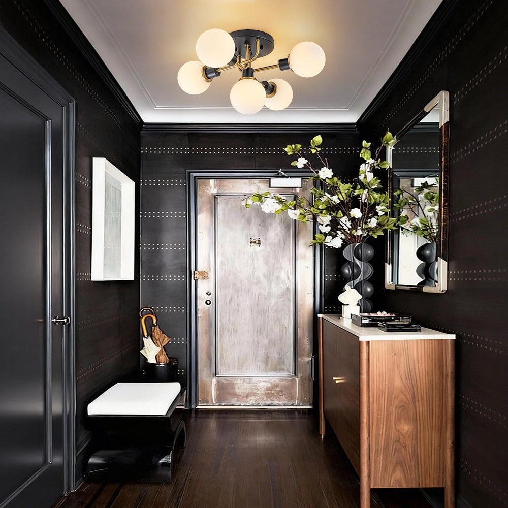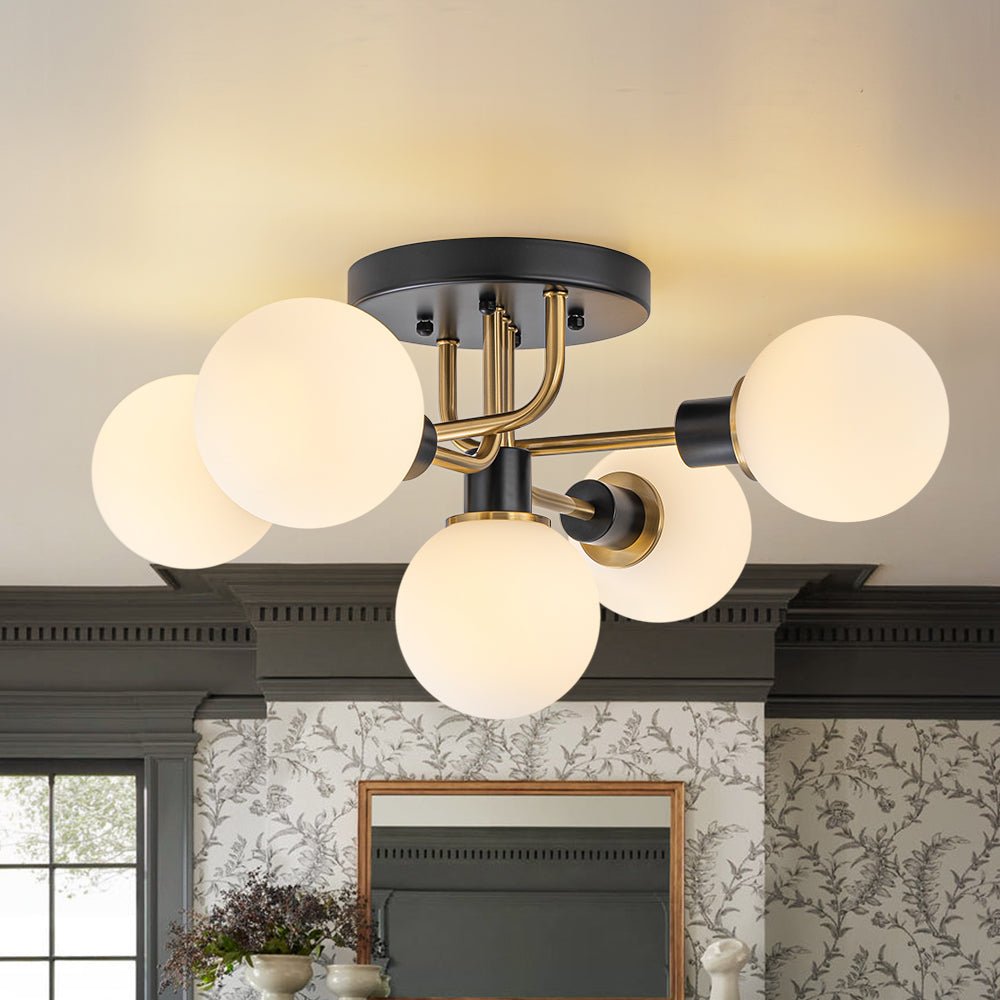 Evoking the charm of floating bubbles, this 5-light Sputnik semi-flush mount brings chic mid-century style to any room. Crafted from durable metal, this bubble ceiling light features multi-directional angled arms creating an asymmetrical yet balanced structures full of geometric and dynamic beauty. Clear glass orbs offer direct, airy illumination, while milky white globes provide a warm, cozy glow. Matte black accented with brushed brass creates a timeless combination that complements any interior style. Perfect for entryways, bathrooms, dining rooms, bedrooms, living rooms, or foyers, this sputnik light fixture delivers a striking presence while conserving valuable space.