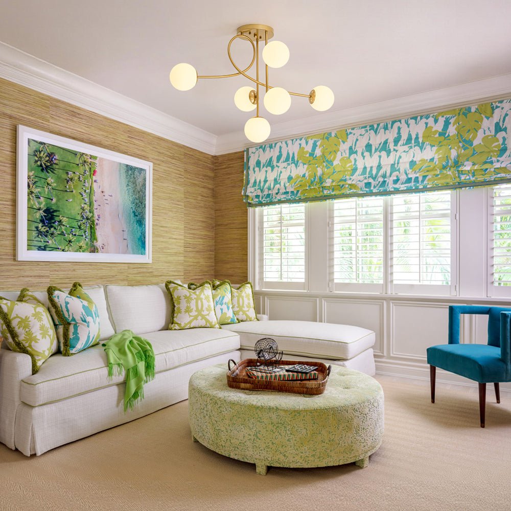 Add striking elegance to stand out your space with our 6-light glass globe semi flush mount. Sculptural in form, one sweeping arm undulates in a graceful parabola, lending movement and visual drama like the cresting arc of a roller coaster in motion. Each arm supports two opal glass globe, the milky white finish softly diffusing light into a warm and inviting glow that bathes the room in ambiance. The warm brass finish accentuates the mid-century aesthetic, seamlessly blending vintage appeal with contemporary refinement. Designed for modern living, this sputnik ceiling light becomes a captivating focal point without overpowering your dƩcor, ideal for an entryway, dining room, living room, bedroom, bathroom, or kids room.