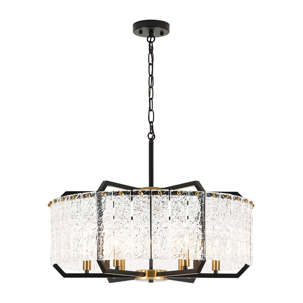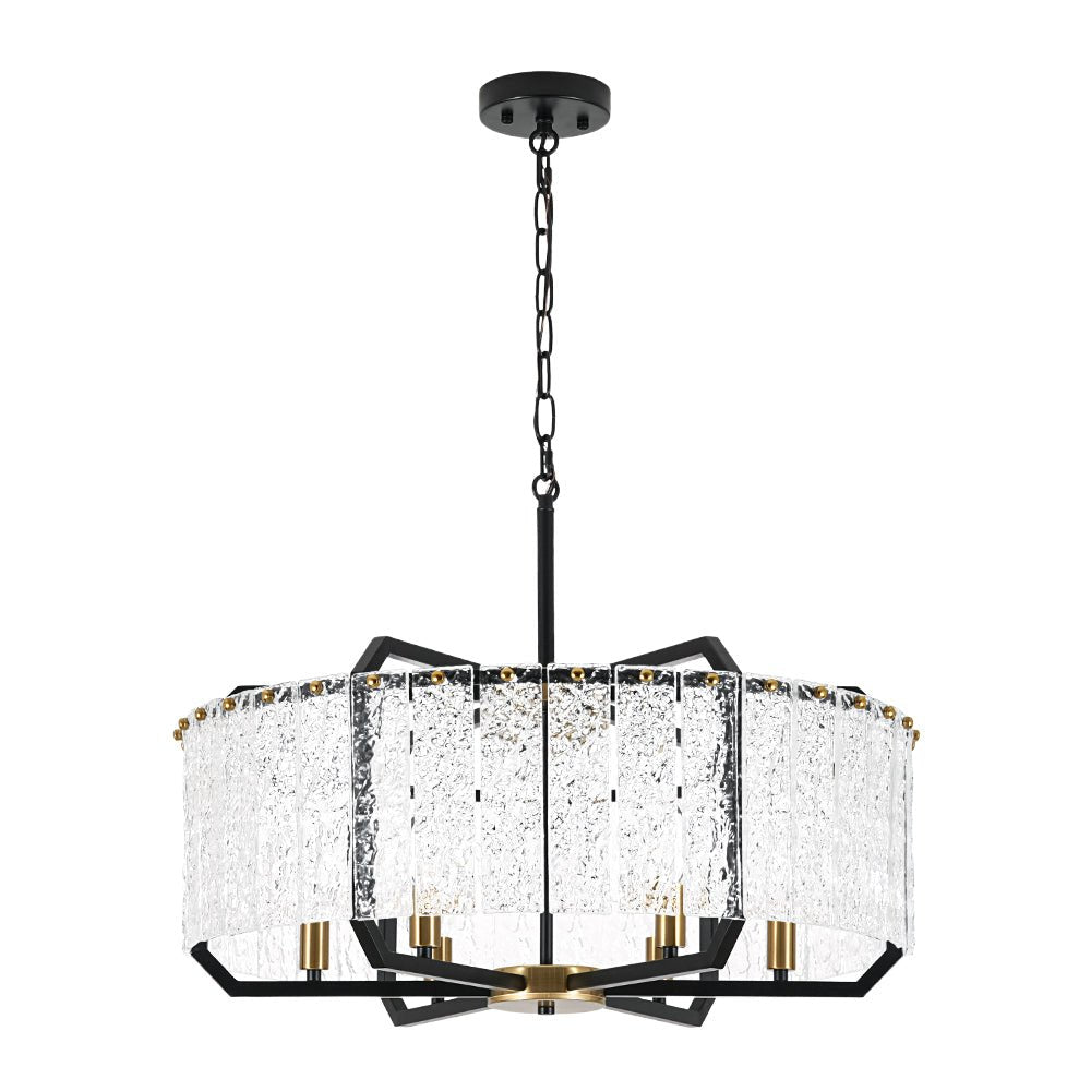 Six Lights ⢠Clear Rippled Glass ⢠Drum Design ⢠Candle Style ⢠Matte Black + Aged Brass ⢠E12 Candelabra Bulbs (Not Included) ⢠Hardwired ⢠ETL