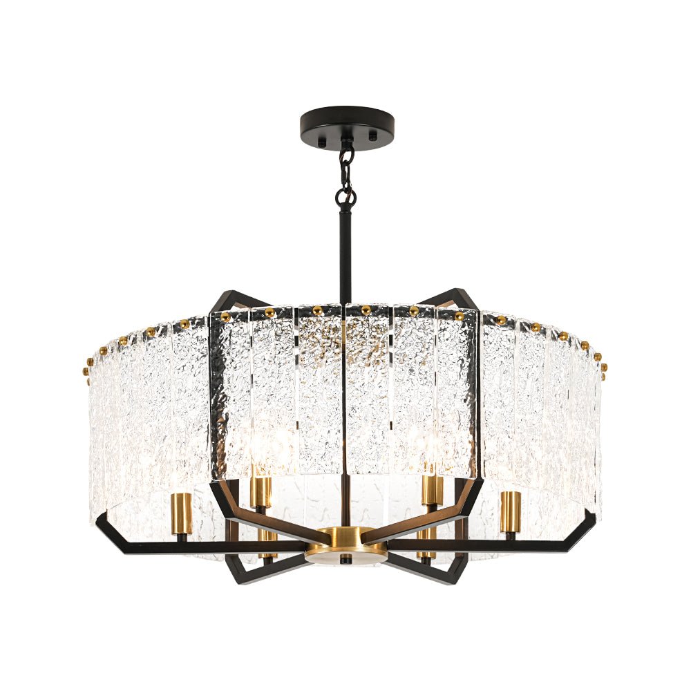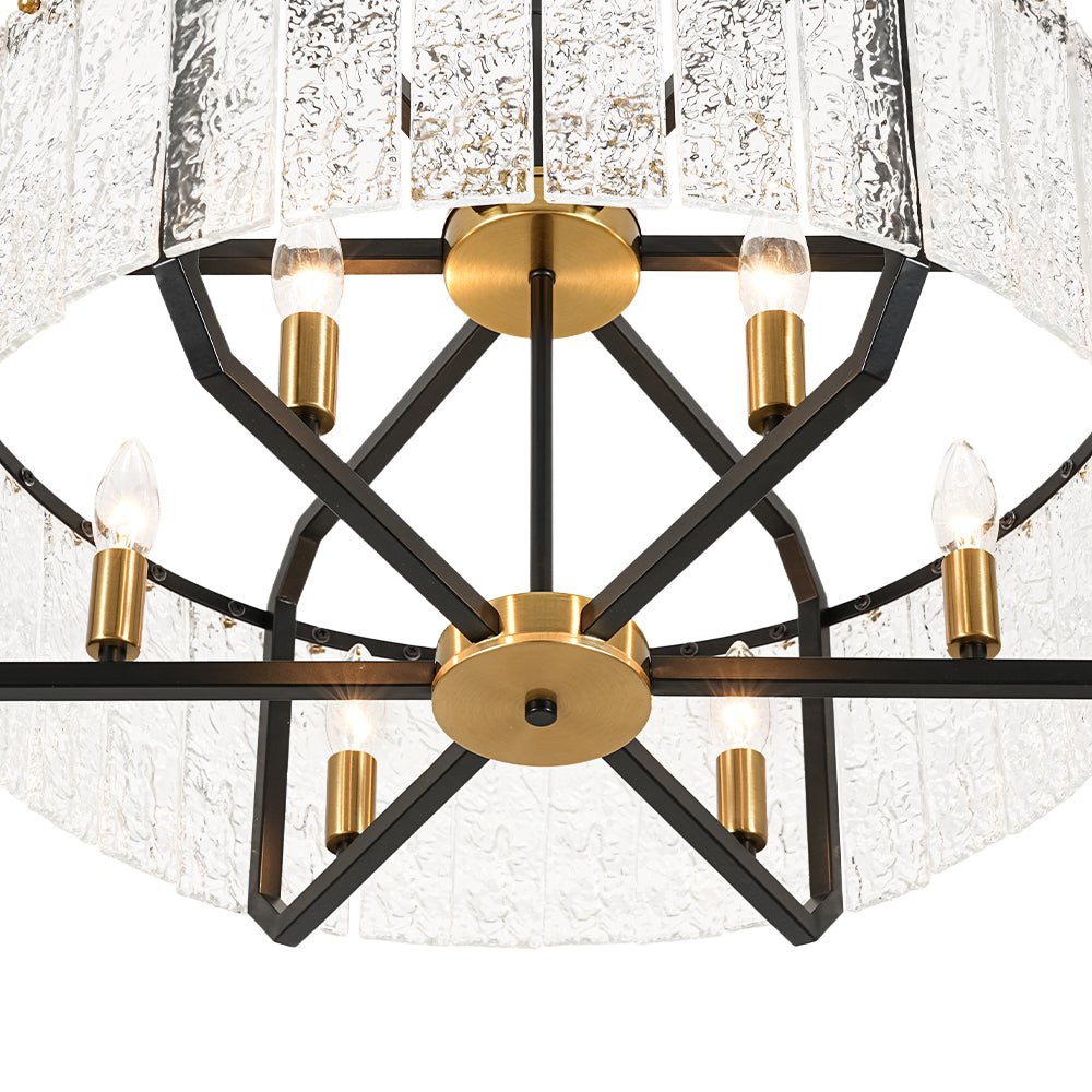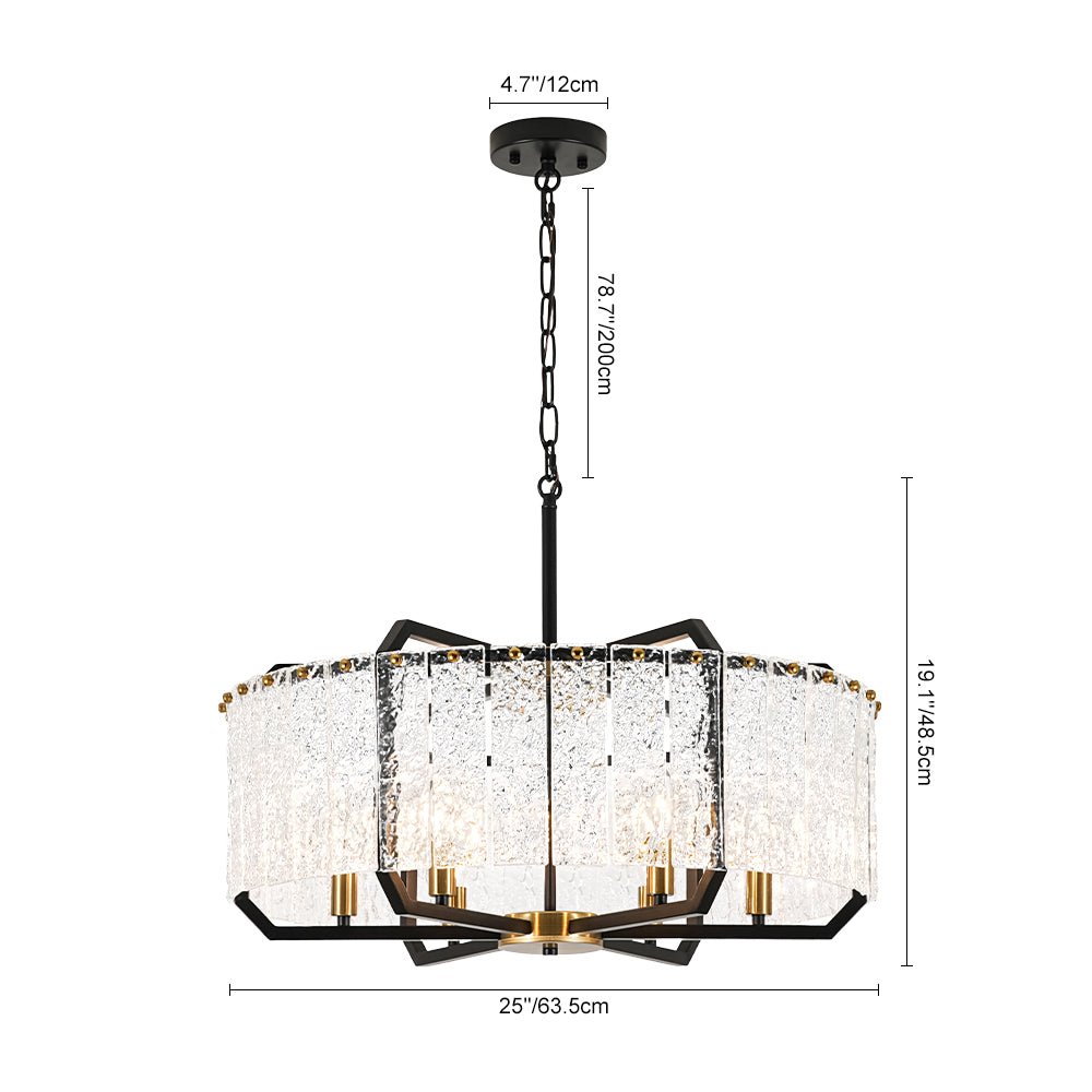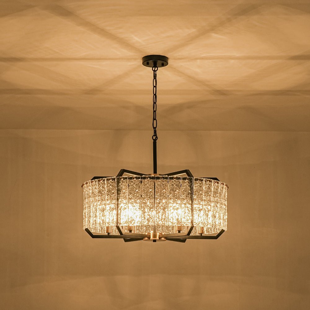 This round lantern chandelier showcases a wide, drum-inspired silhouette crafted from a sturdy iron frame and accented with clear rippled glass panels. The water texture introduces subtle retro character while adding depth and dimension to the overall design.Ā Inside, six brass candle-style sockets accommodate E12 candelabra bulbs (not included), delivering a soft, diffused glow that enhances the ambiance and beautifully contrasts with the matte black open cage. Refined yet understated, this 6-light textured glass drum pendant makes a striking statement in modern interiorsāideal for kitchen islands, dining rooms, entryways, and living spaces.