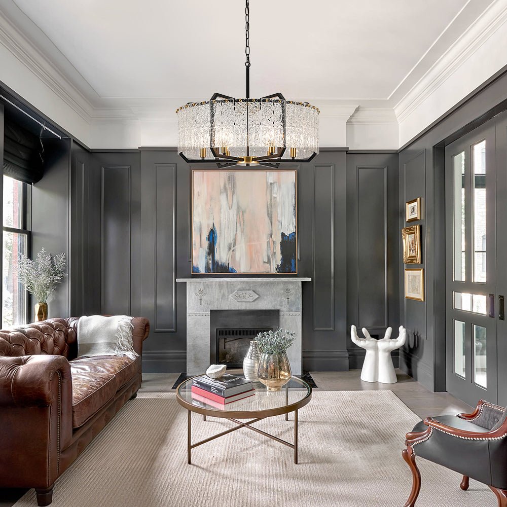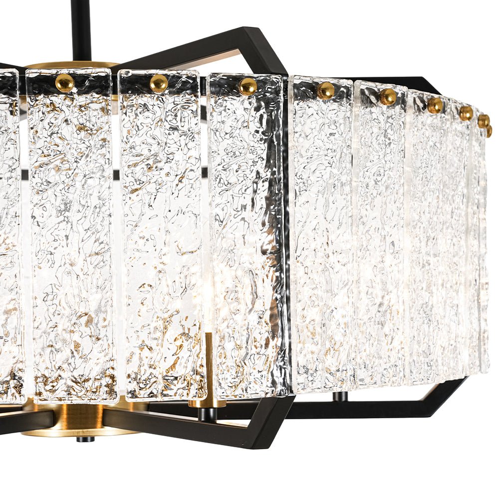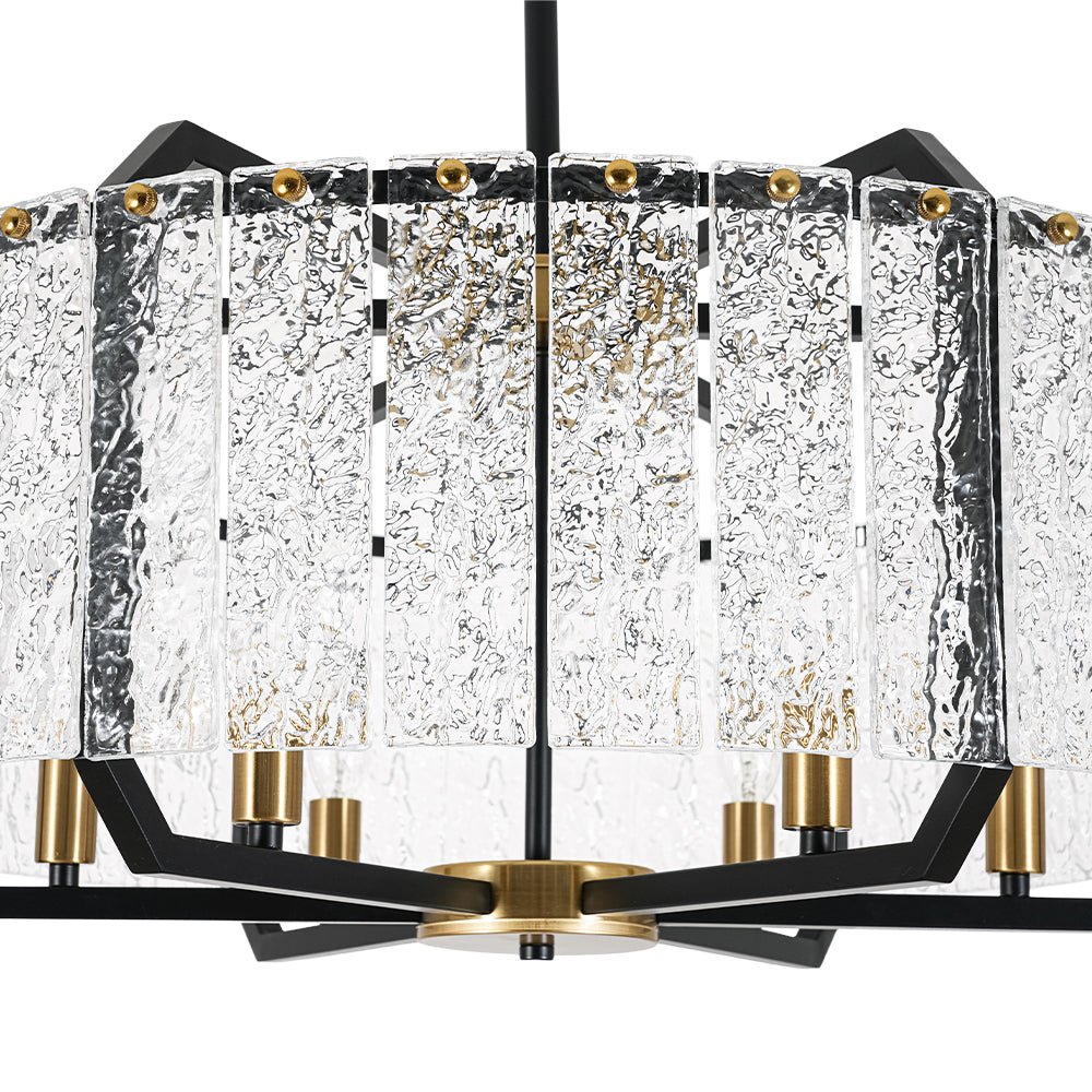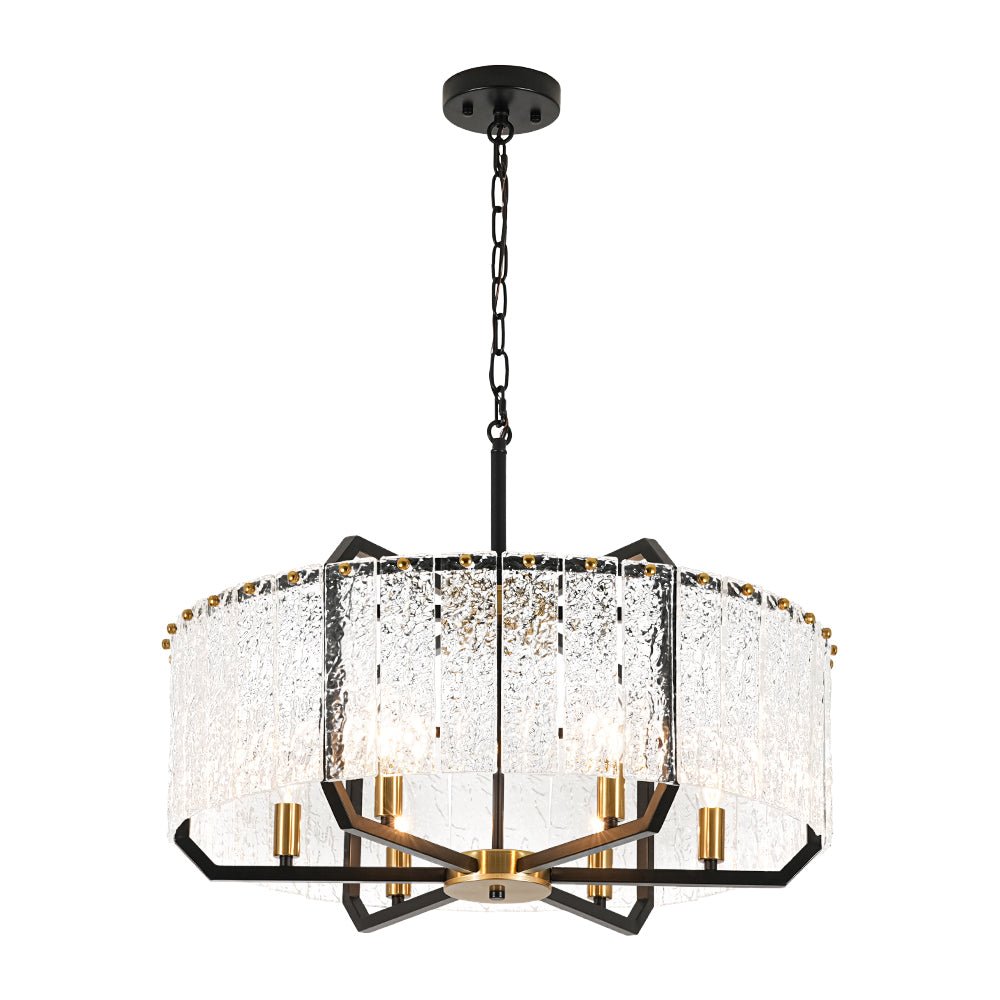 This round lantern chandelier showcases a wide, drum-inspired silhouette crafted from a sturdy iron frame and accented with clear rippled glass panels. The water texture introduces subtle retro character while adding depth and dimension to the overall design.Ā Inside, six brass candle-style sockets accommodate E12 candelabra bulbs (not included), delivering a soft, diffused glow that enhances the ambiance and beautifully contrasts with the matte black open cage. Refined yet understated, this 6-light textured glass drum pendant makes a striking statement in modern interiorsāideal for kitchen islands, dining rooms, entryways, and living spaces.