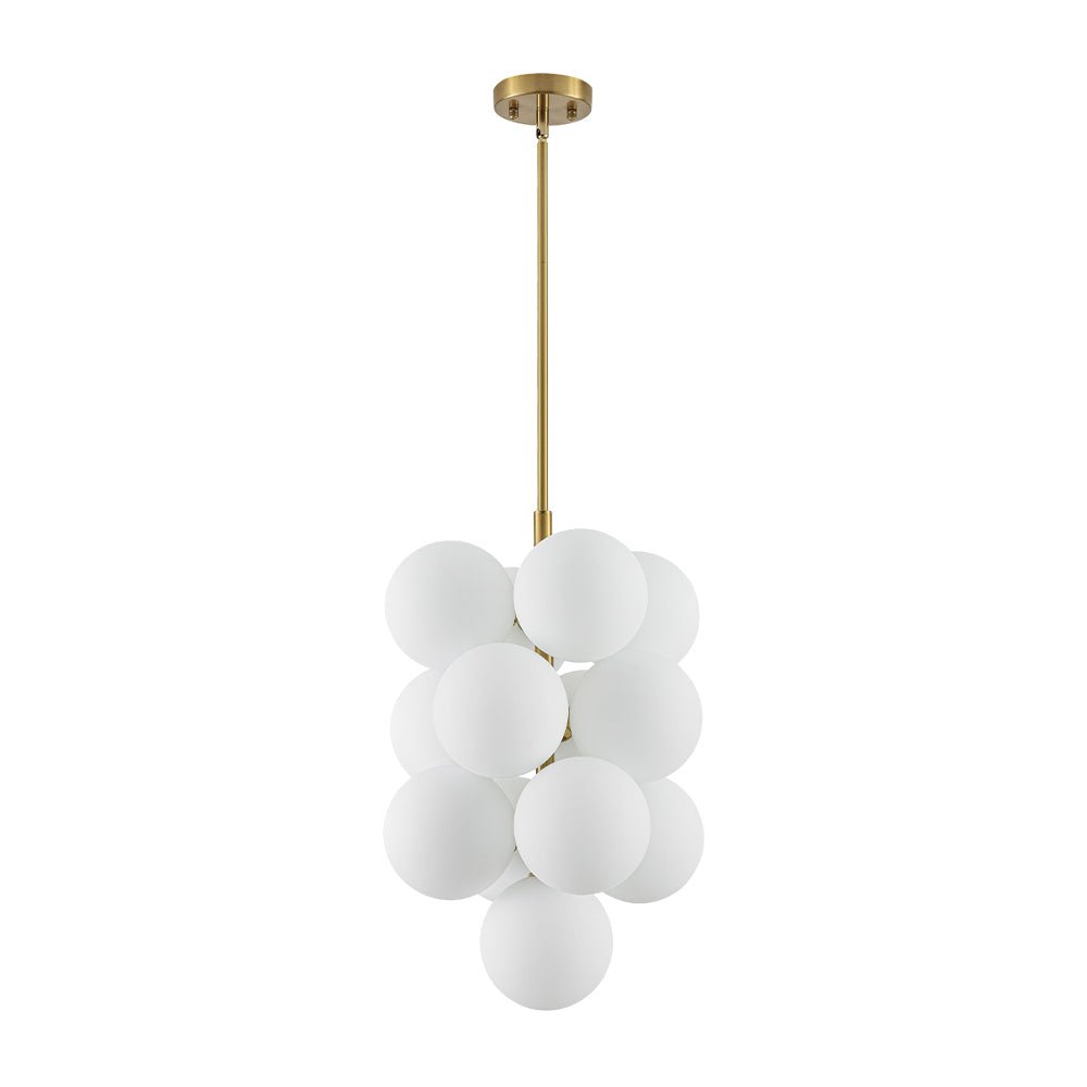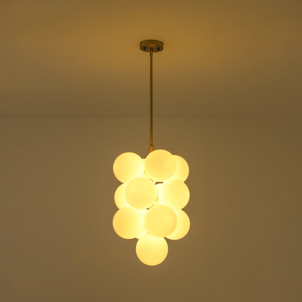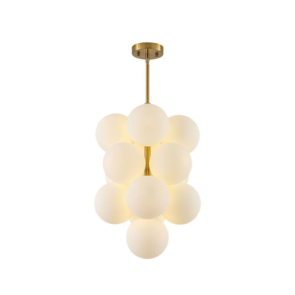 Highlight your space with this 13-light cluster globe chandelier, a striking balance of whimsy and refined elegance. Inspired by cascading wisteria blooms, the design features opal glass spheres artfully gathering at layered heights, creating depth, movement, and a sculptural presence. When illuminated, the milky white globes softly diffuse the light, casting a warm, glare-free glow. A rich brass finish enhances its mid-century modern appeal while adding a touch of understated luxury. Ideal for living rooms, dining areas, bathrooms, bedrooms, foyers, entryways, or lobbies, this cluster white glass bubble chandelier brings glamorous decorative impact and contemporary charm without overpowering the space.