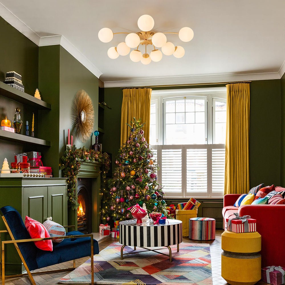 An opulent fusion of classic Sputnik and elegant bubble design, this 12-light semi-flush chandelier features gracefully curved arms cascading from the back of a medal-like base to support alluring milky white glass globes, like a beautiful blossom firework. Warm cozy lighting sweeps down to your space when we turn on this glass globe sputnik chandelier, flowing through frosted glass bubbles and the luxe brass frame with elegance. Perfect to add artful charm and sophisticated beauty to your home decor, this 12-light opal glass bubble chandelier funky chandelier is the best enhancement to a living room, dining room, entryway, bedroom, or lobby.