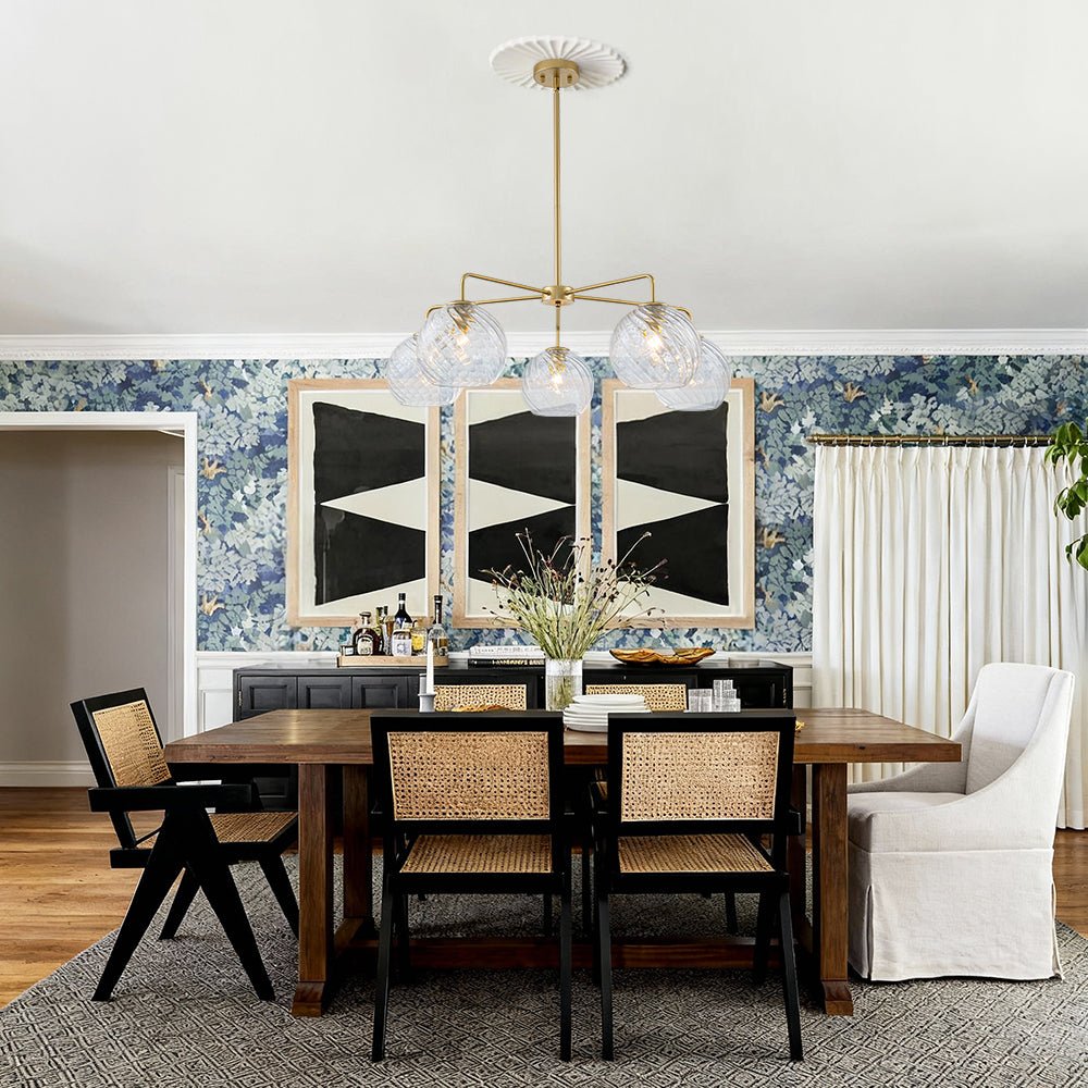 Blending the playful spirit of mid-century sputnik design with contemporary clean-lined style, this 5-light round sputnik chandelier brings both elegance and brightness to your space. Five right-angled arms extend evenly outward, each cradling an open-mouth clear glass globe. The highlight is its gradient blue glass shades, which shift from a soft tint to crystal clarity, evoking a serene, coastal-inspired ambiance, perfect for relaxed modern, Scandinavian, or lake house interiors. This design creates a refreshing sense of lightness while ensuring ample illumination. Ideal for living rooms, dining areas, stairwells, entryways, bathrooms, or kitchen islands, this gradual blue gloss bubble chandelier becomes a striking centerpiece that feels both modern and poetic without overwhelming the room.