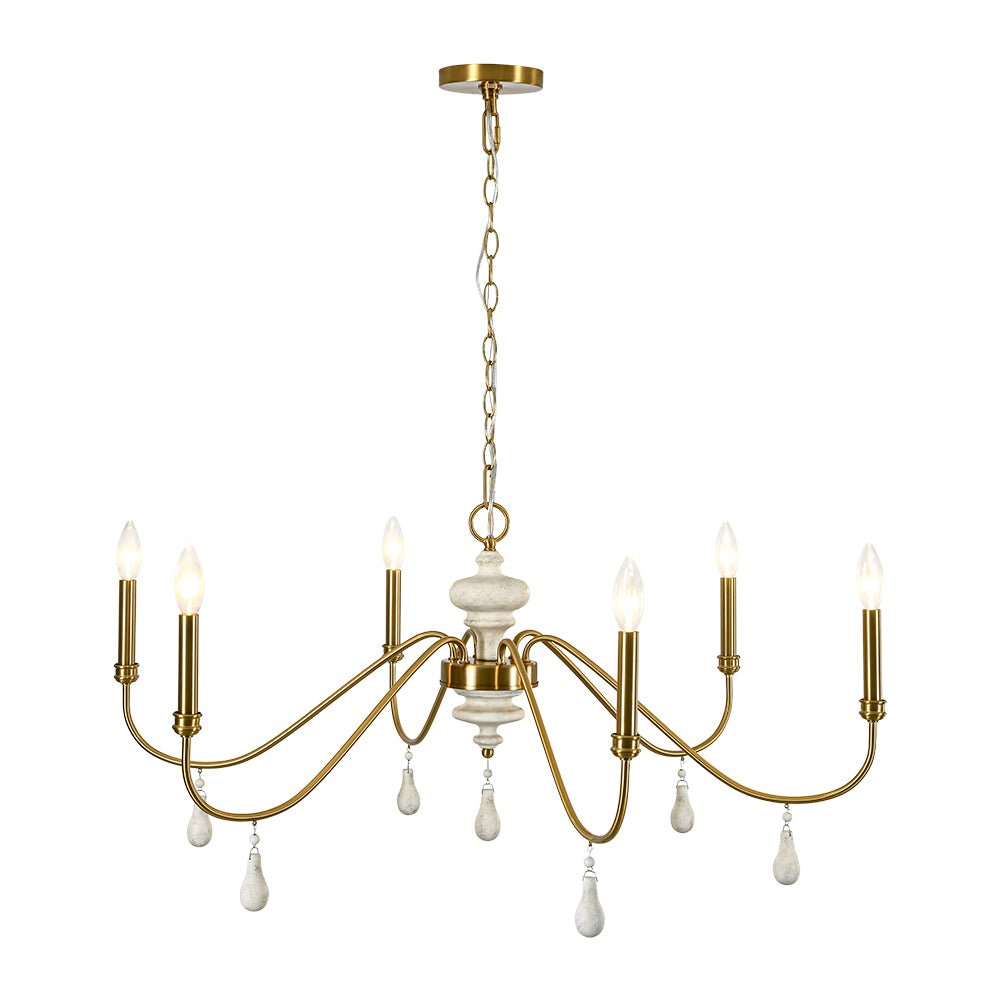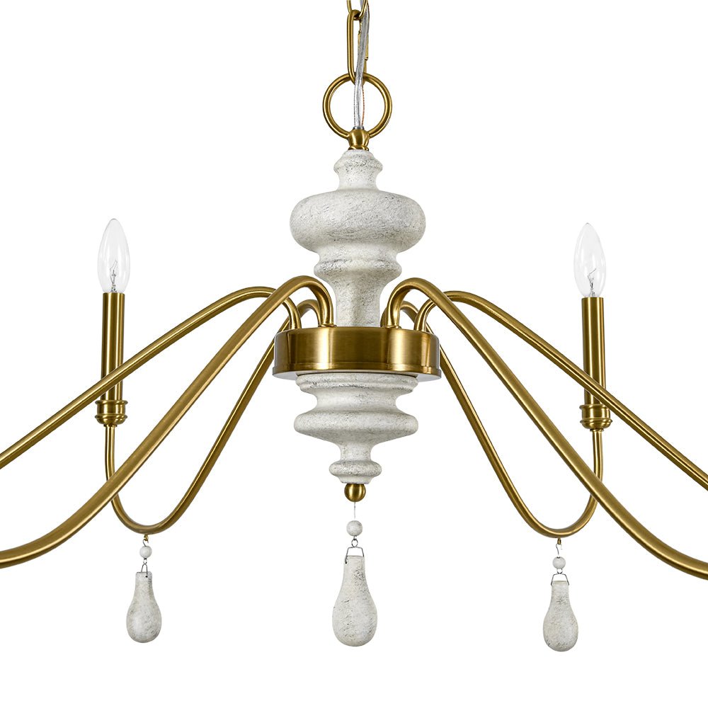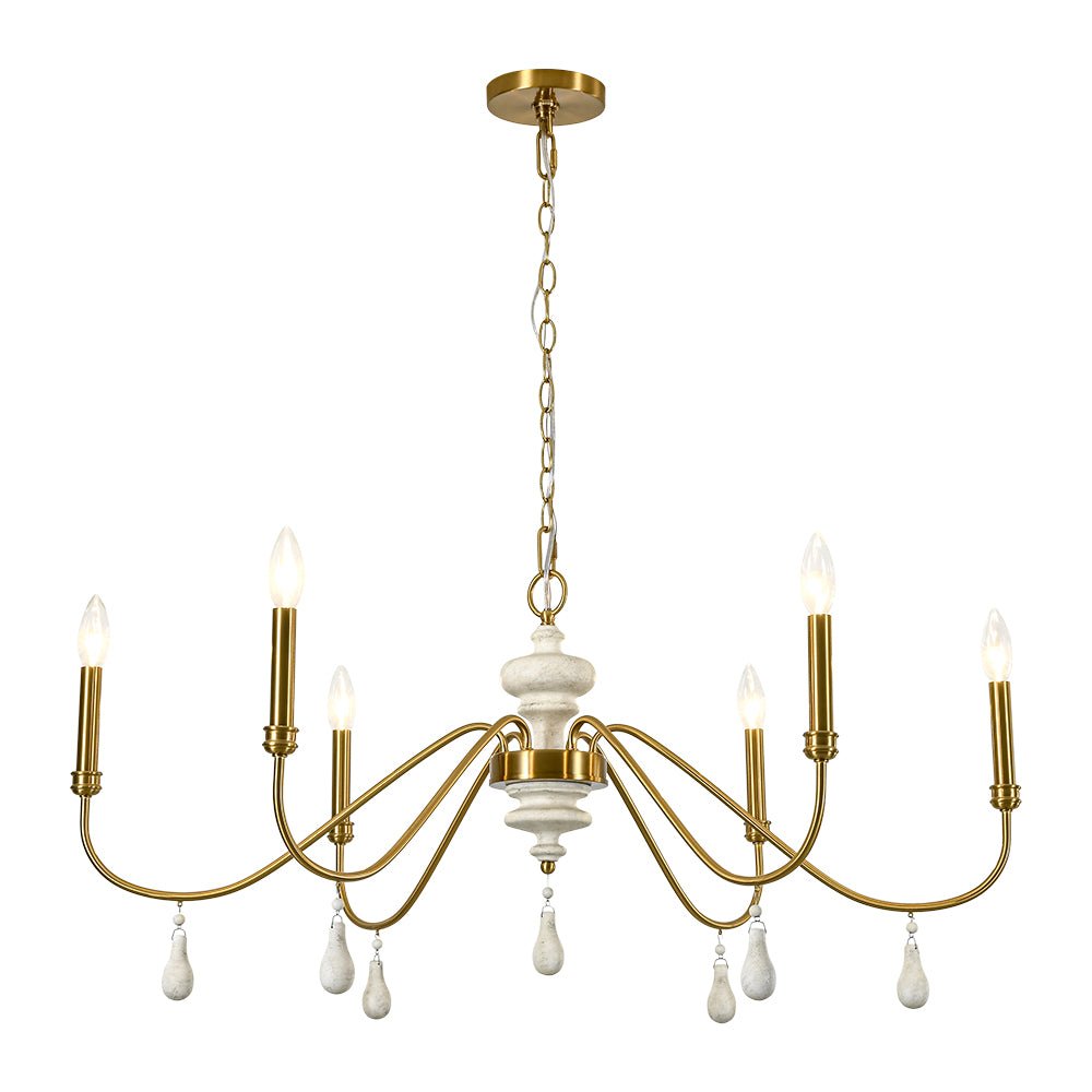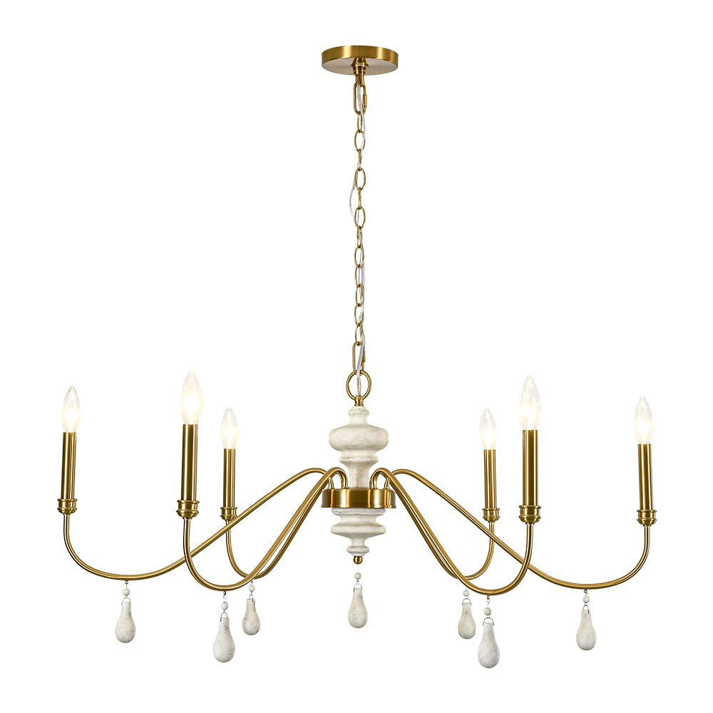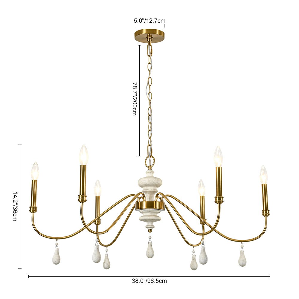Inspired by classic French country design, this 6-light round large chandelier brings timeless elegance and warm character to your space. Crafted of durable iron, gracefully scrolling arms create a simple yet romantic vintage silhouette, finished in antique brass with candle-style detailing for traditional charm. At the center, a distressed white turned wood column adds rustic contrast, while delicate finial drops introduce a hint of shabby chic luxury. Exposed E12 candelabra bulbs (not included) enhance the vintage appeal while delivering direct, functional illumination. Perfect for dining rooms, living areas, foyers, bedrooms, or boutique-style spaces, this glam wide candle style chandelier effortlessly complements French country, farmhouse, and traditional interiors.