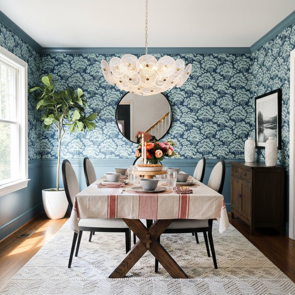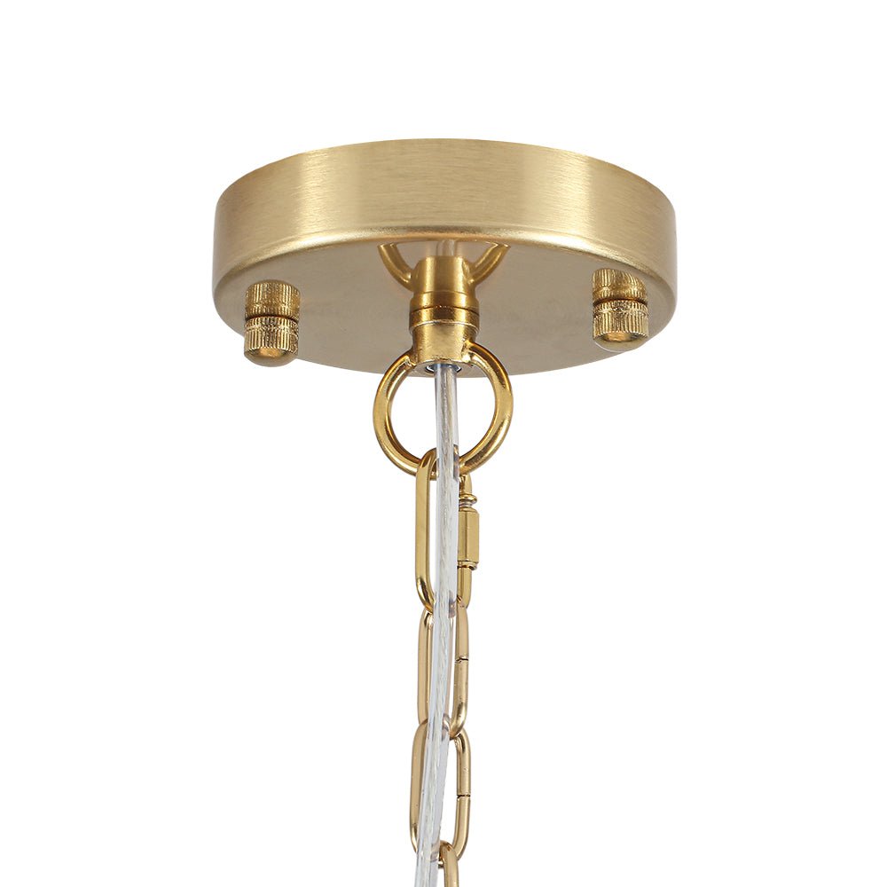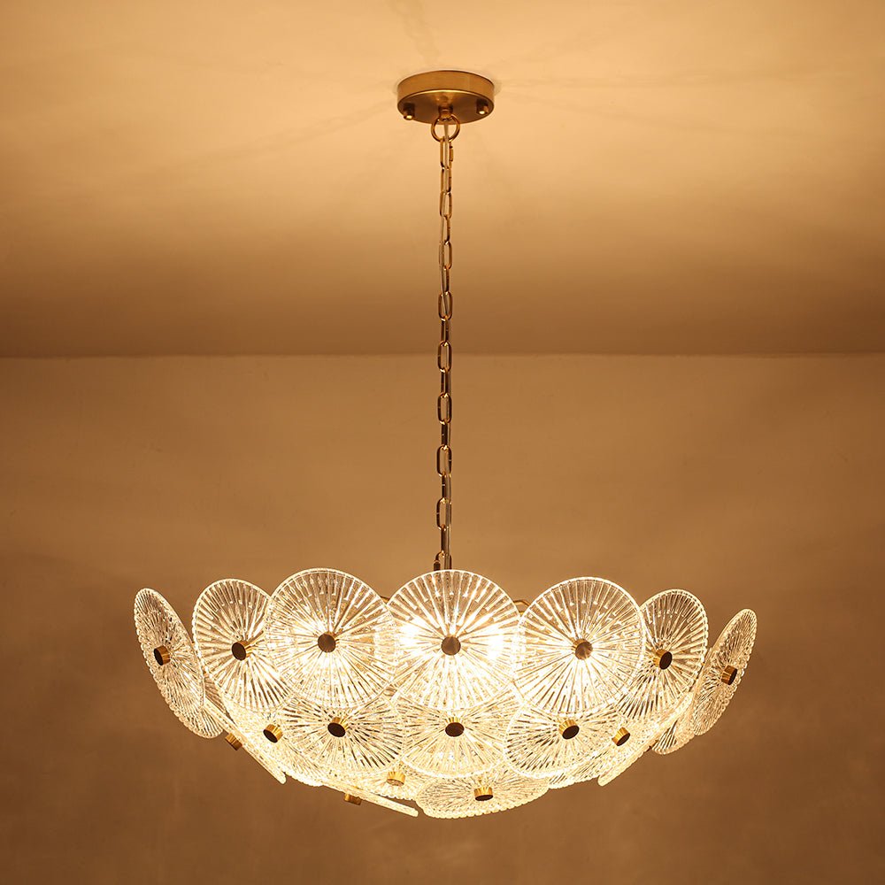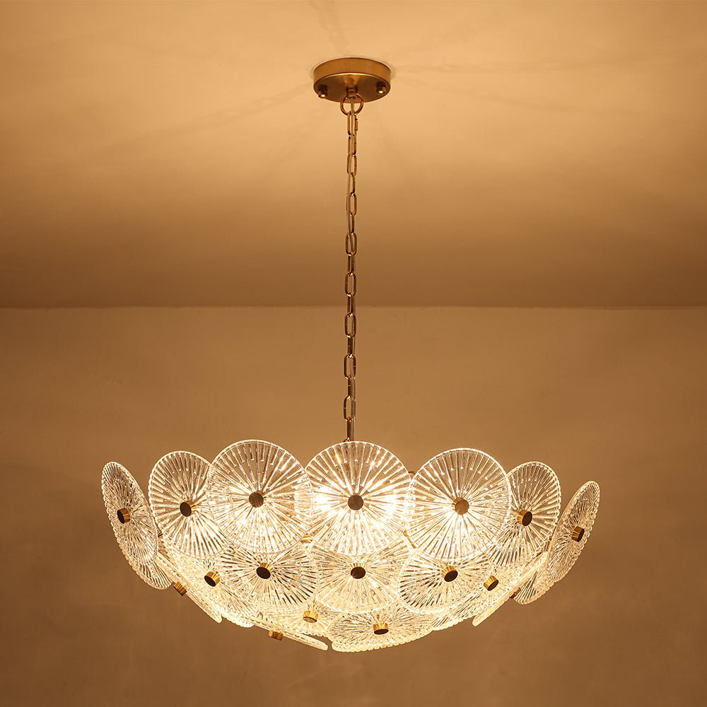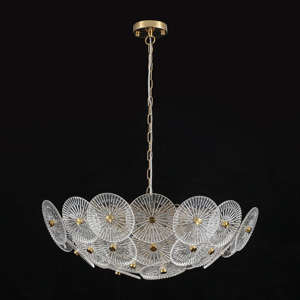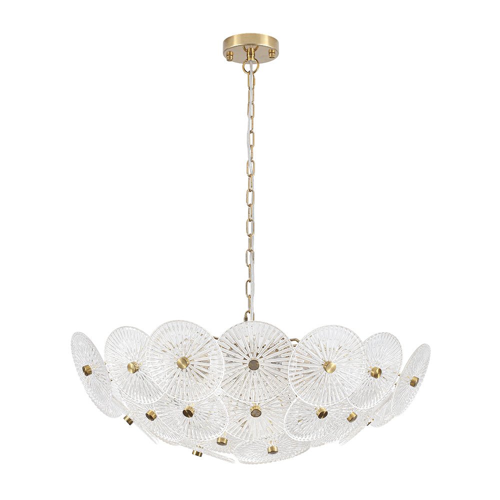 This Art Deco 9-light round glass chandelier features an artful array of clear ribbed glass discs arranged in graceful arches, forming a sculptural basket silhouette. Each ribbed glass round catches and refracts light like crystal petals along a blooming vine, creating the look of a luminous floral basket in full bloom. When illuminated, the layered glass softly diffuses light, casting a warm, ambient glow with subtle sparkle and depth. The brushed brass finish adds a refined mid-century modern luxe touch, balancing glamour with warmth. Striking yet never overwhelming, this ribbed glass flower basket chandelier complements both traditional and contemporary interiors, making it ideal for dining rooms, living spaces, entryways, bedrooms, and boutique commercial settings.