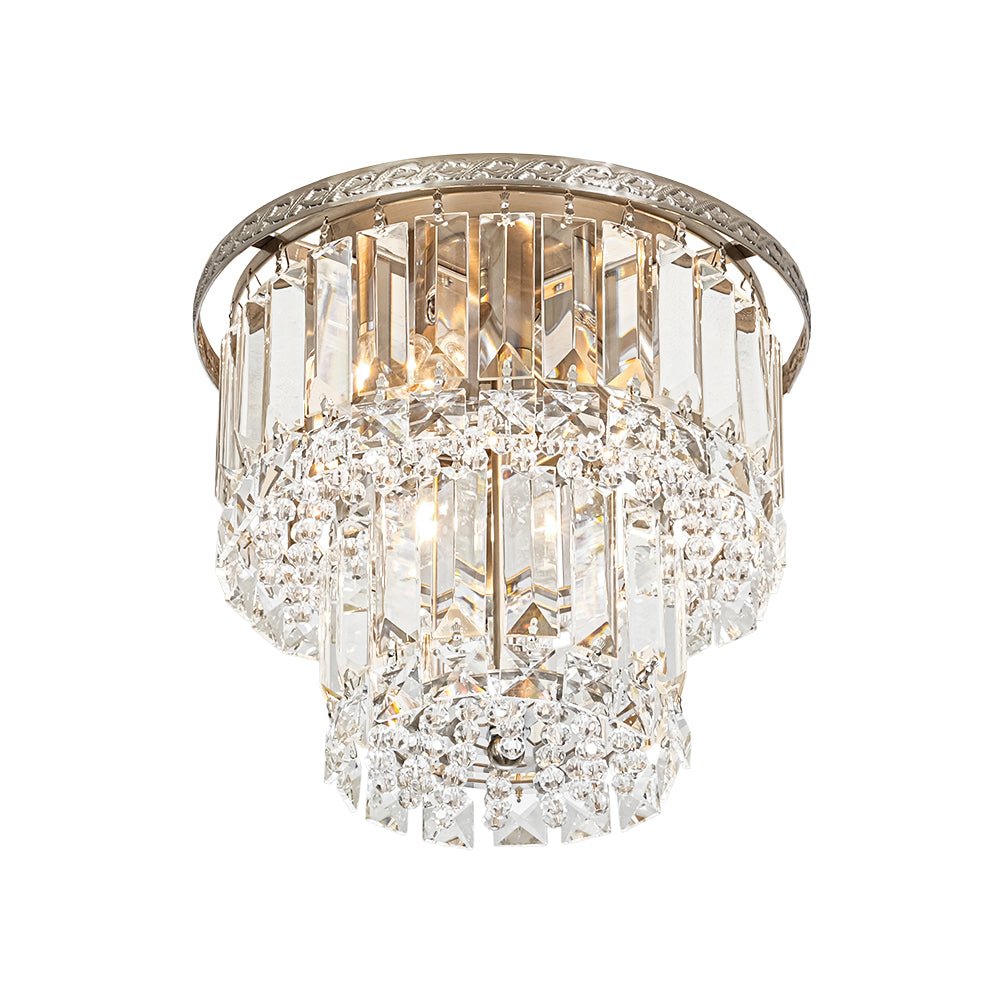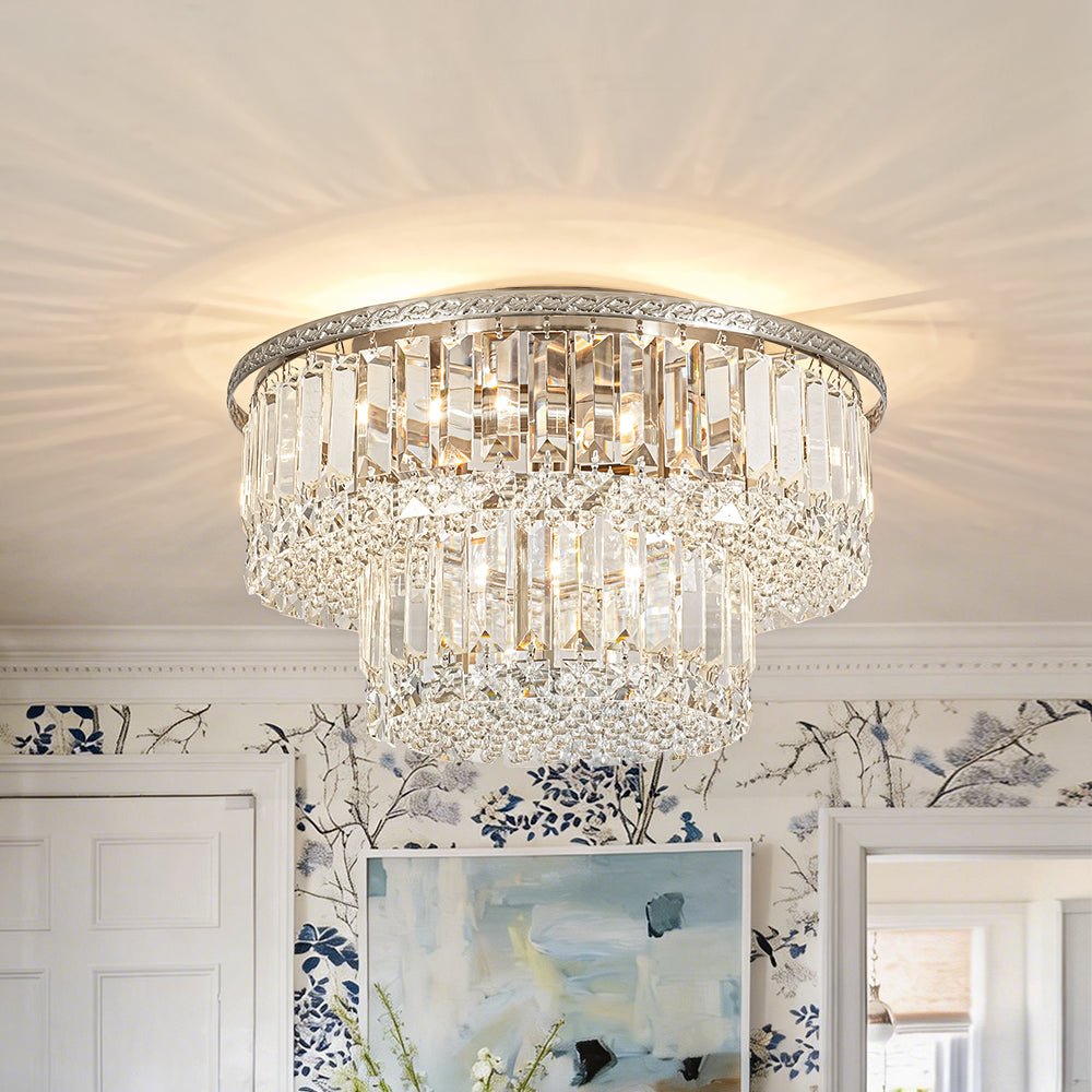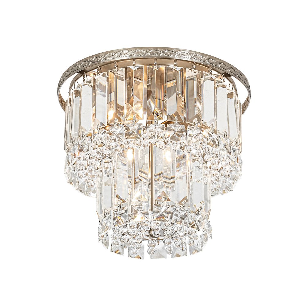 An opulent centerpiece crafted with delicate precision, our dazzling tiered crystal semi-flush chandelier radiates sparkling glamour without overwhelming the space. Featuring a 2-tier drum design, this round ceiling light showcases strands of clear faceted crystals that add dimensional elegance and shimmering refinement. The nickel metal frame features an intricate French botanical-inspired pattern, adding a touch of artisanal elegance and vintage charm to the design. When illuminated, the crystal halo scatters light beautifully, creating a sunburst effect on the ceiling and filling the room with a luxurious, romantic glow. Perfect for entryways, kitchen islands, dining rooms, bathrooms, or living areas, this 2-tier crystal drum semi-flush mount light brings timeless sophistication and luminous charm to any interior.