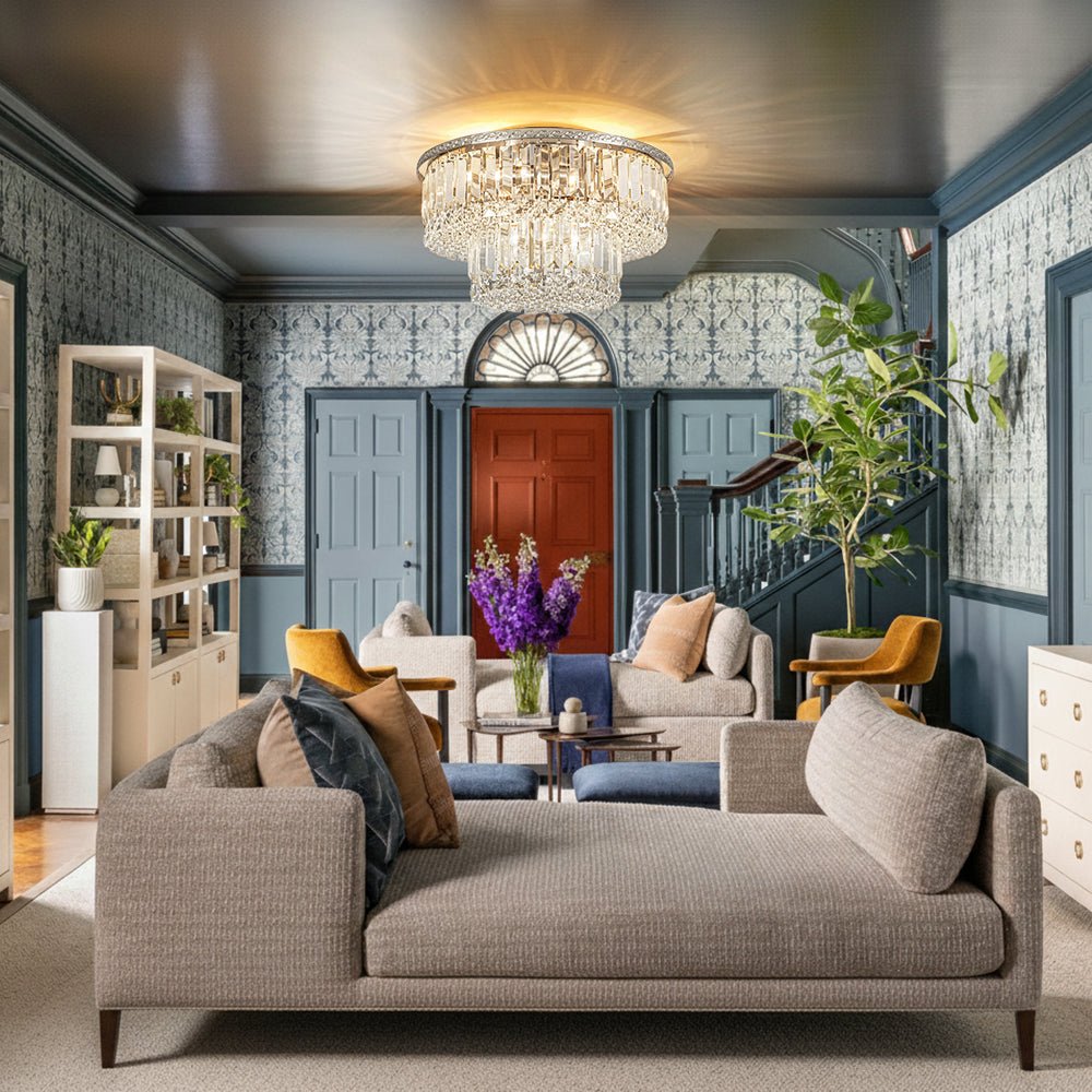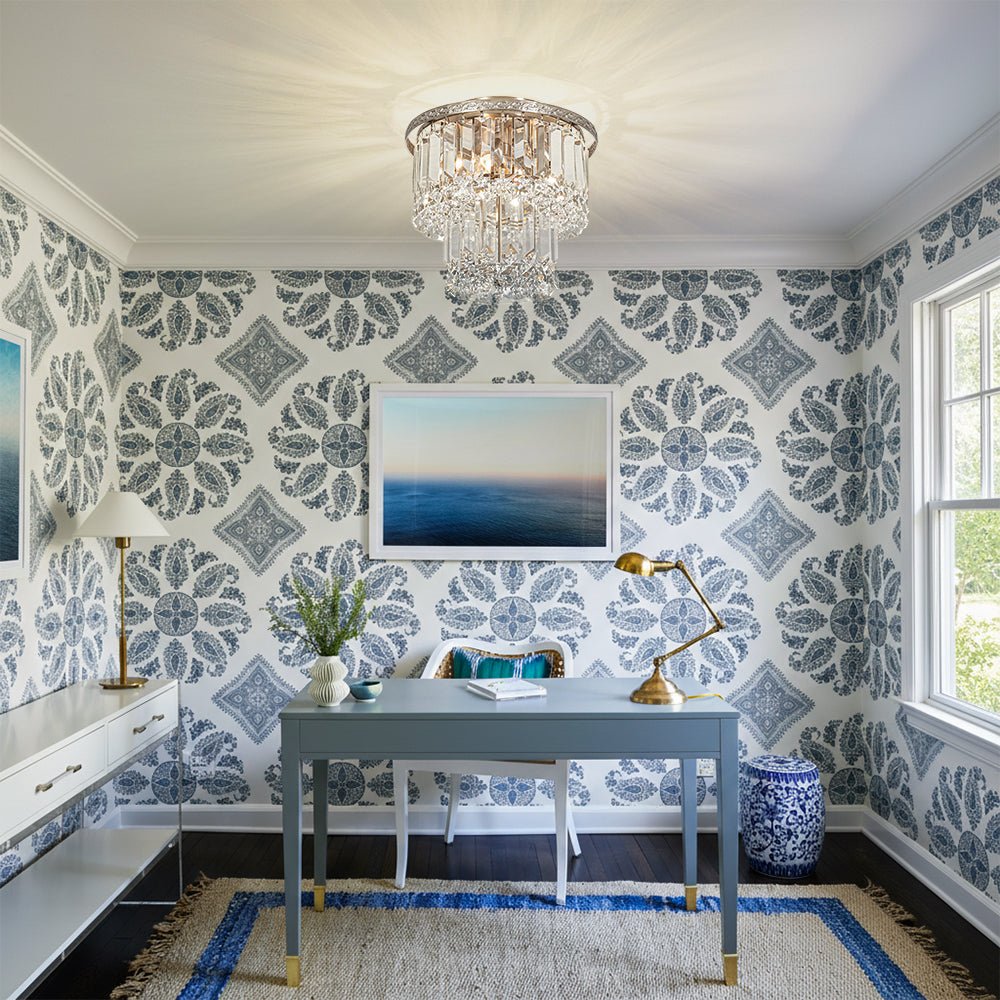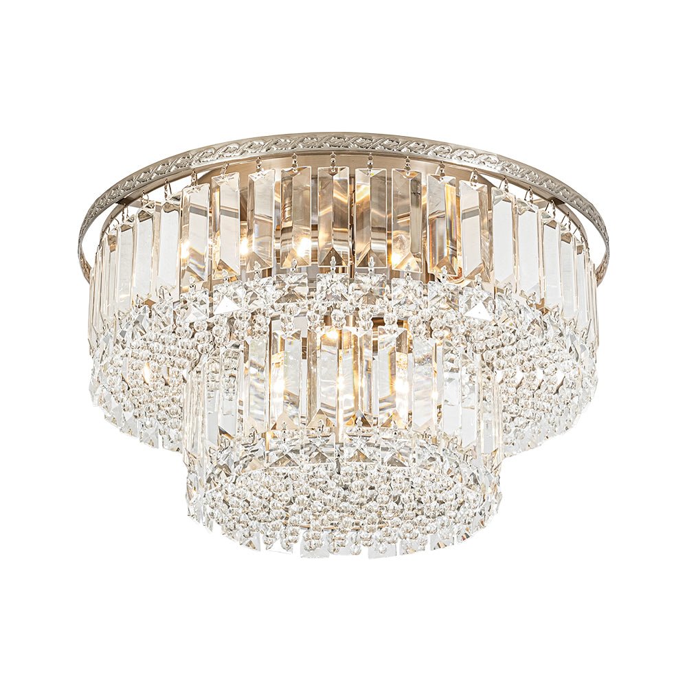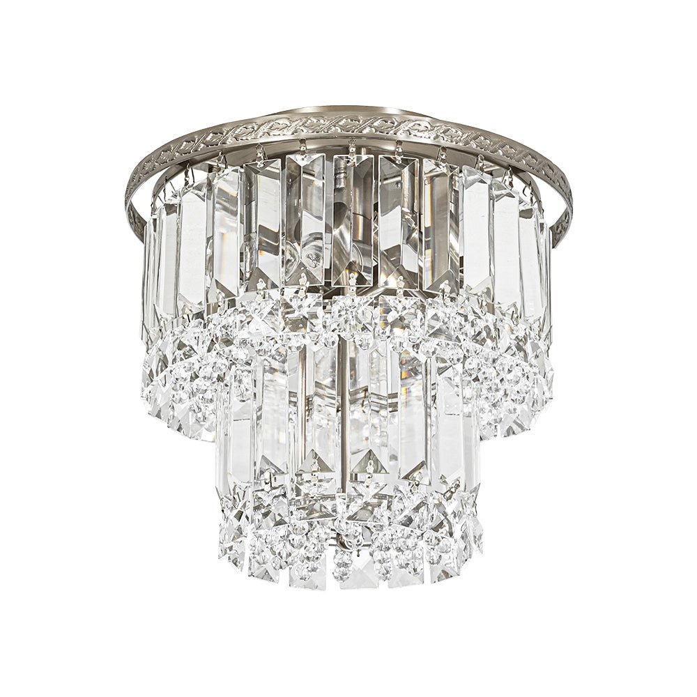 An opulent centerpiece crafted with delicate precision, our dazzling tiered crystal semi-flush chandelier radiates sparkling glamour without overwhelming the space. Featuring a 2-tier drum design, this round ceiling light showcases strands of clear faceted crystals that add dimensional elegance and shimmering refinement. The nickel metal frame features an intricate French botanical-inspired pattern, adding a touch of artisanal elegance and vintage charm to the design. When illuminated, the crystal halo scatters light beautifully, creating a sunburst effect on the ceiling and filling the room with a luxurious, romantic glow. Perfect for entryways, kitchen islands, dining rooms, bathrooms, or living areas, this 2-tier crystal drum semi-flush mount light brings timeless sophistication and luminous charm to any interior.