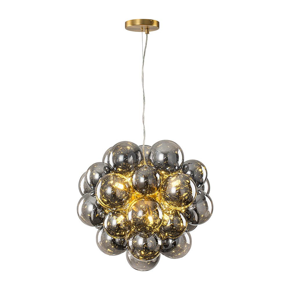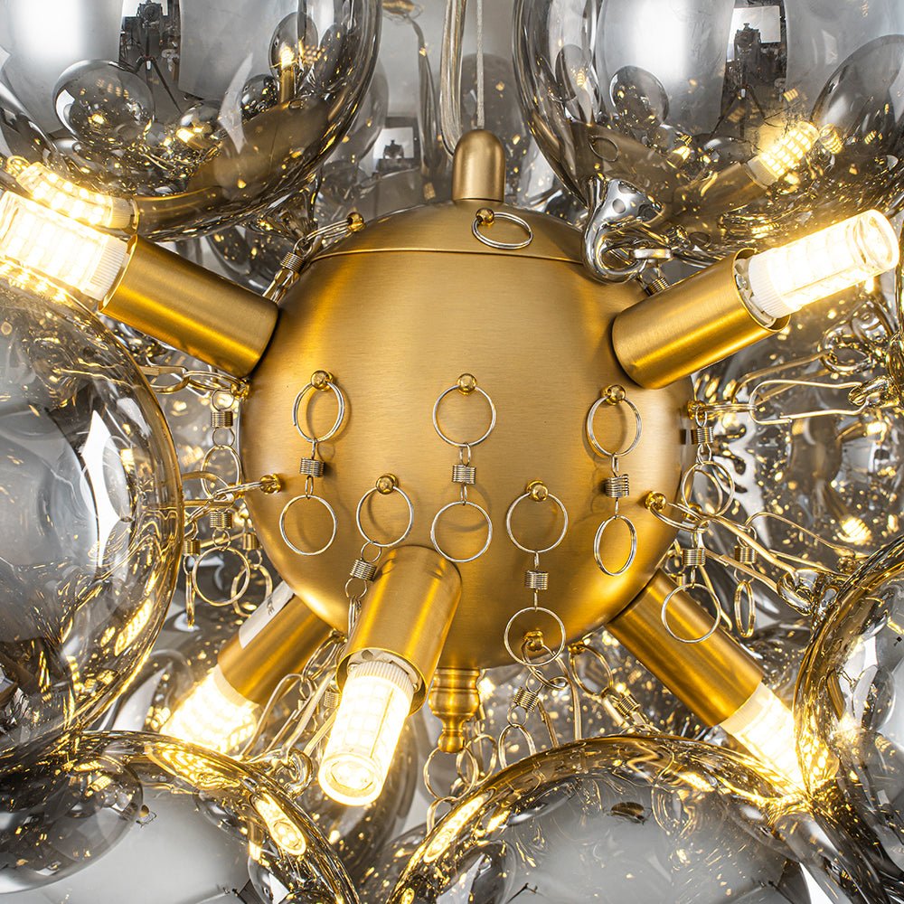 Revel in the whimsical charm and moody luxe aesthetics of this striking cluster glass globe dimmable chandelier. Drawing inspiration from classic Sputnik design, a sphere base crafted in a brushed brass finish, is surrounded by an array of smoked glass globes in varying sizes, evoking the look of dark, lustrous pearls suspended in air. The soft gray glass, finished with a subtle sheen, lends French-inspired sophistication and a touch of noir drama. When illuminated, the smoked globes gently diffuse the light, reducing glare while creating a rich, ambient glow with a dramatic layer of sparkle. Bold yet refined, this dimmable smoked glass bubble chandelier brings warmth and grandeur to entryways, dining rooms, bathrooms, living spaces, or bedrooms, transforming any interior into a curated statement of modern luxury.