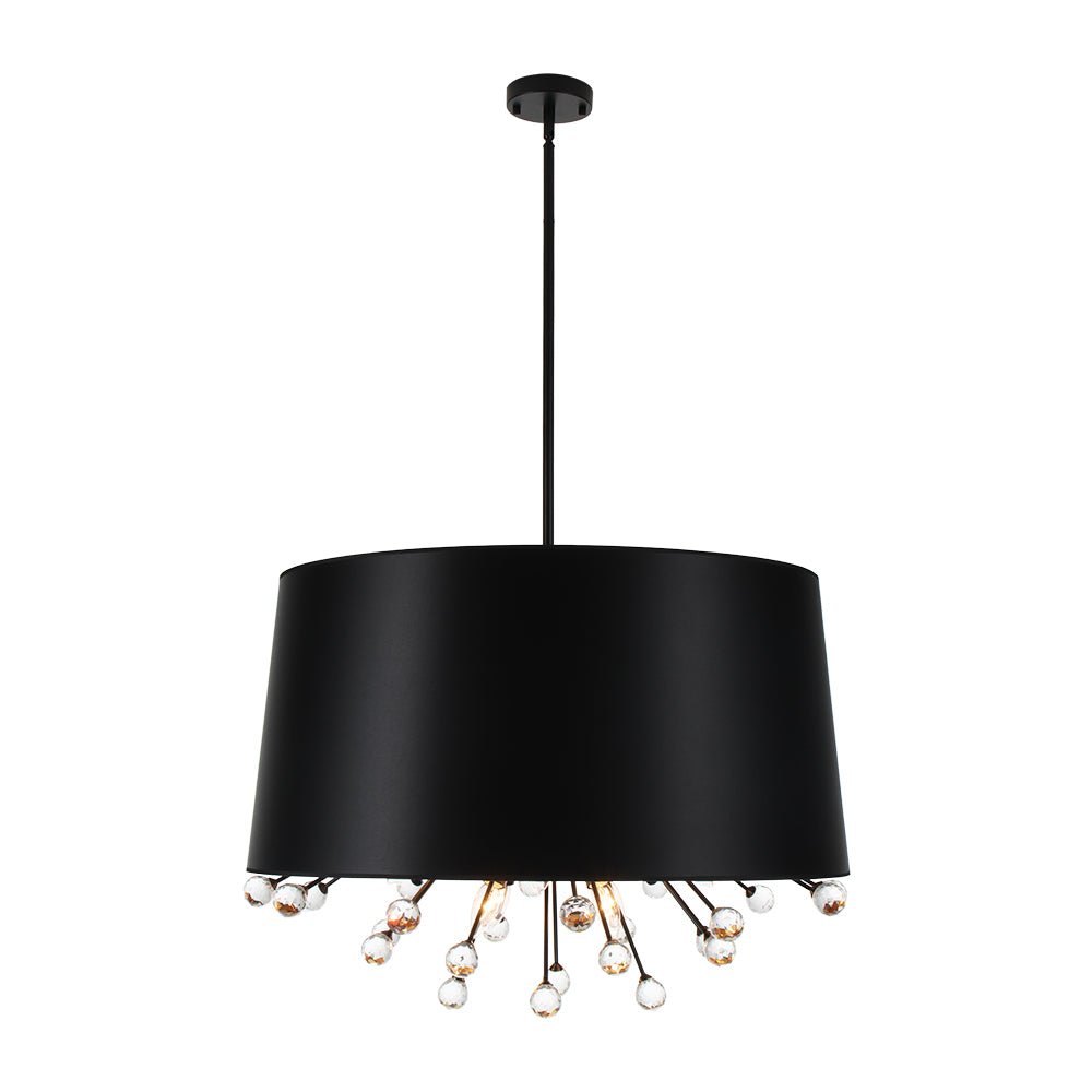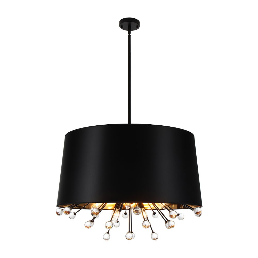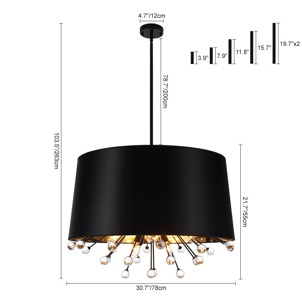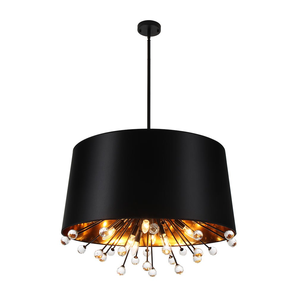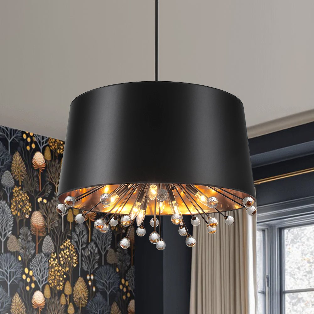 Exuding dramatic, moody luxe, this large fabric cage chandelier features a tapered black drum shade that beautifully contrasts with a gold tone interior, enhancing the warmth of its glow and adding depth to the design. Encased within the wide drum, the starburst-inspired crystal branches take center stage, creating refined drama while softening the overall visual impact. When illuminated, the clear faceted crystal balls refract light with a subtle sparkle, offering a star-like shimmer without overwhelming the space. Perfectly balancing glamour and sophistication, this crystal accented drum cage chandelier elevates any room—whether above a dining table for a warm, inviting glow, in a living room to anchor the ceiling, or in a bedroom or foyer to add refined ambiance and understated elegance.