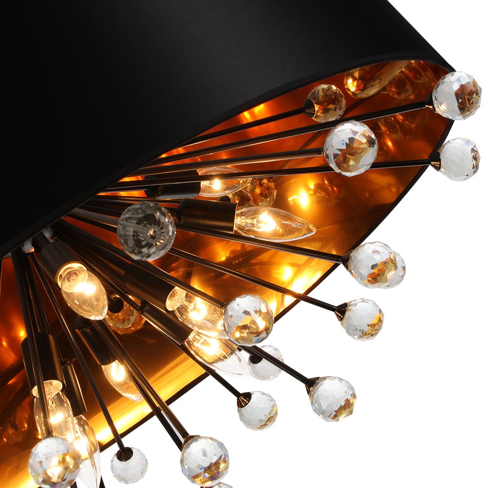 Twelve Lights • Wide Conical Design • Black Fabric Shade • Starburst Inspiration • Crystal Branches • Matte Black Exterior • Plate Gold Interior • E12 Candelabra Bulbs (Not Included) • Hardwired • ETL
