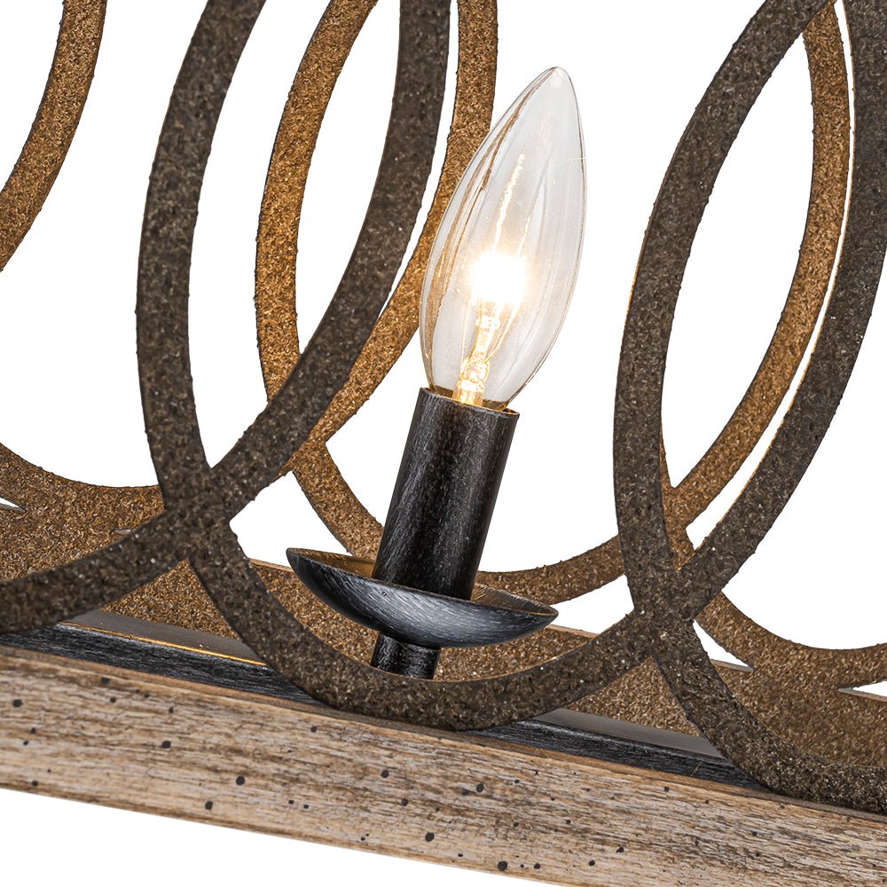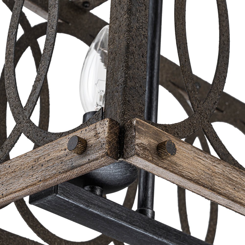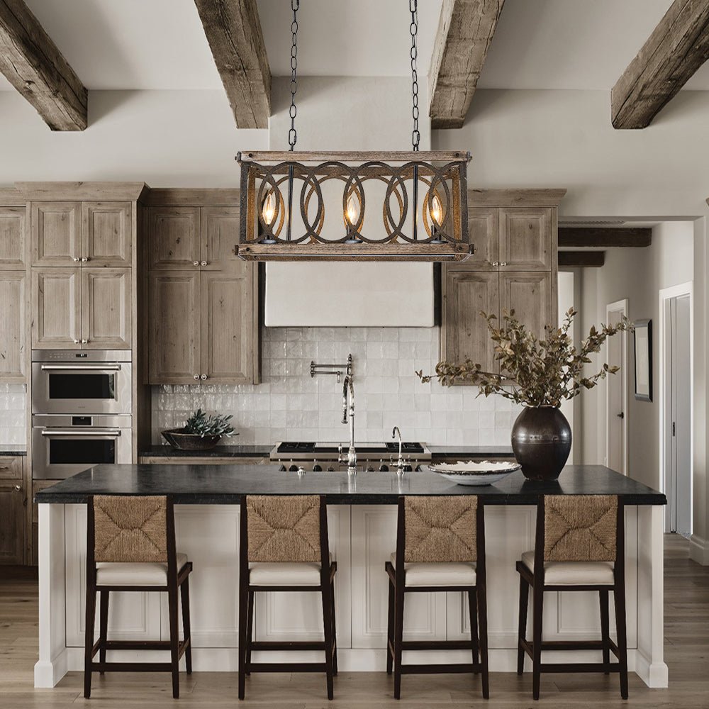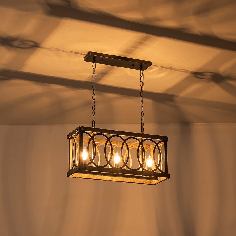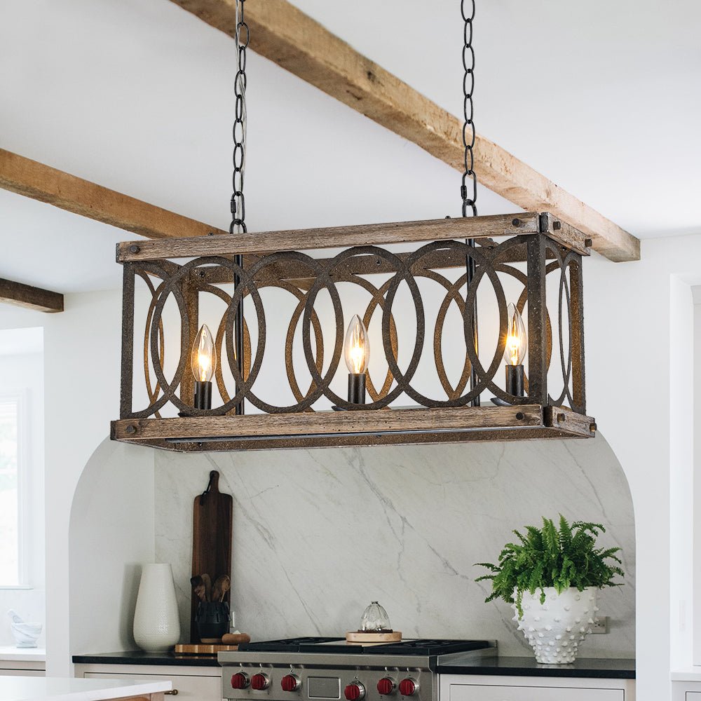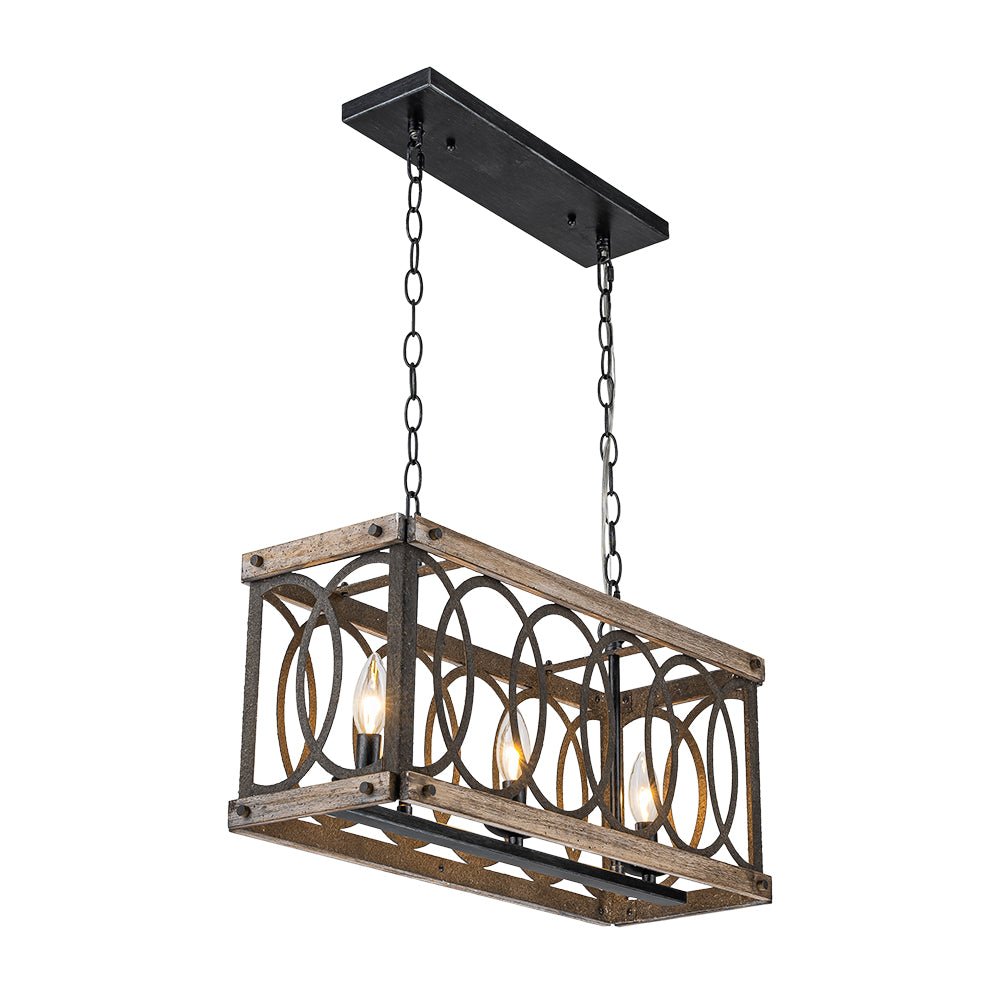 Constructed from aged poplar wood, this 3-light kitchen island pendant features an open rectangular cage highlighted by wide hollow metal rings on the sides, adding a geometric touch and a sense of dimensional elegance. The distressed rust-like finish lends vintage industrial charm, while the open design enhances its modern farmhouse style. Designed to hold three E12 candelabra bulbs (not included), this rectangular box linear chandelier offers both ample task lighting and a stylish focal point—ideal for brightening kitchen islands, dining areas, living rooms, or counters.