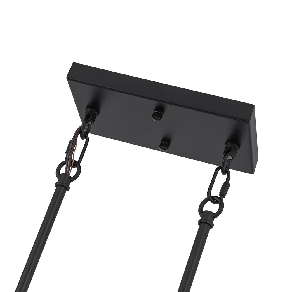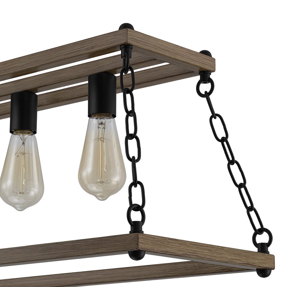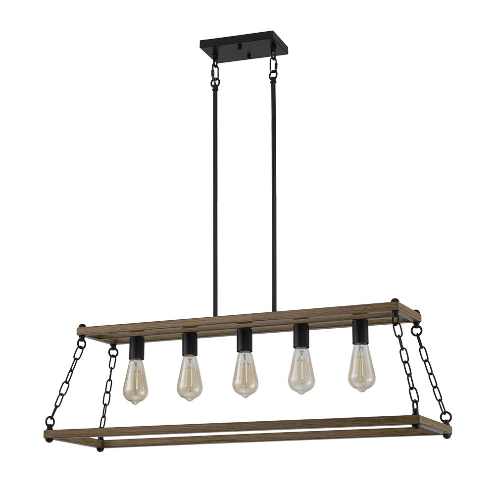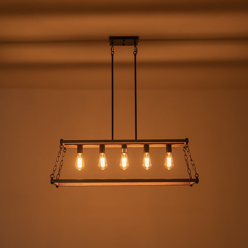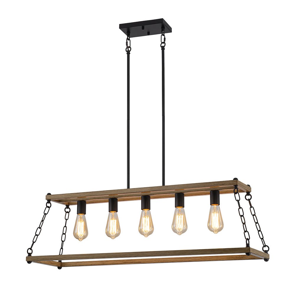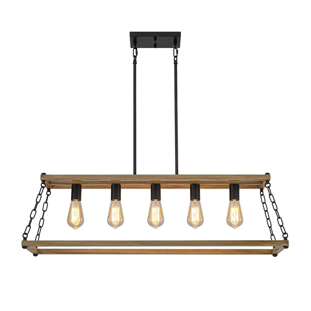 Perfect for industrial, minimalist lodge, rustic, and modern farmhouse interiors, this 5-light linear cage kitchen island pendant adds both style and functionality to your kitchen island, dining room, living room, home bar, or counter. Expertly crafted from durable iron, this linear chandelier features two faux wood rectangular frames in varying sizes, connected by chains to create an open trapezoid cage. Inside, five exposed E26-base bulbs (not included) deliver bright task lighting, making it a practical yet stylish addition to your space.