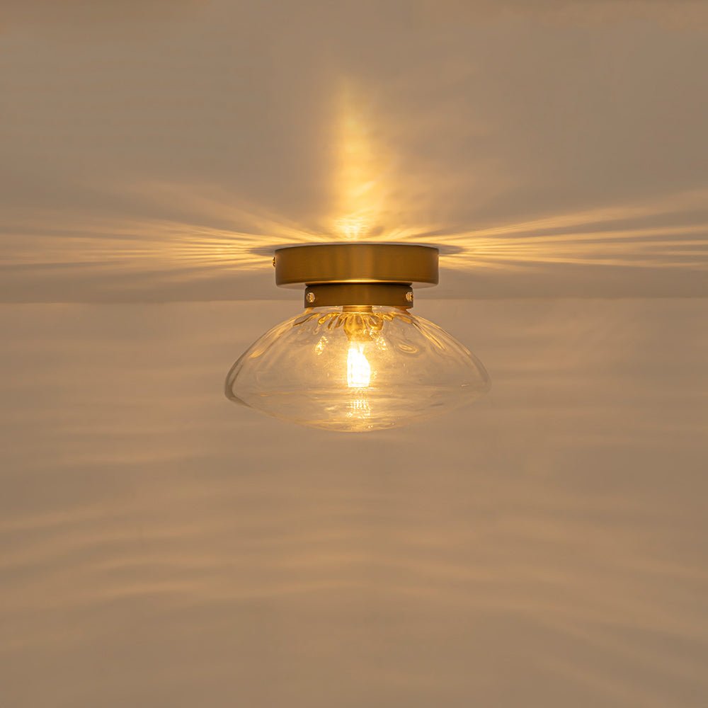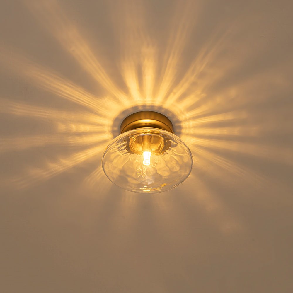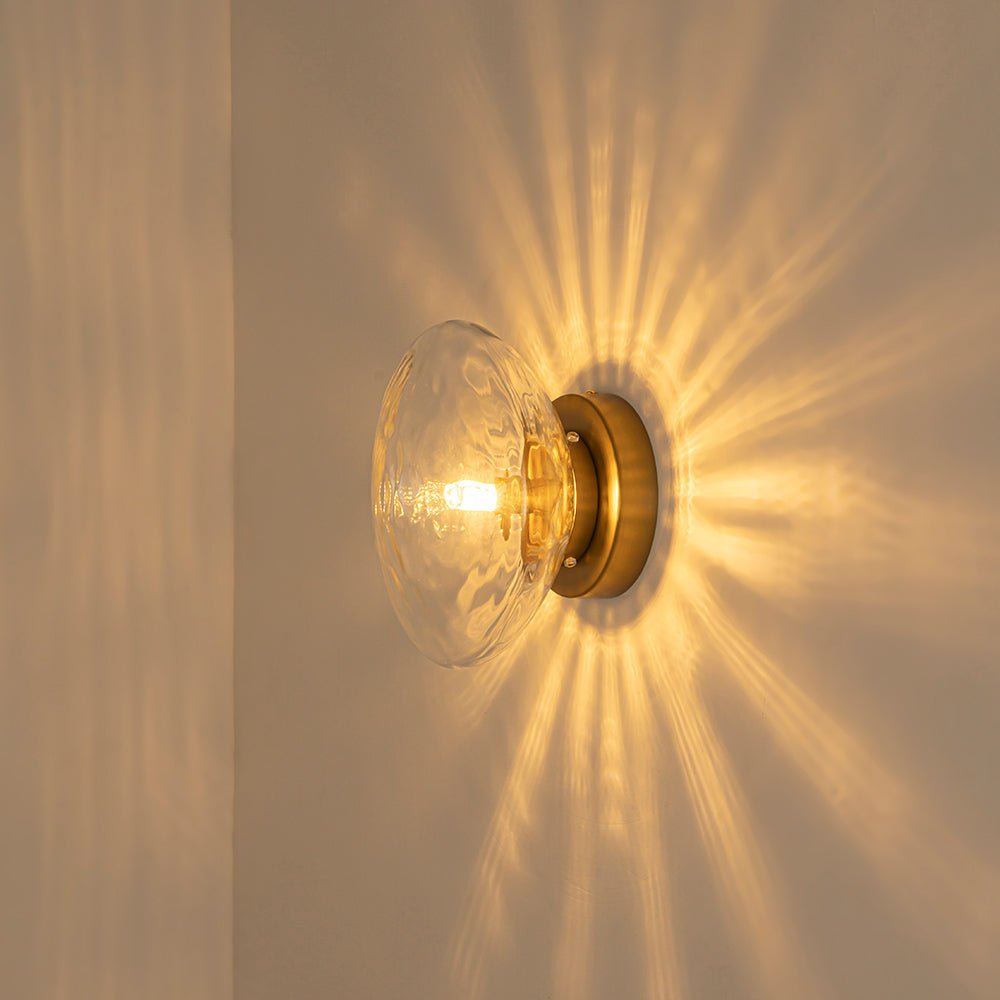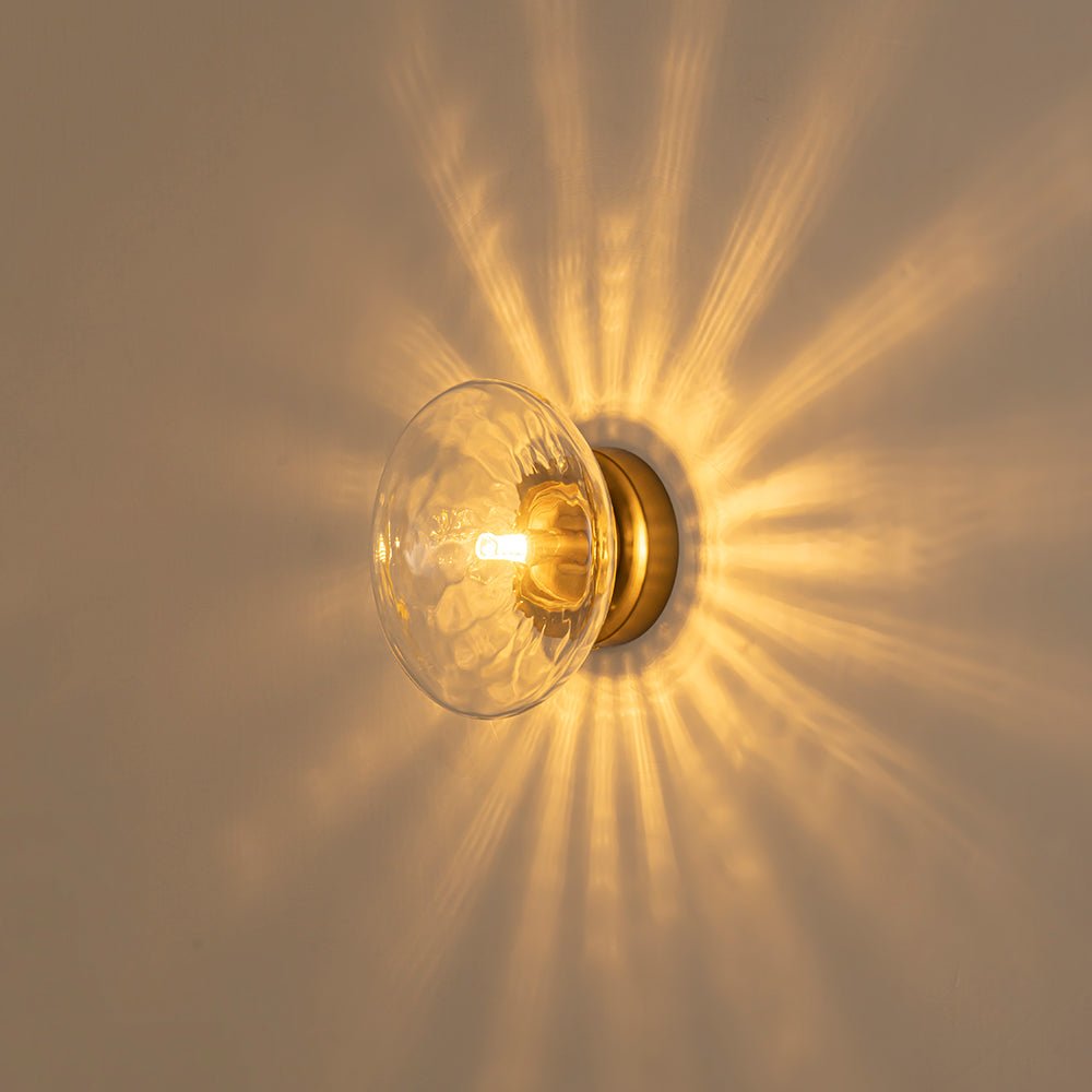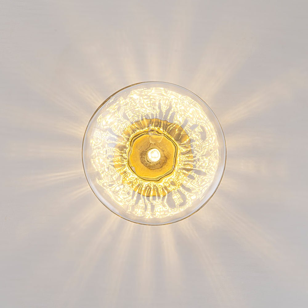 When illuminated, the textured glass beautifully diffuses the light, creating a radiant, sunburst-like glow that blooms across the wall or ceiling. A brushed brass finish adds warmth and a touch of mid-century modern sophistication, balancing sparkle with refined charm.