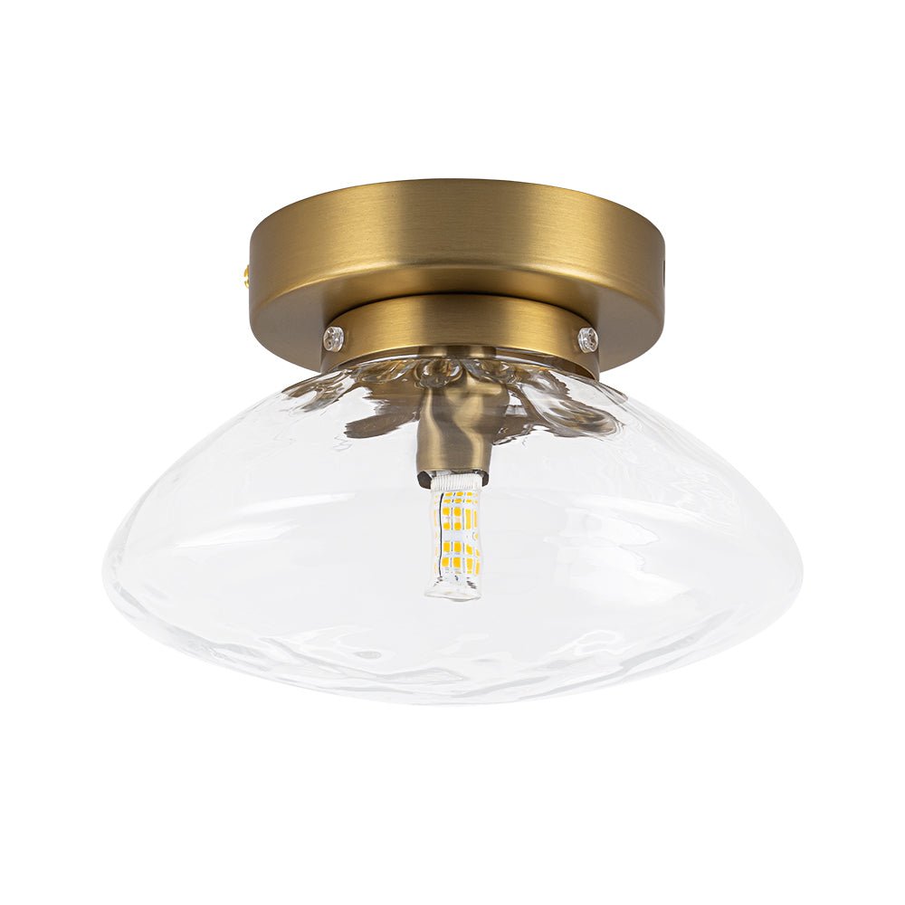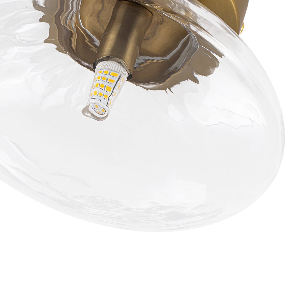 One Lights • Oval Ball Shape • Clear Water Glass • Brushed Brass • Semi Flush Mount • Vanity Wall Lamp • G9 Bulbs (Not Included) • Hardwired • UL Listed/ETL