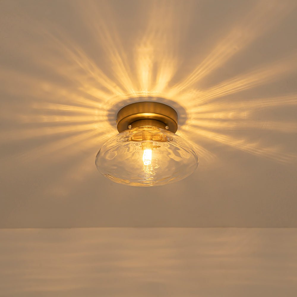 Designed for both ceiling and wall mounting, this versatile glass globe light fixture showcases a simple yet glamorous silhouette. The oval globe is crafted from clear water glass with gently rippled, hammered textures that introduce soft movement and subtle dimension while maintaining clean, elegant lines.