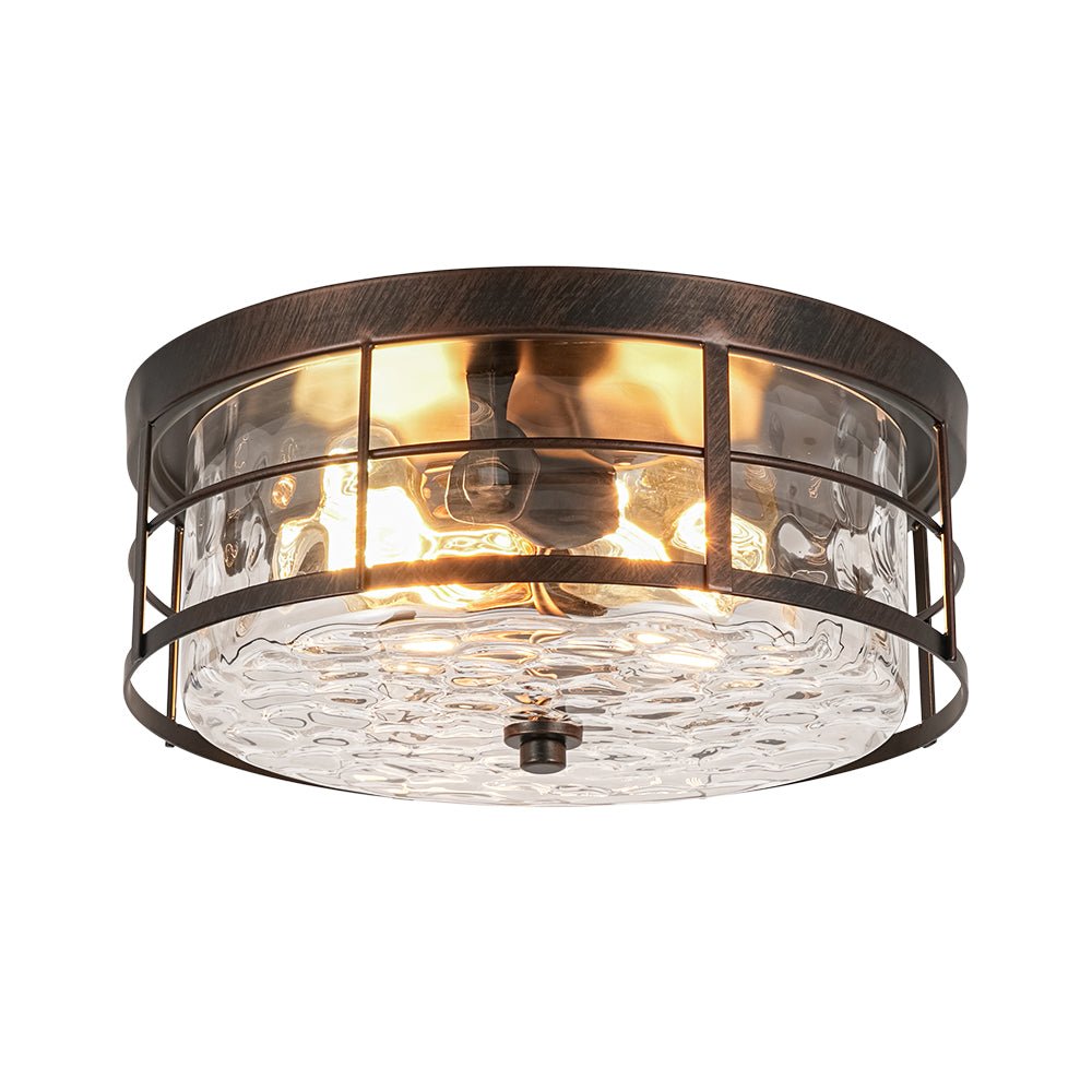 Bring timeless charm and dependable everyday lighting to your space with this 2-light round glass flush mount fixture. Finished in oil-rubbed bronze with a brushed texture, the fixture strikes a perfect balance between industrial ruggedness and vintage elegance, making it a versatile accent for both modern farmhouse and transitional interiors.