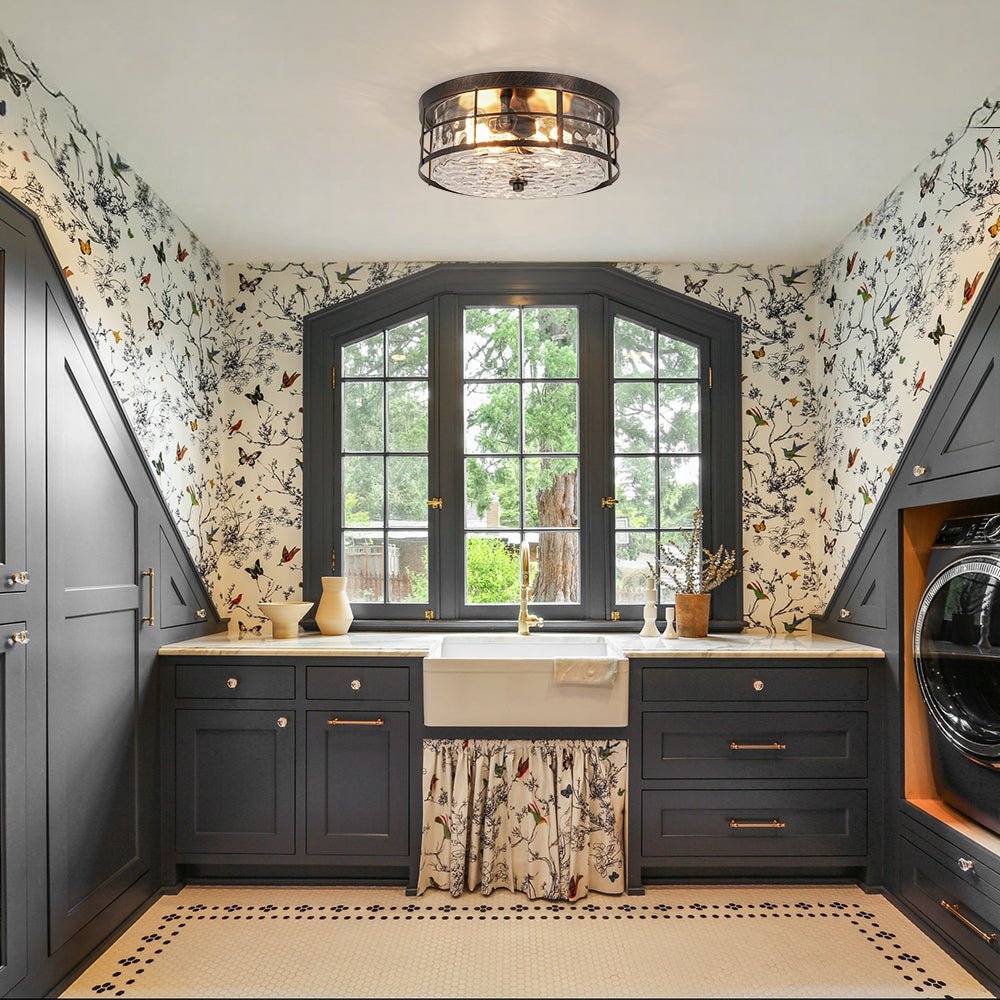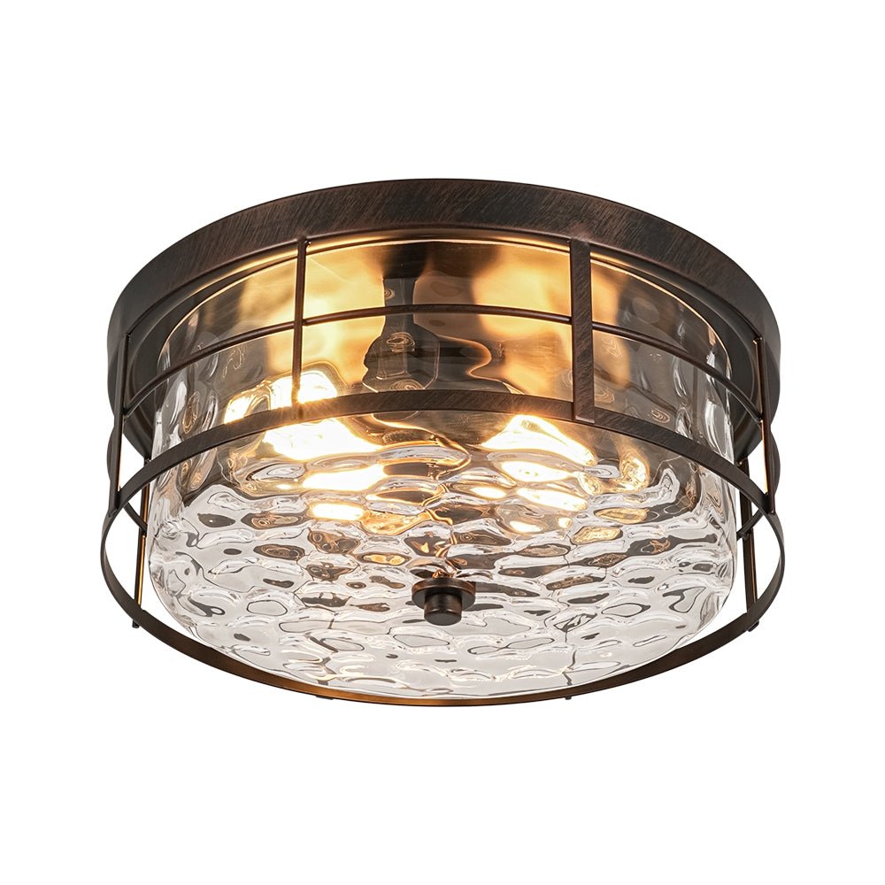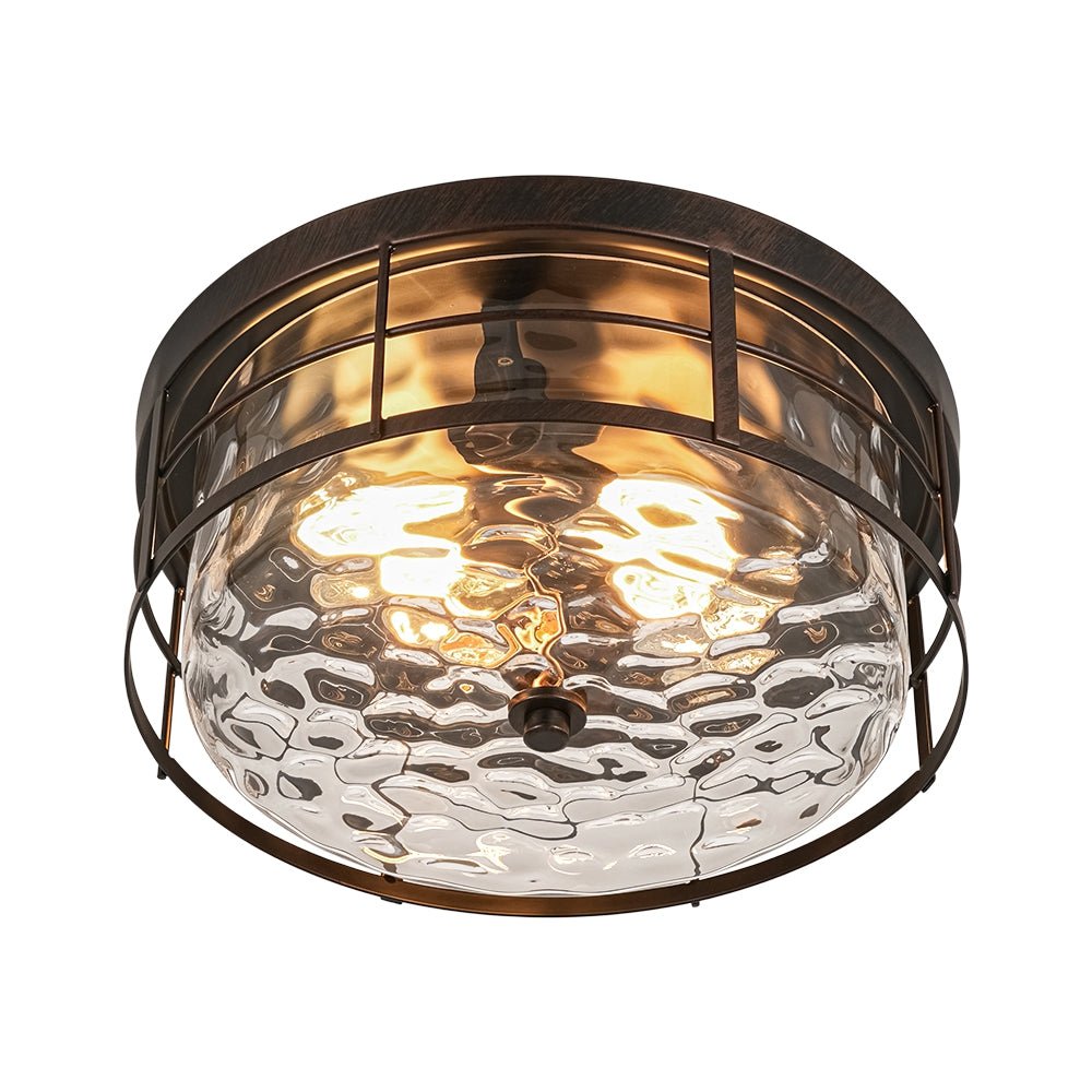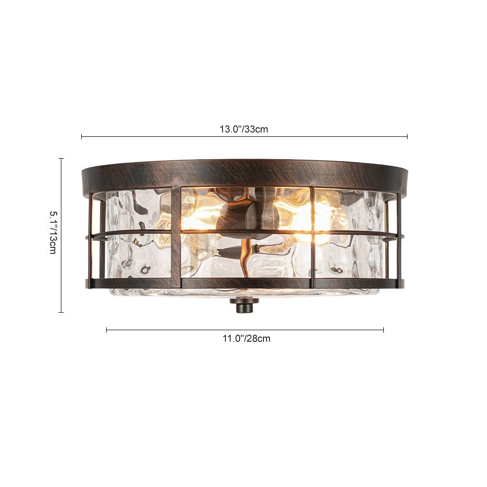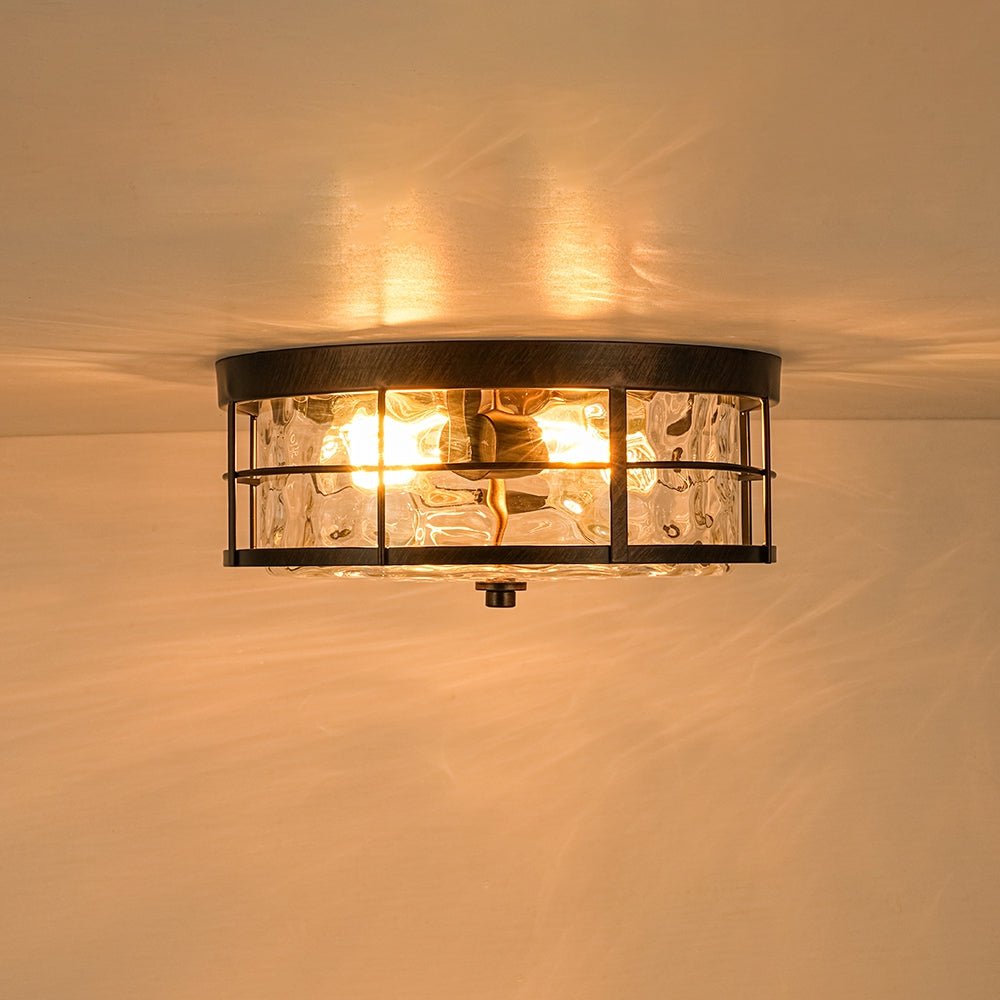 The design features a wide drum silhouette with a distinctive two-layer structure. An open iron grate-like outer frame surrounds a clear hammered glass inner shade, creating striking dimensional depth and architectural interest. The textured glass produces a beautiful water-ripple effect that becomes especially captivating when illuminated. Both decorative and practical, this hammered glass flush mount light is ideal for entryways, kitchens, bedrooms, hallways, bathrooms, stairwells, or living areas.