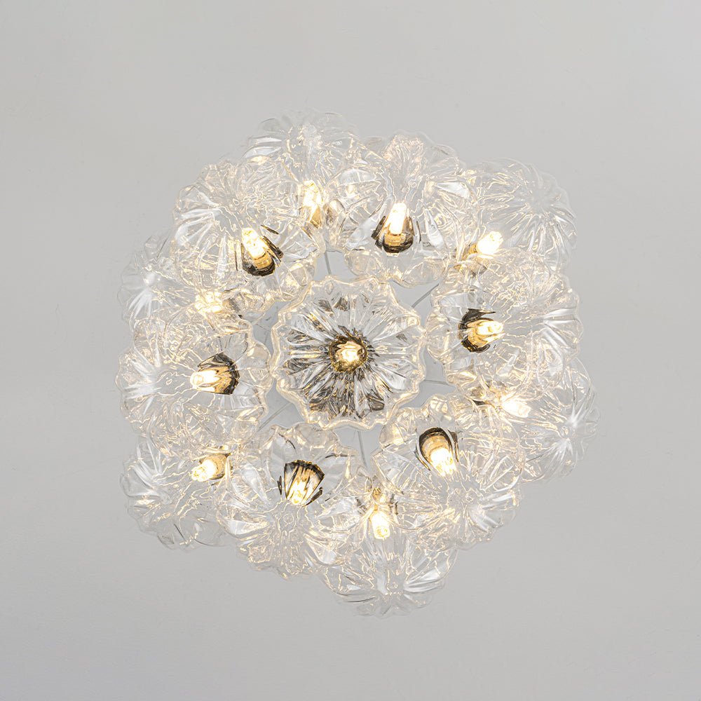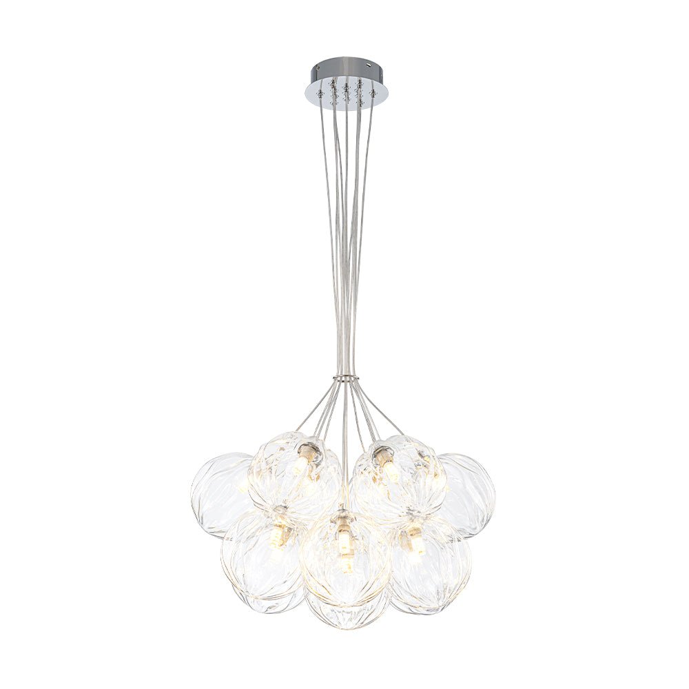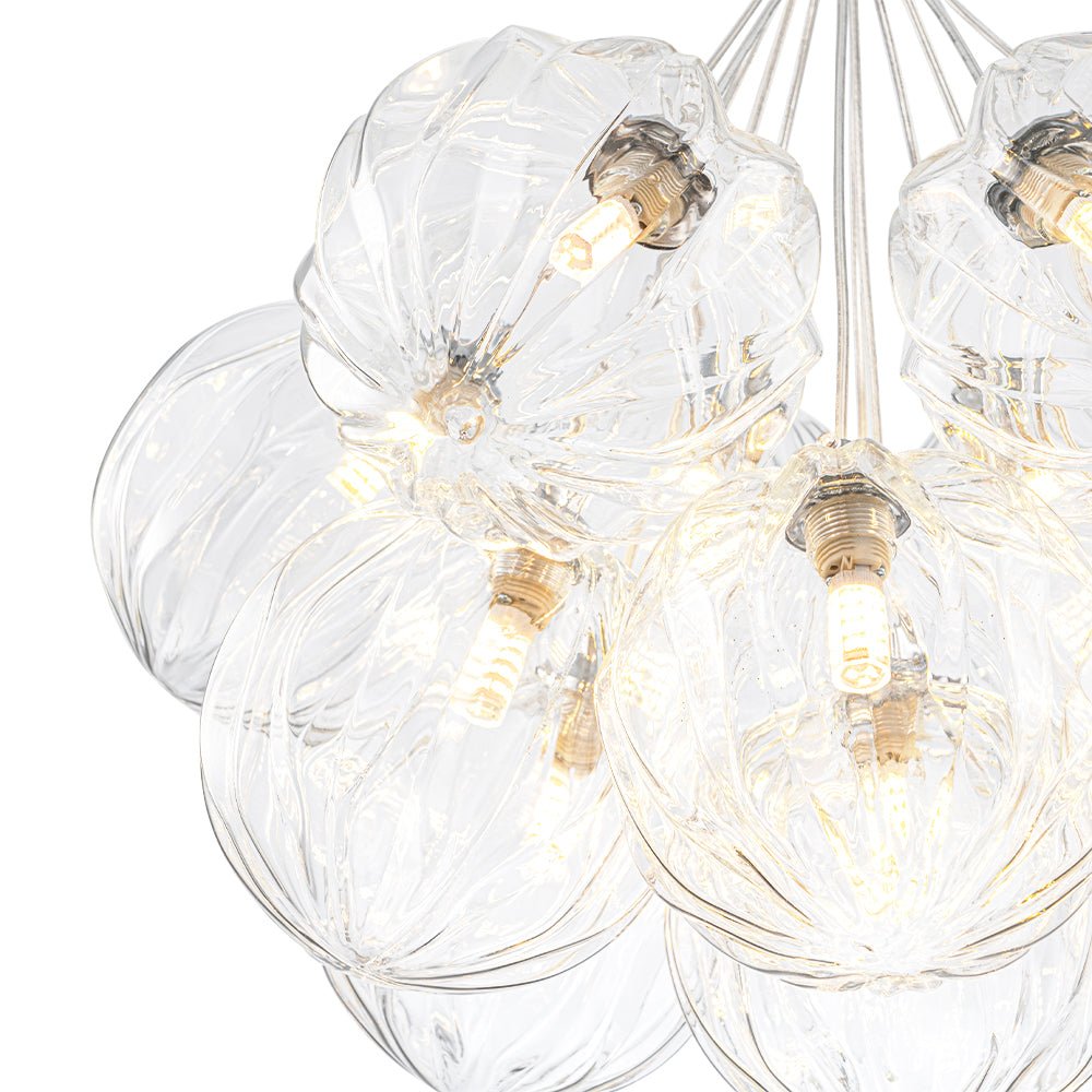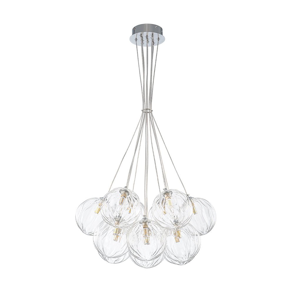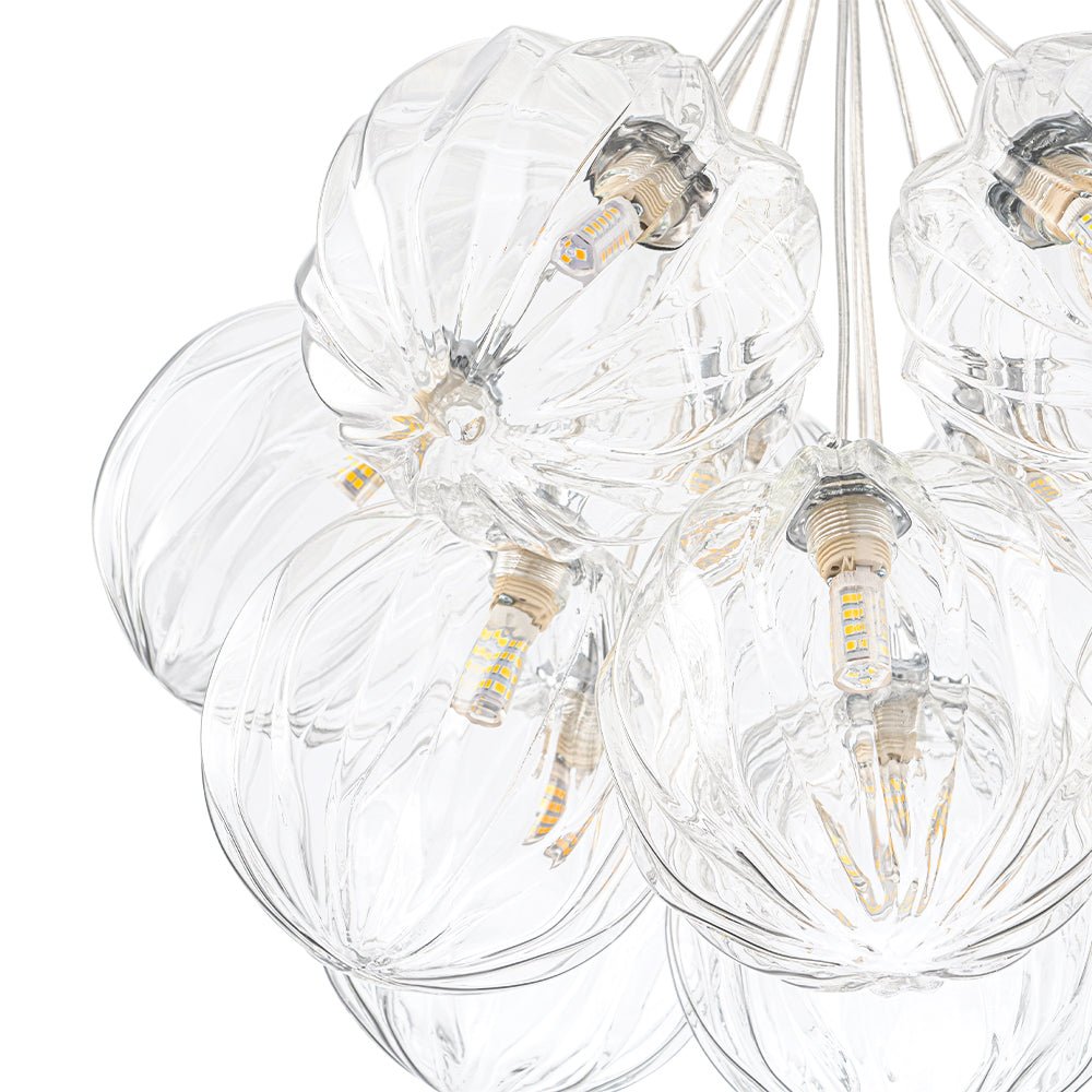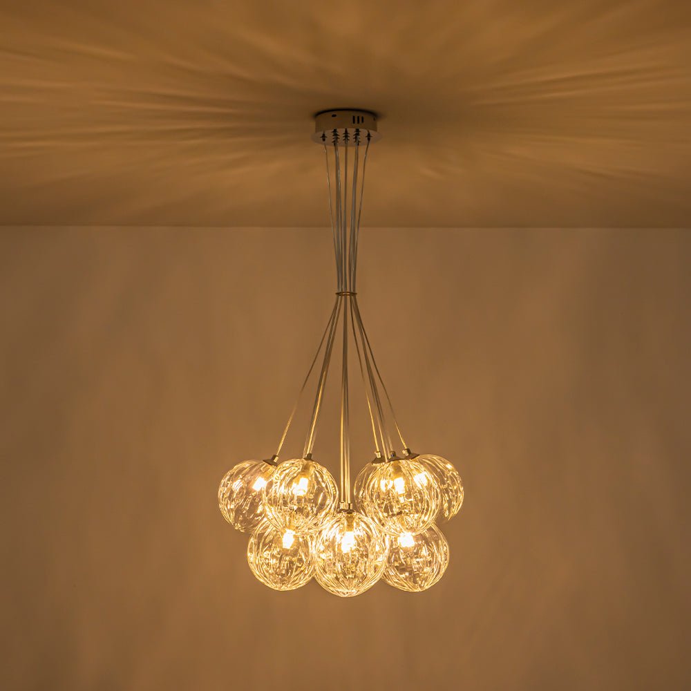 This cluster glass globe pendant light is a sculptural statement that elevates any space with modern artistry. Thirteen delicately textured glass globes gather together like a bouquet in bloom, their carved textures catching and reflecting the light with effortless elegance. When illuminated, each globe diffuses a warm radiance that flows gracefully through its curves, casting a mesmerizing glow. Perfect for living rooms, dining areas, bedrooms, foyers, or entryways, this textured glass bubble chandelier adds both sophistication and a touch of whimsical charm.